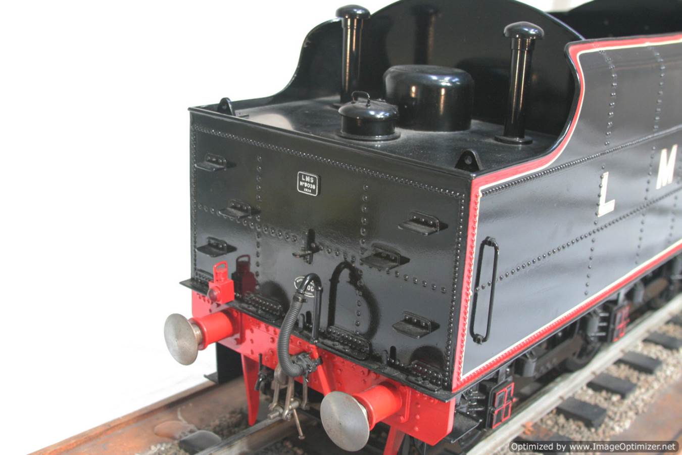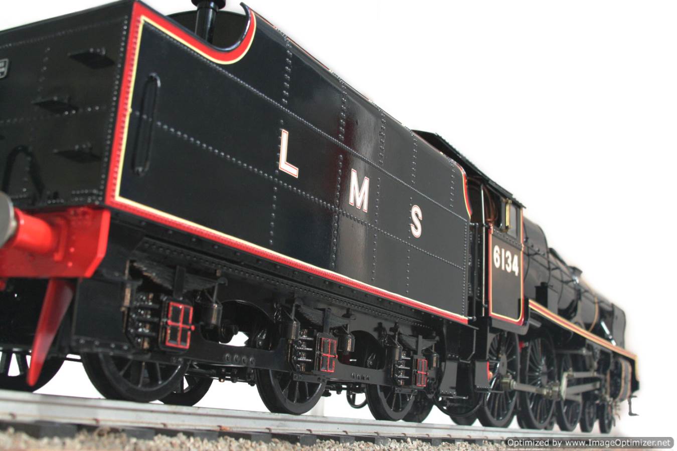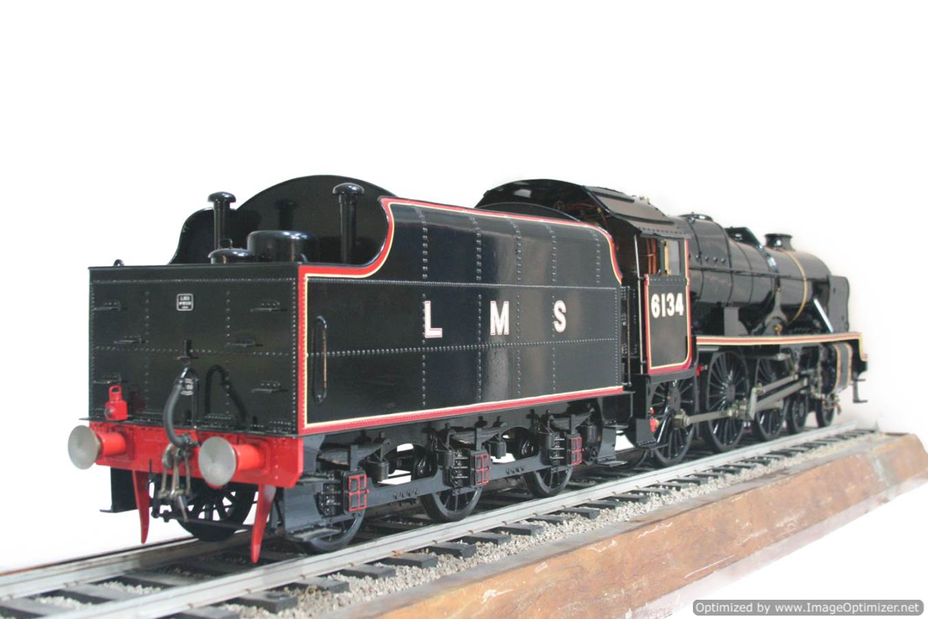 Here we have another lovely and pretty rare model. A Brand new and unsteamed 5" full 3 cylinder LMS Stanier Rebuillt Royal Scott, 6134 'The Cheshire Regiment'. She's in lined LMS Black livery and has been built to the Martin Evans 'King's Own' design, this is an exceptionally neatly made model from the workshop of an experienced model engineer. We've seen a few of these made, but they mostly seem to be the simpler 2 cylinder versions rather than the fully authentic 3 cylinder machines. The model was made as a runner, and as such has a straight martin Evans backhead rather than a more scale detailed affair, but ultimately the builder decided to keep the model in as new, un-fired condition on a plinth in his dining room whilst running all his other models instead.