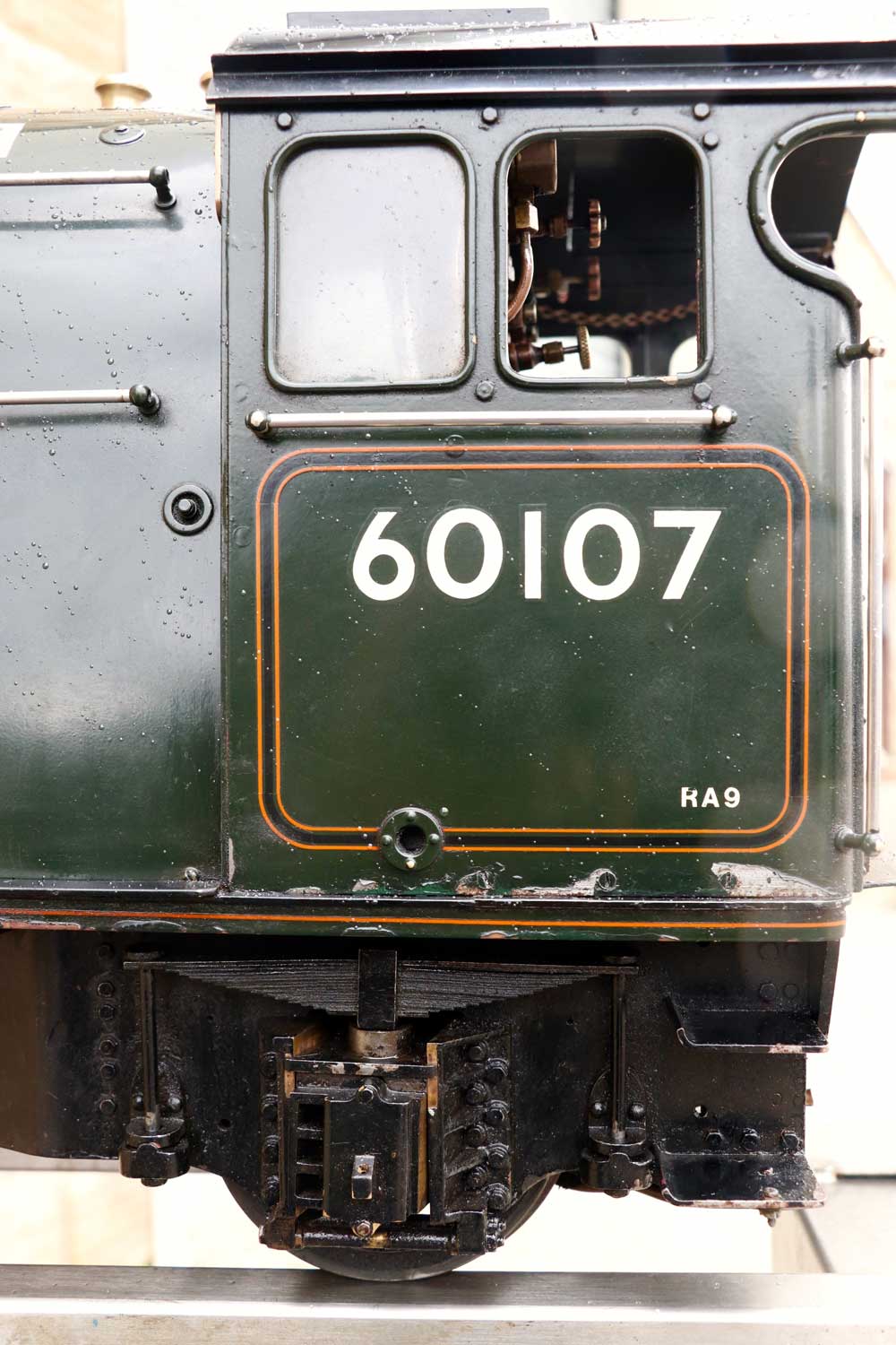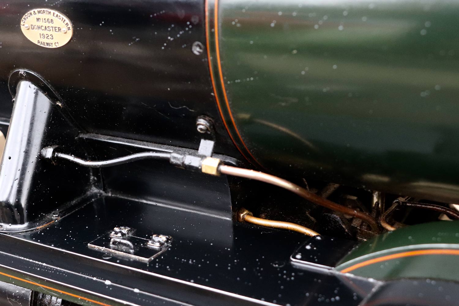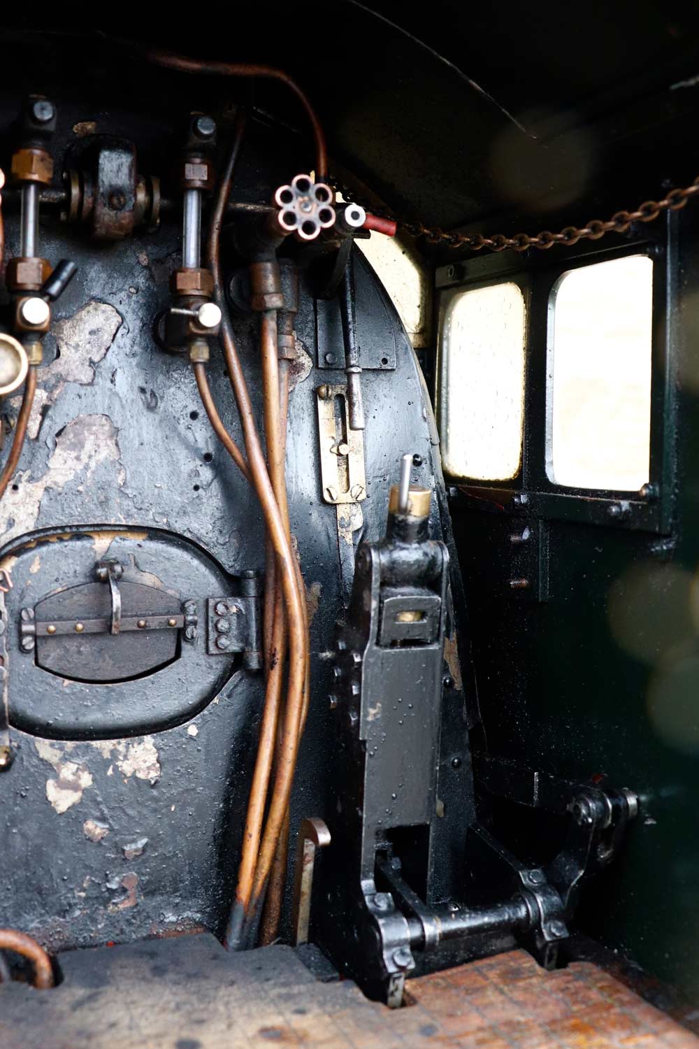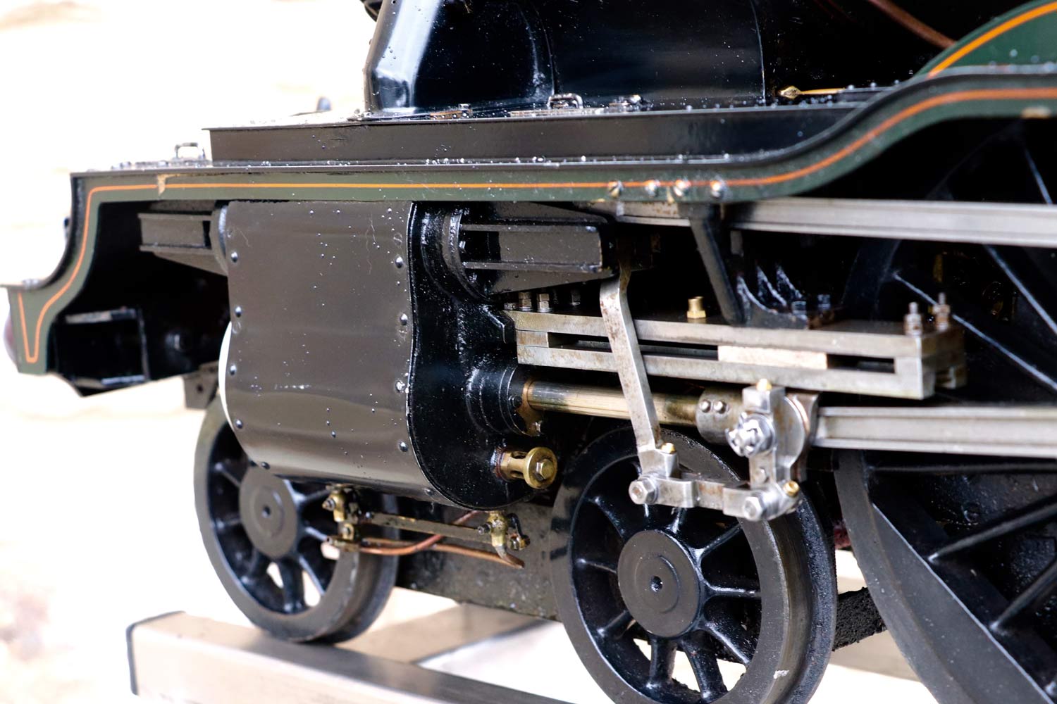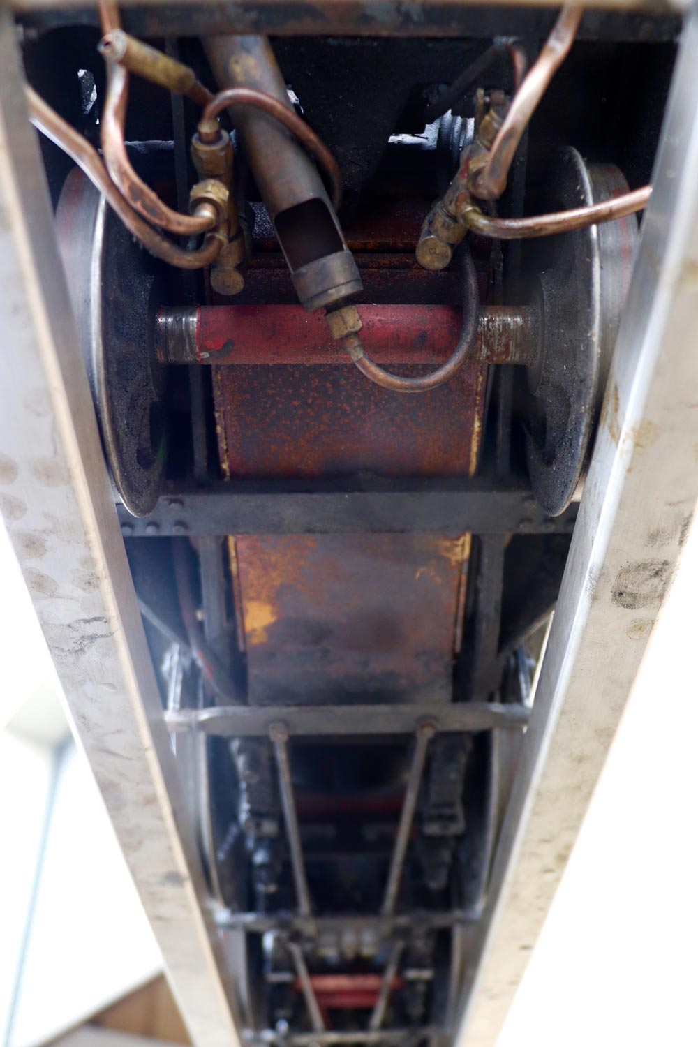 Mechanically as you've no doubt just read, she will be refreshed and ready to go, and the machining work done by the builder is lovely, crisp and neat. The running boards have little trap doors in them for oiling the motion from the top, and they drop closed with that reassuring 'pop' that you only get with a model where the builder knew how to make things properly! The boiler is of course copper and silver soldered, comes with a large wedge of old certificates back to the original date of construction which was 1990. She can of course come with fresh certificates and will be tested and ready to hit the rails.