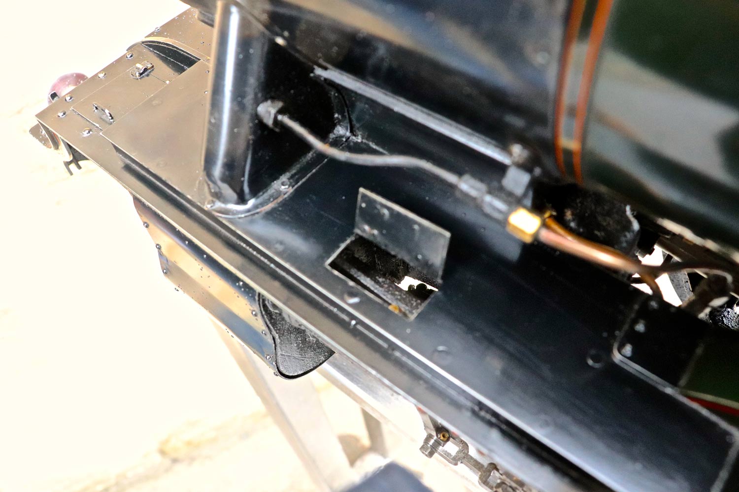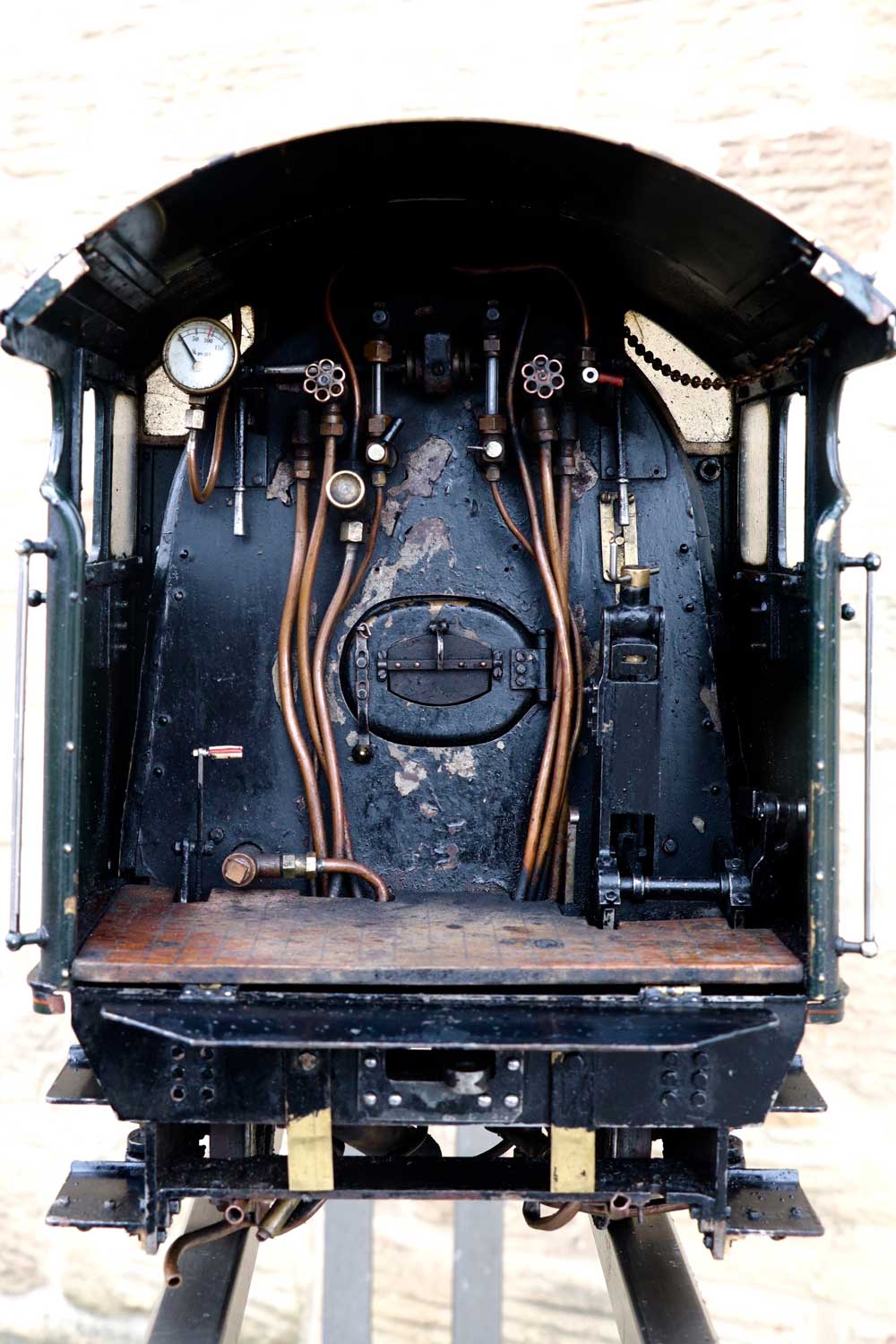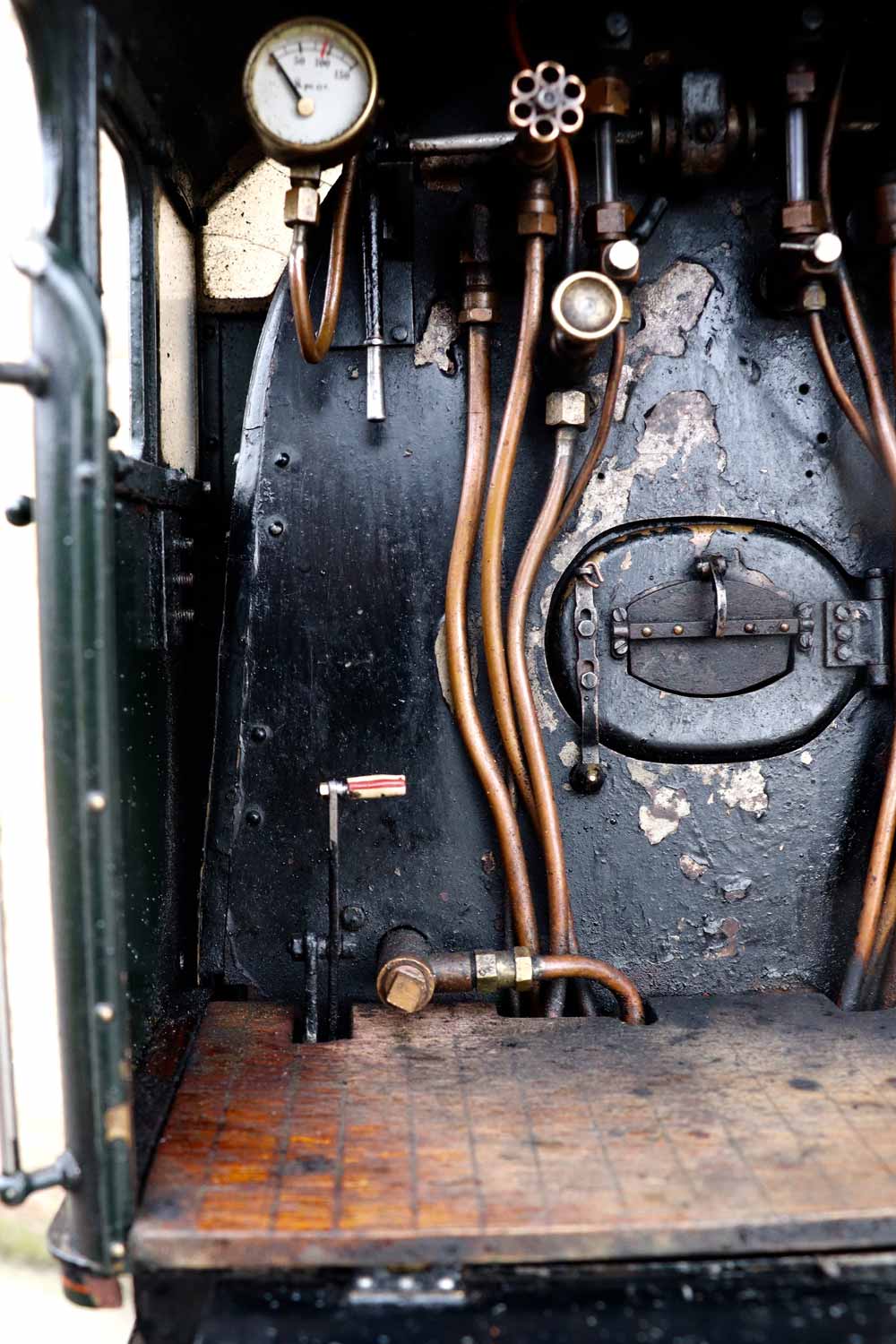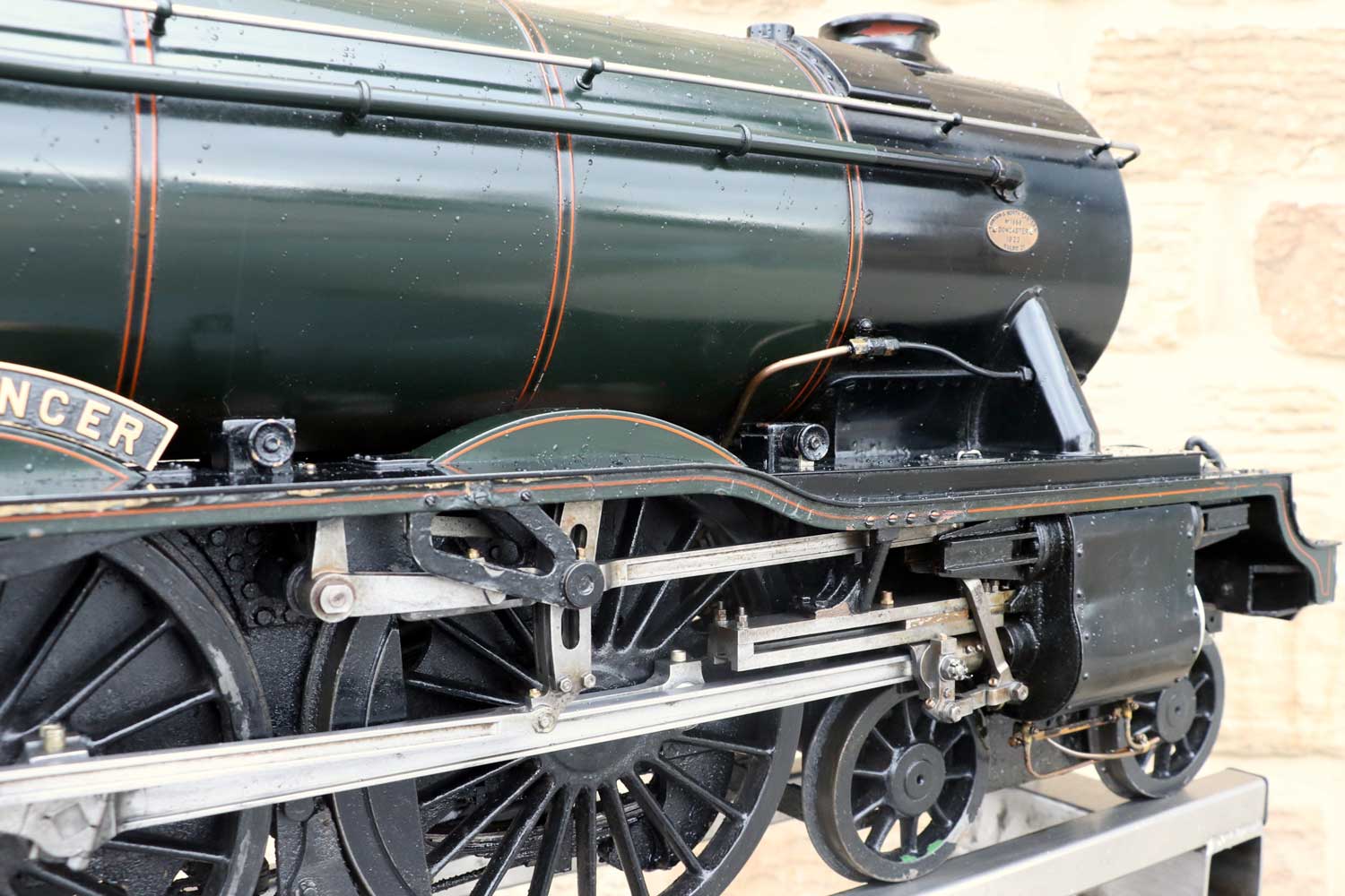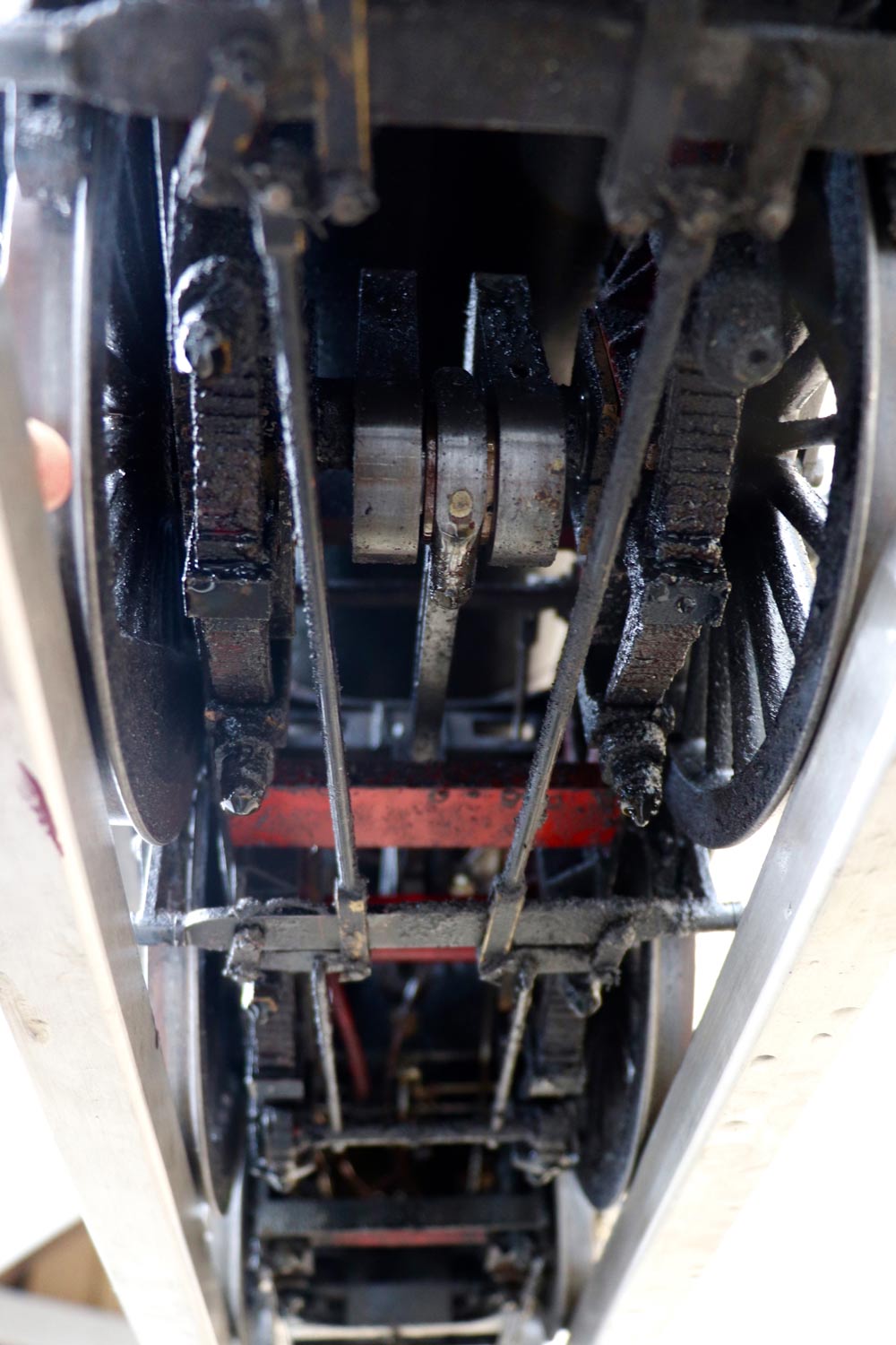Mechanically as you've no doubt just read, she will be refreshed and ready to go, and the machining work done by the builder is lovely, crisp and neat. The running boards have little trap doors in them for oiling the motion from the top, and they drop closed with that reassuring 'pop' that you only get with a model where the builder knew how to make things properly! The boiler is of course copper and silver soldered, comes with a large wedge of old certificates back to the original date of construction which was 1990. She can of course come with fresh certificates and will be tested and ready to hit the rails.