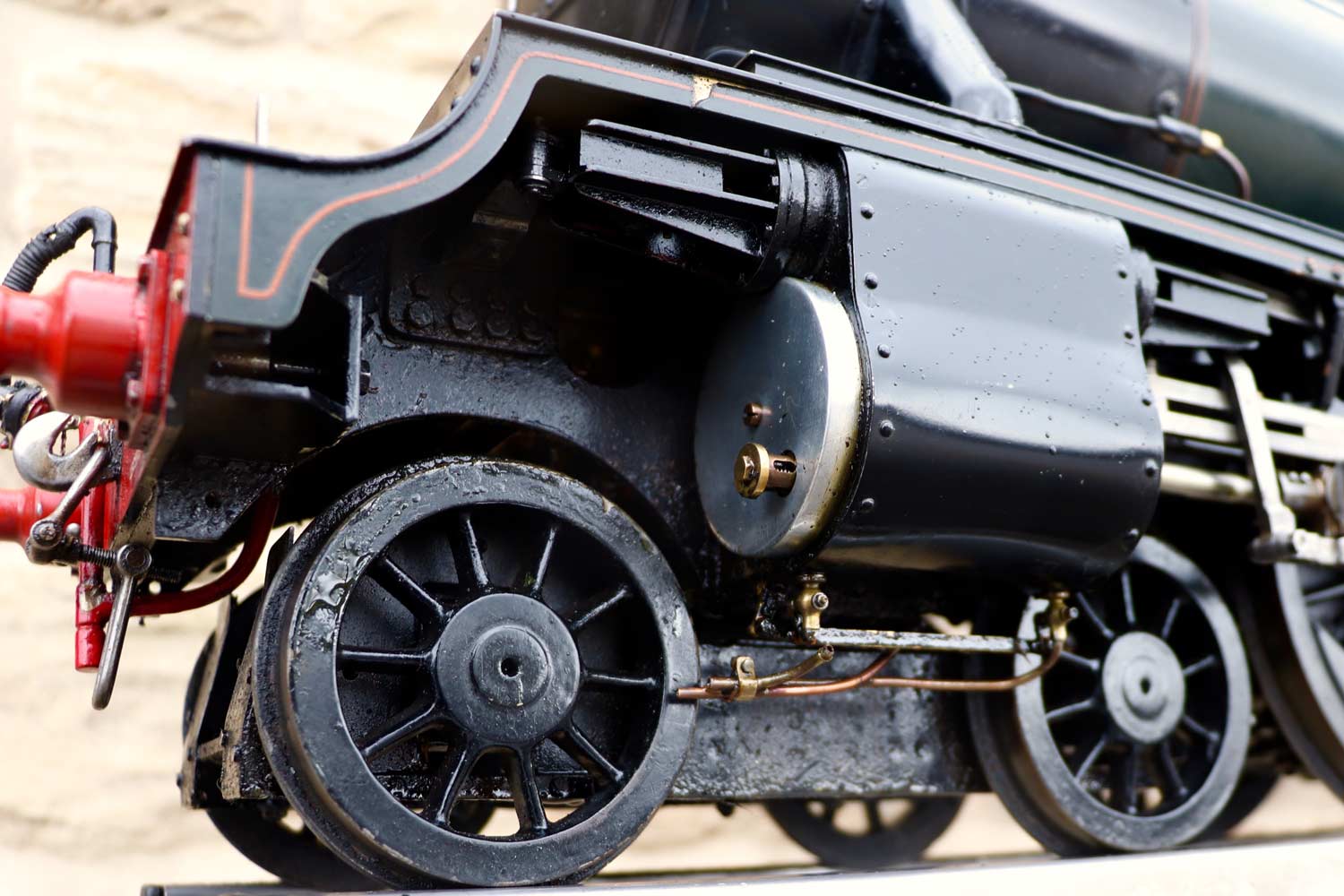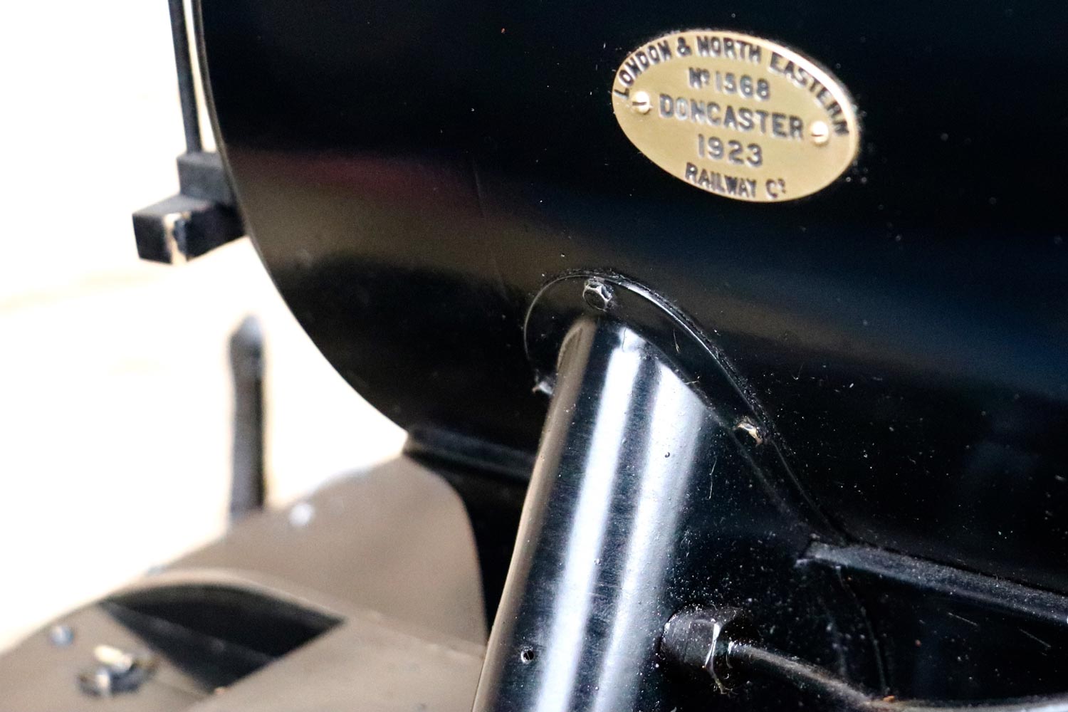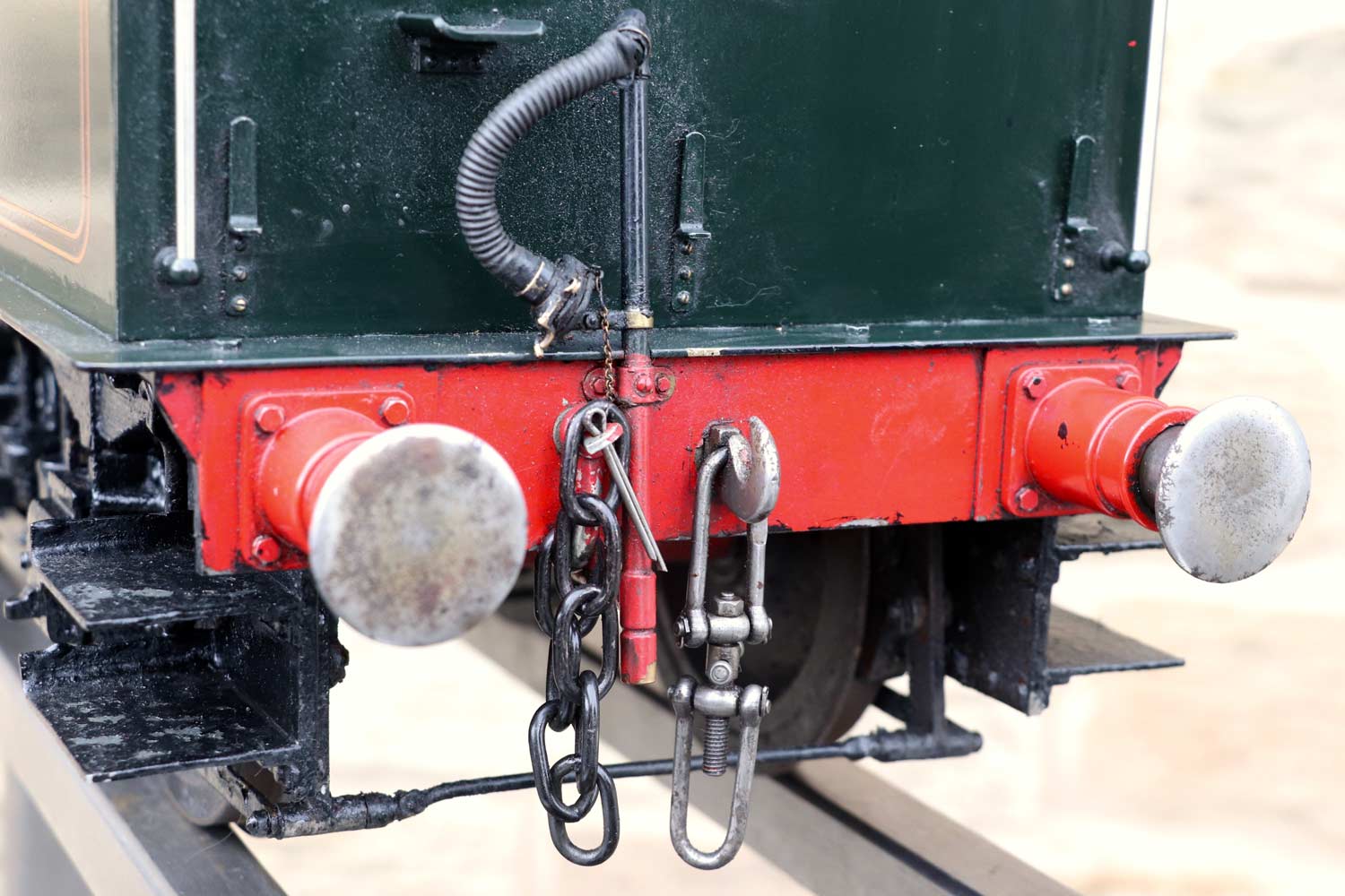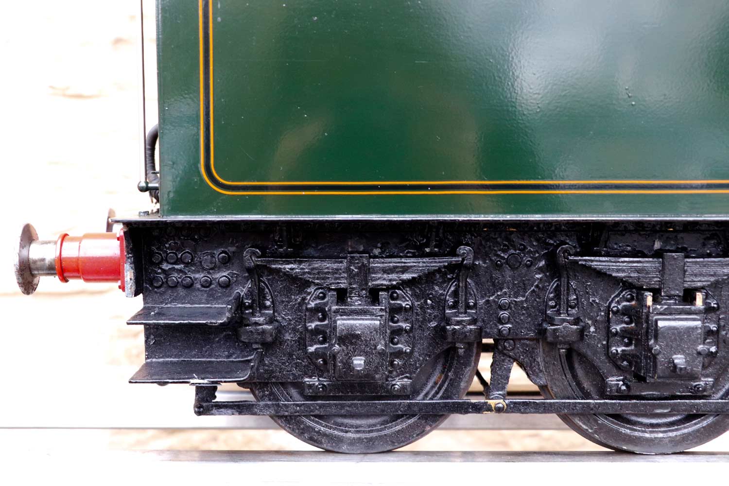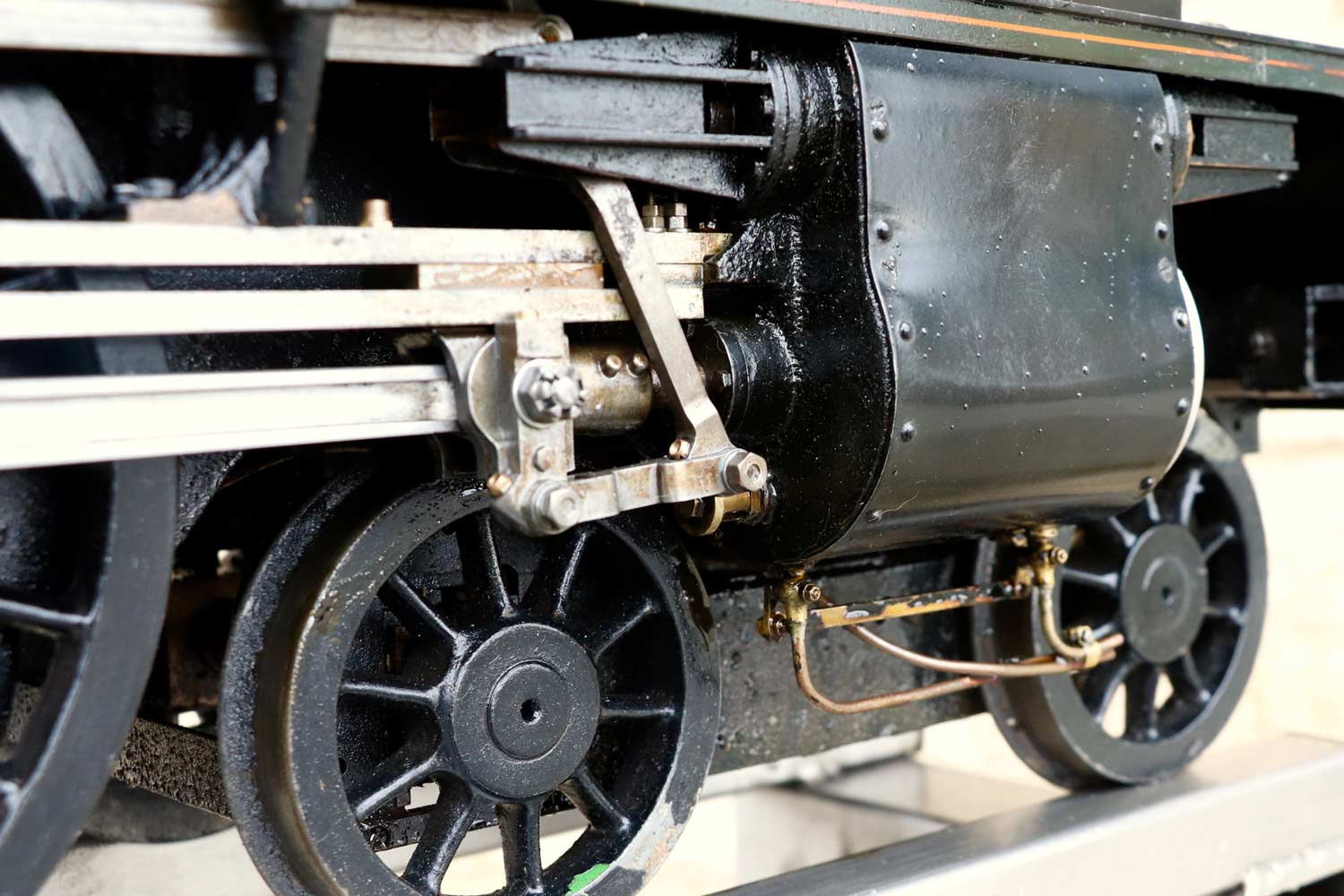 Mechanically as you've no doubt just read, she will be refreshed and ready to go, and the machining work done by the builder is lovely, crisp and neat. The running boards have little trap doors in them for oiling the motion from the top, and they drop closed with that reassuring 'pop' that you only get with a model where the builder knew how to make things properly! The boiler is of course copper and silver soldered, comes with a large wedge of old certificates back to the original date of construction which was 1990. She can of course come with fresh certificates and will be tested and ready to hit the rails.