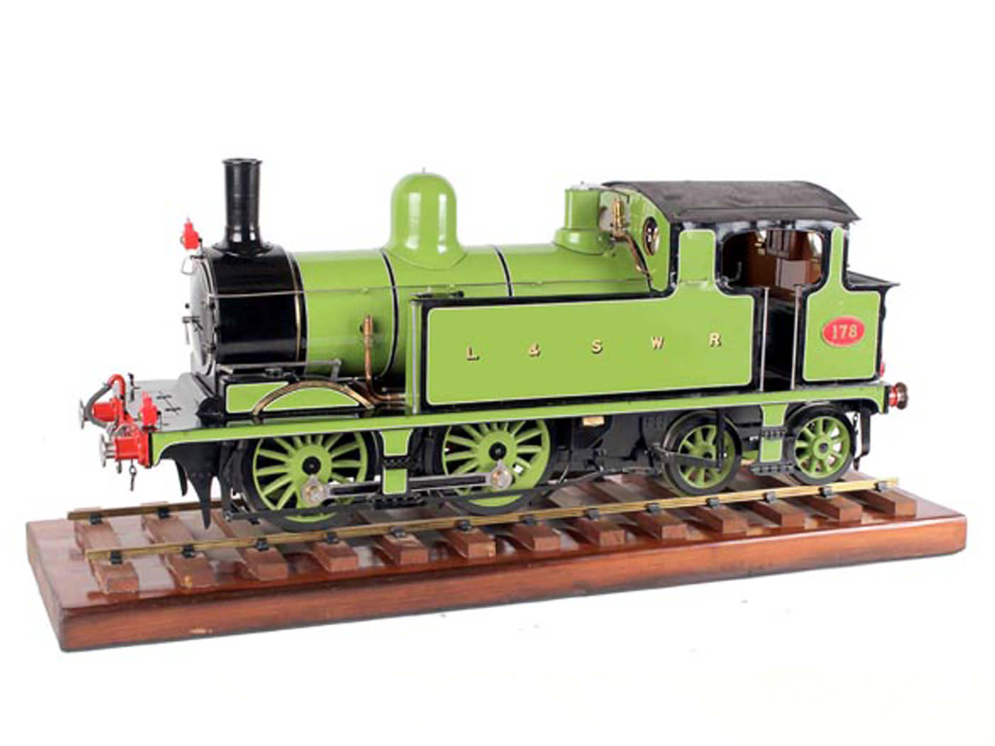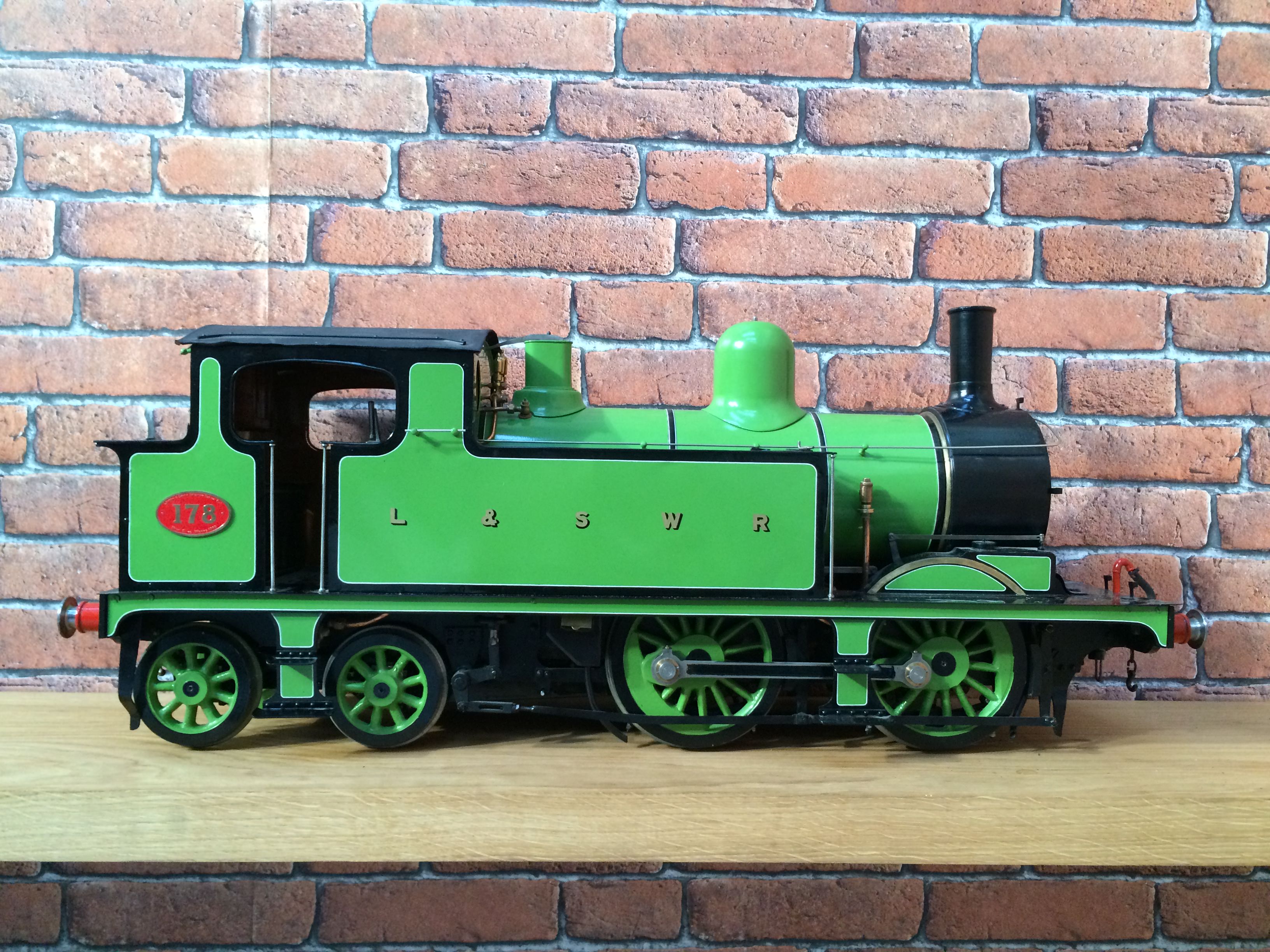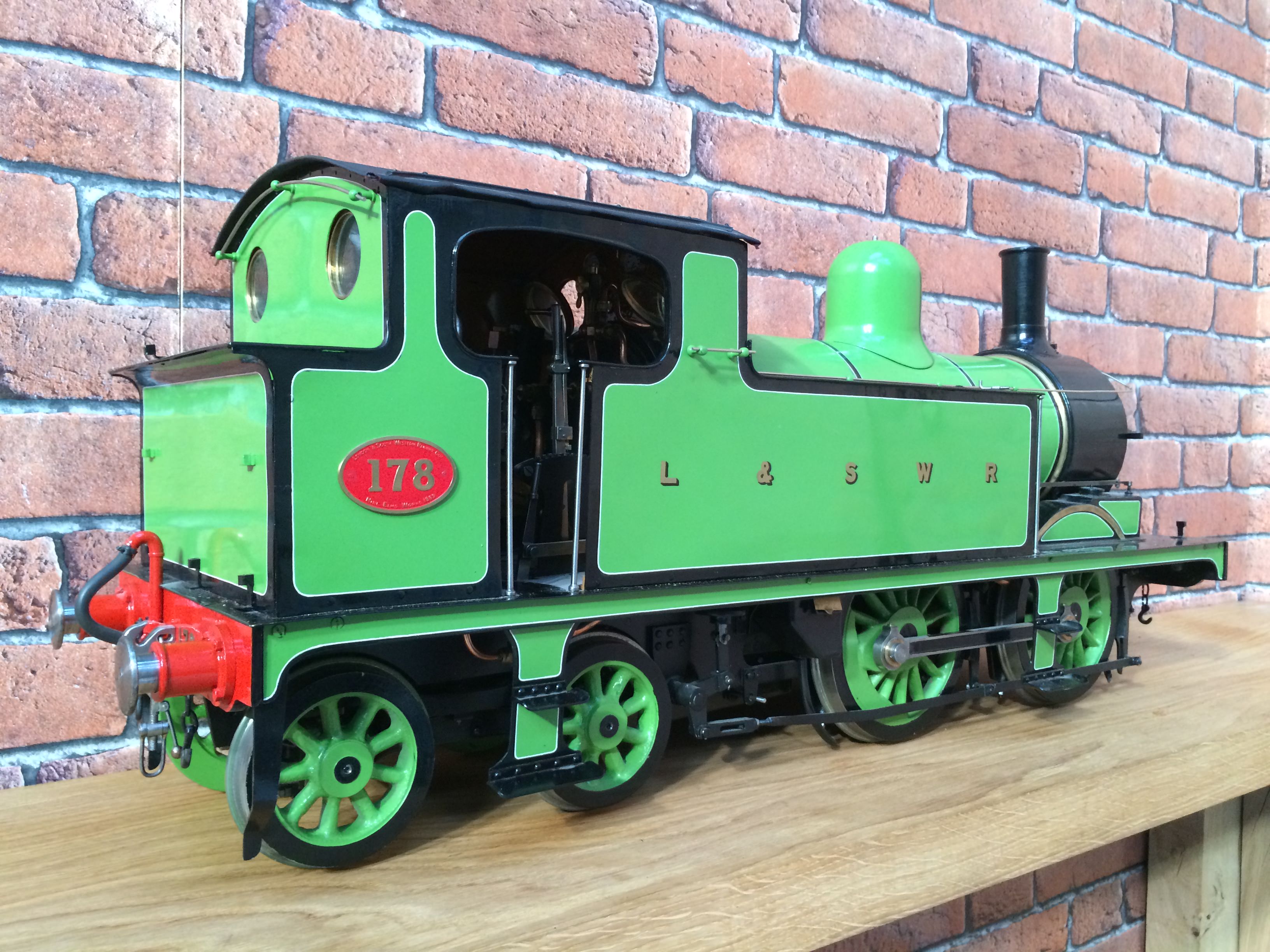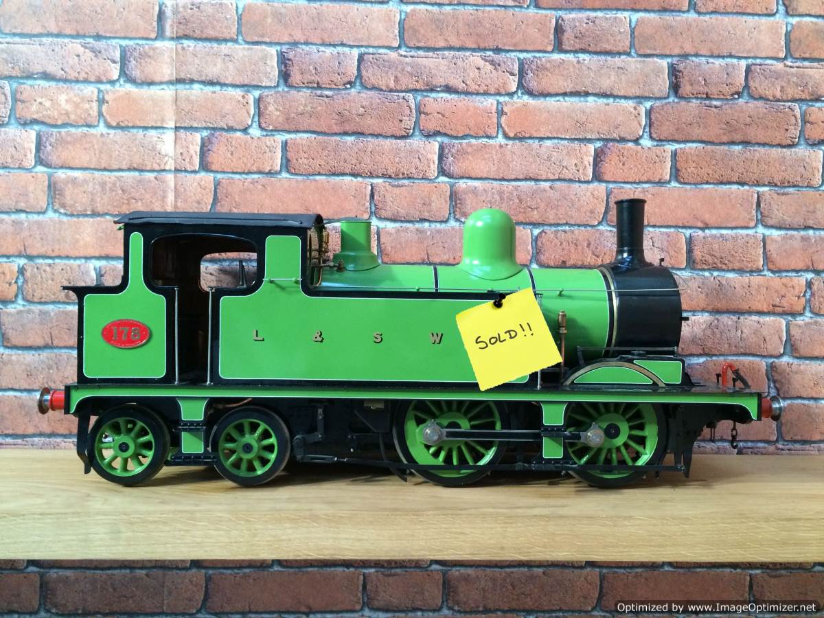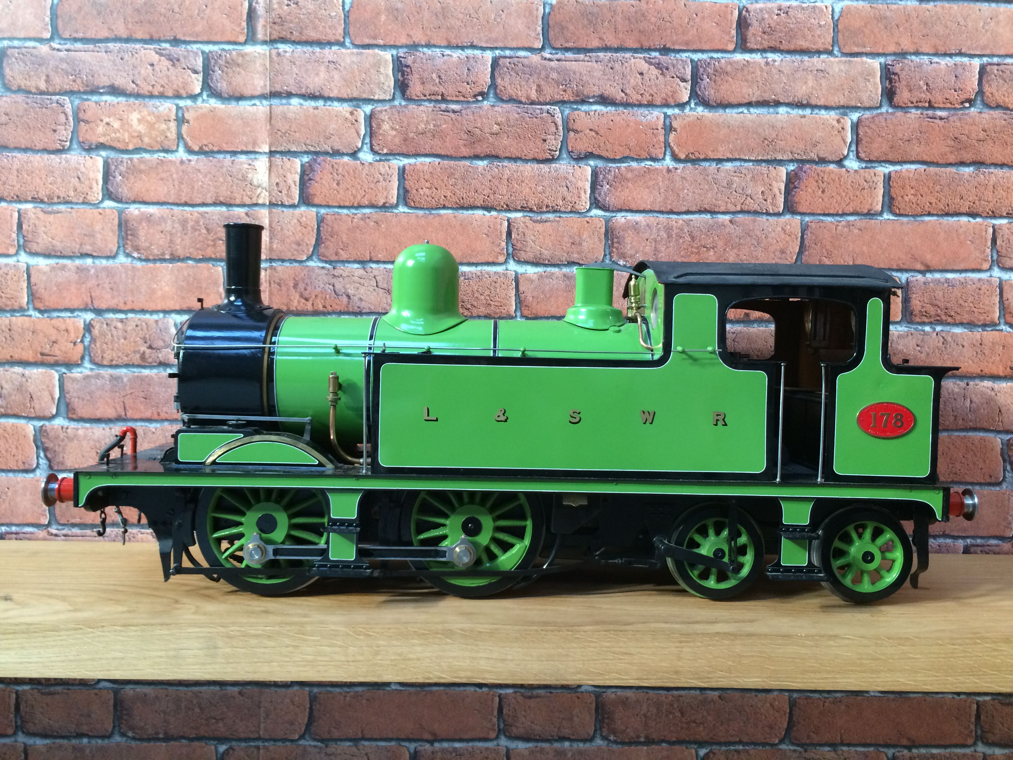 Well now this is an interesting one. It's a particularly lovely looking 5" gauge LSWR Adams O2. Mechanically it is really nicely built, the valve gear being extremely crisp and neatly machined. The paint job is extremely professional, and the detailing is really particularly nice. Can you sense the 'but' coming!? Well, essentially, as far as we can tell this is a model that has at some point been 'virtually' finished by a skilled model engineer, and then it has been passed onto someone who was more of a painter and modeler to finish off and make look lovely. To that end, the running boards, and various bits of platework are particularly thin, scale thicknesses, which makes them a touch delicate, but more than that, it means that they aren't all lying perfectly flat and tidy. Also, mechanically it still needs setting up and sorting out here and there. Currently the lifting arm is only lifting one set of eccentrics, the lever having come adrift from the weigh shaft, the bottom gauge glass fitting is not fit for purpose,..... in fact the entire gauge glass probably wants throwing away and starting again. There's no actual pressure gauge fitted, or lubricator of any kind.