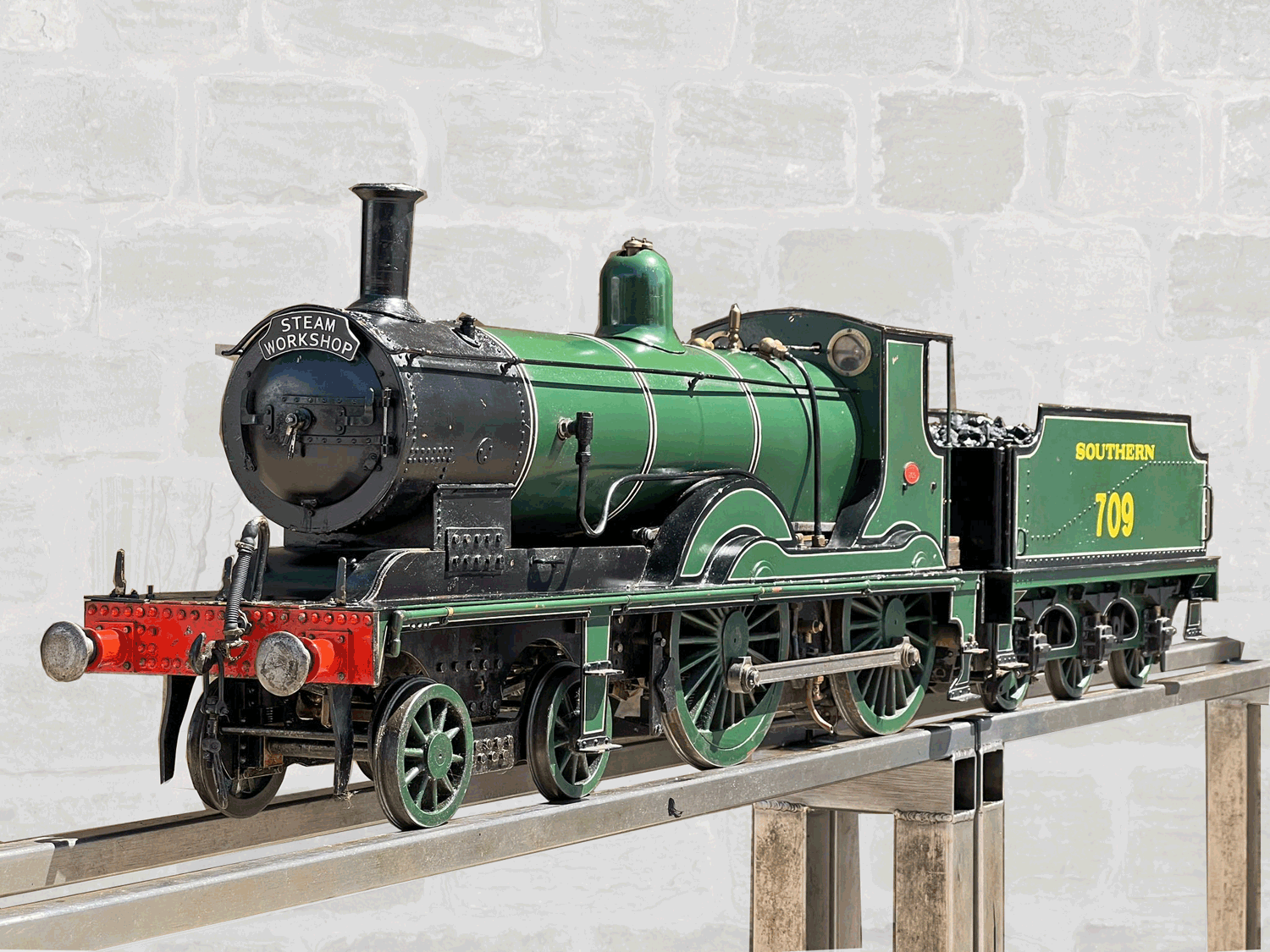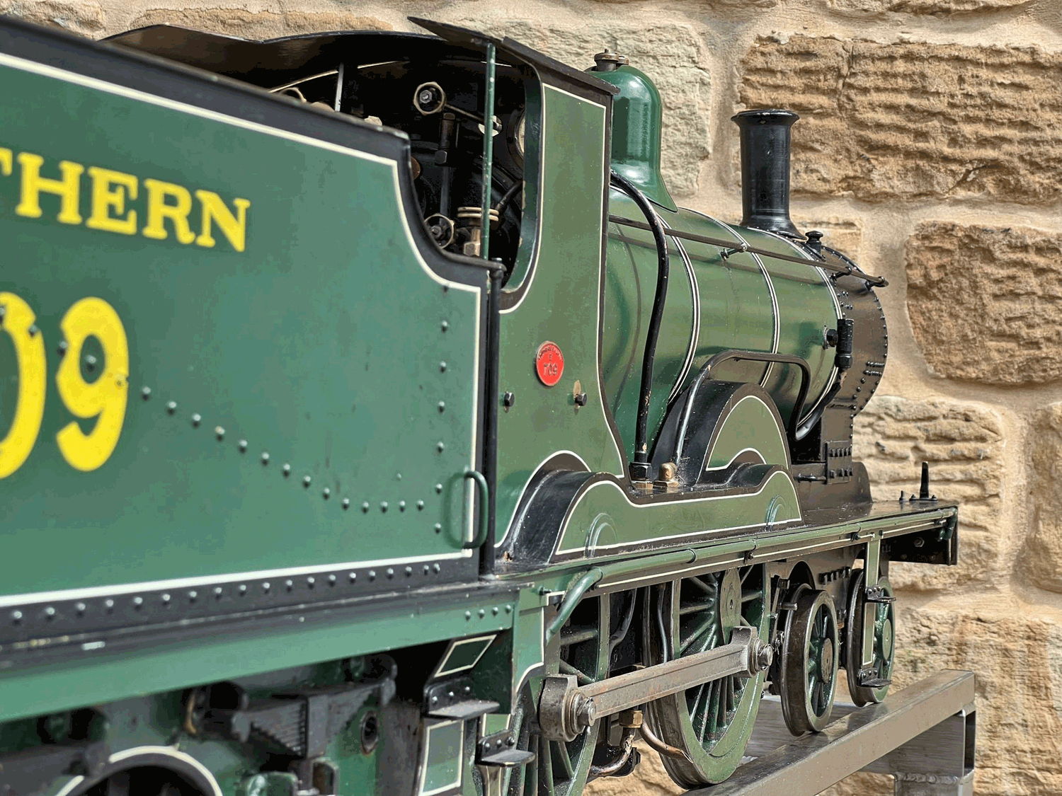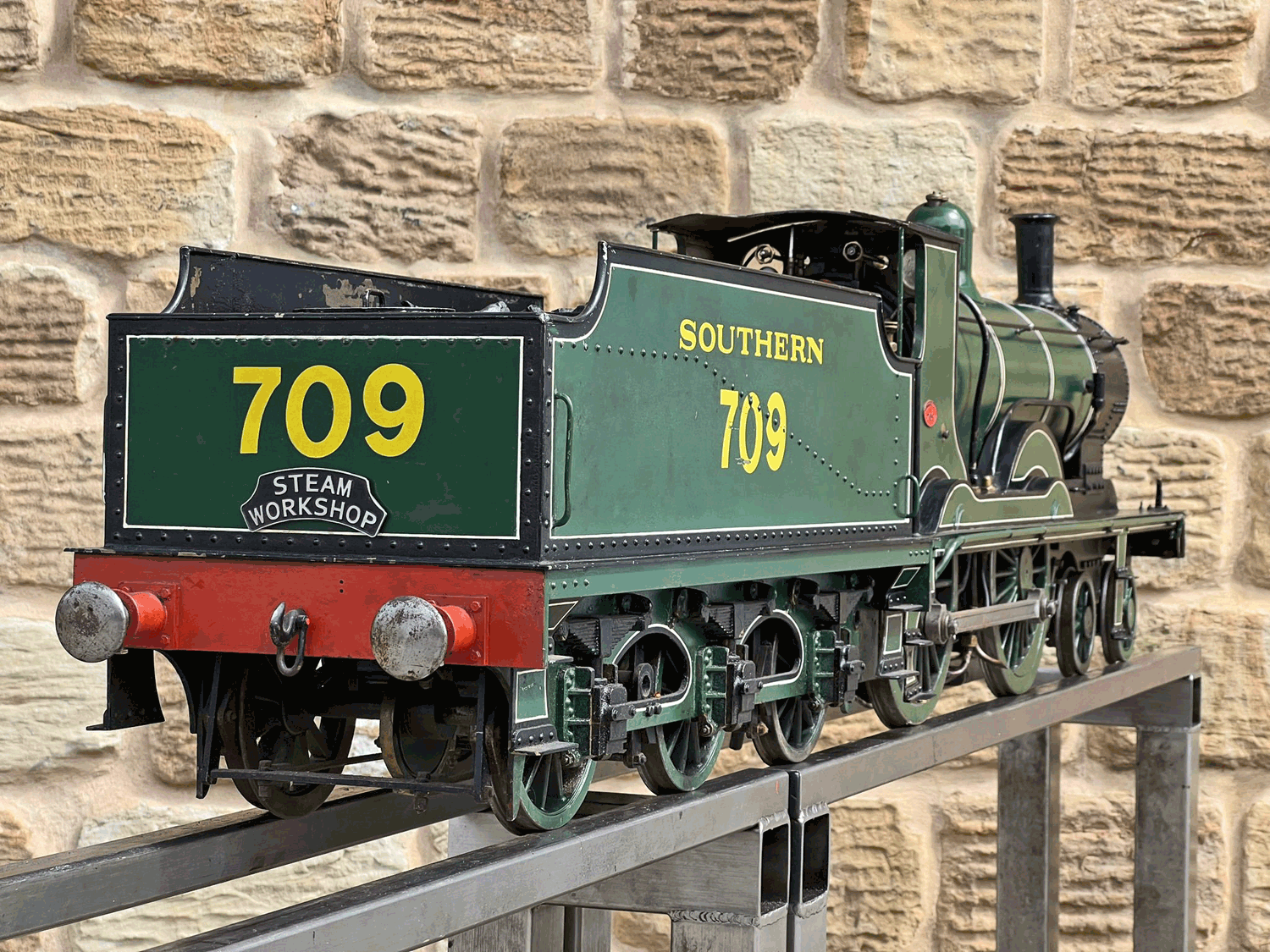 Here we have a rarely modeled 5" gauge LSWR T9. A well engineered model, that looks like it is going to run well. Cosmeticaly it's a little scruffy here n there, and the builder hasn't quite captured the exact proportions of the T9,...... but it's certainly a fair attempt, and possibly with a new chimney and dome it would look a lot more like the real thing!