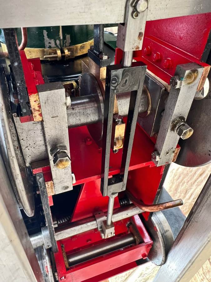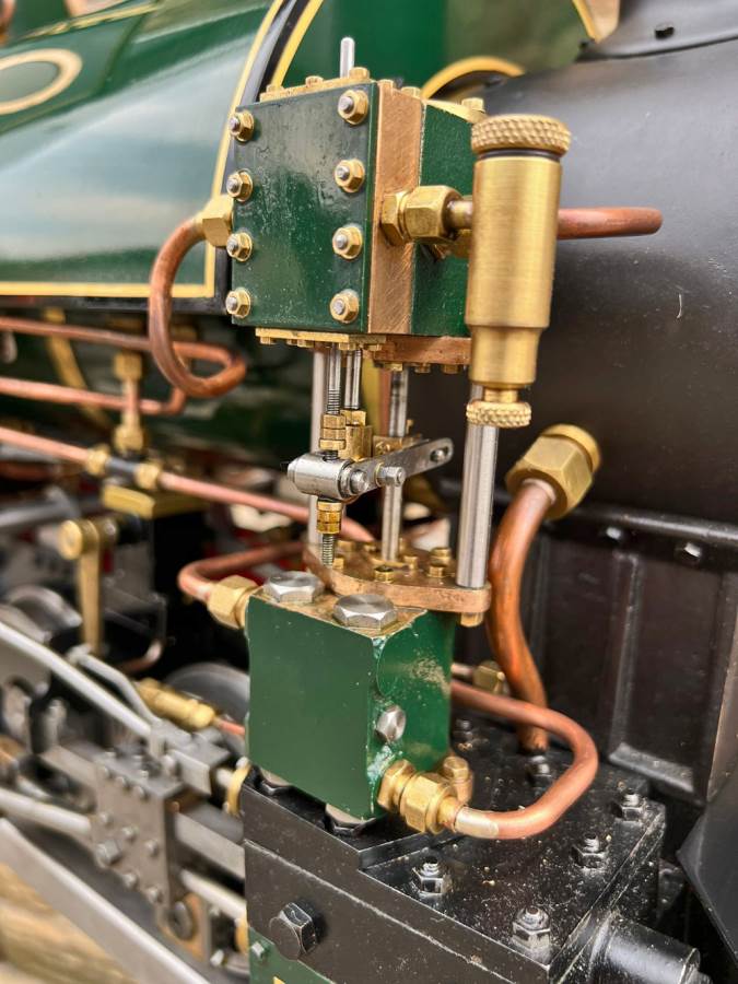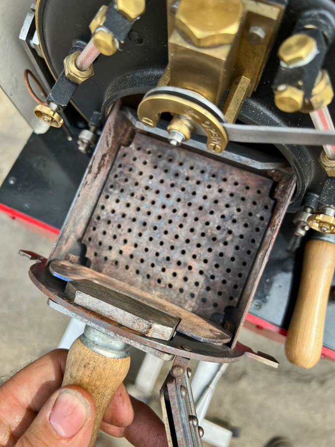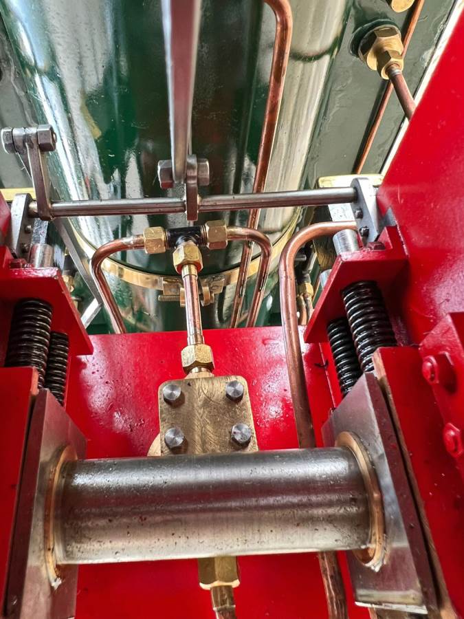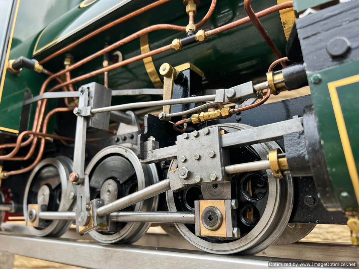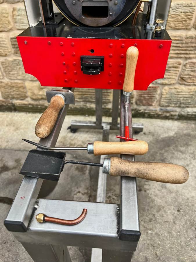 Lots or really crisp model engineering has gone into this one, including several really nice touches. The wheels are a unique design, having been modeled in CAD and then CNC milled from solid steel. The steam pump on the front end pumps water into the boiler beautifully, although there is also an injector fitted and an axle pump with footplate mounted bypass valve. Lubrication is mechanical with a reservoir and pump fitted to each side. The builder has put a lot of thought into the layout and function of the loco and there is a full set of bespoke tools included for handling the removal of the ash pan and grate as well as blowing down and draining the saddle tank. The grate it's self is a nicely designed rosebud set up that again looks well thought out.