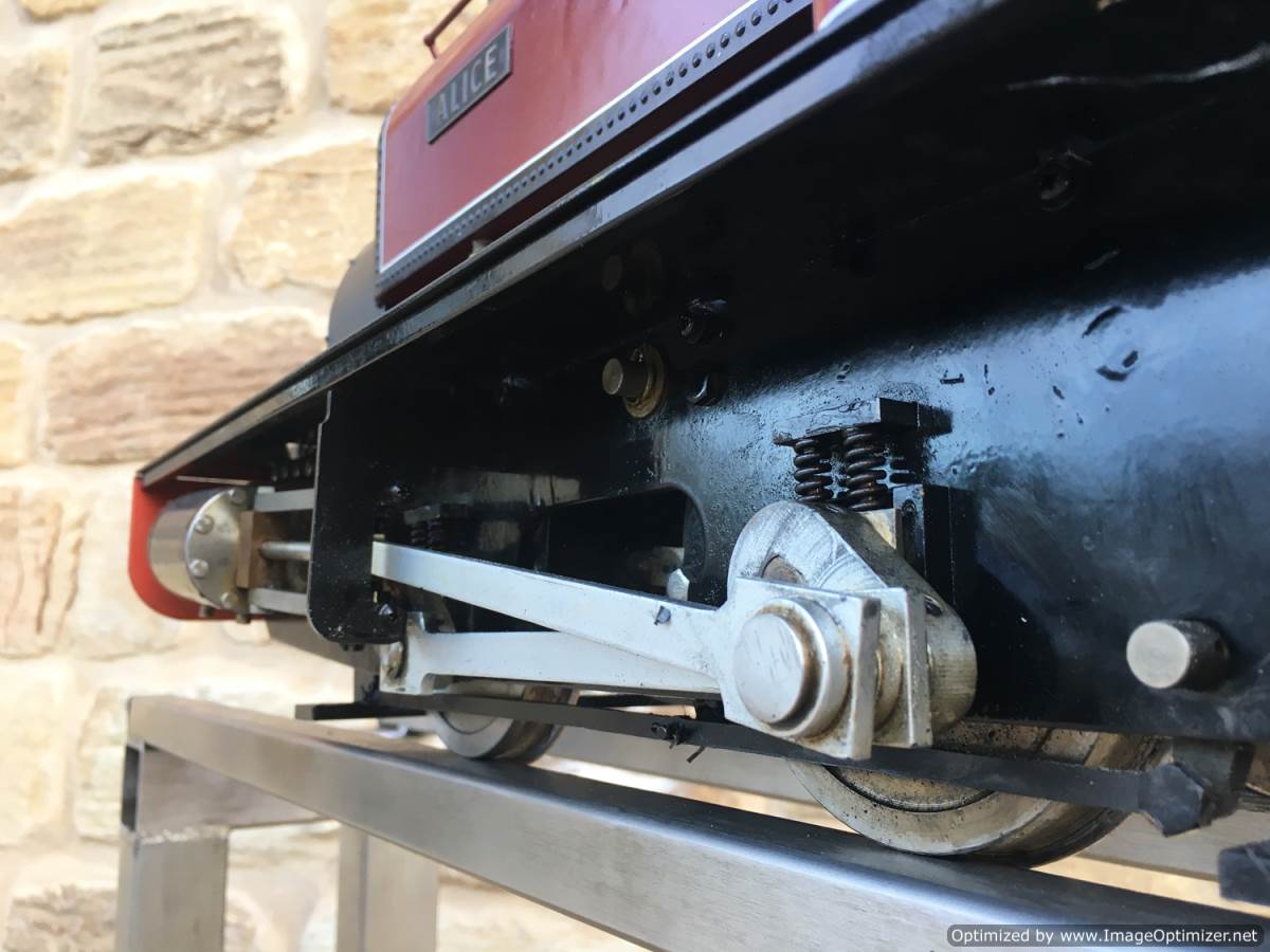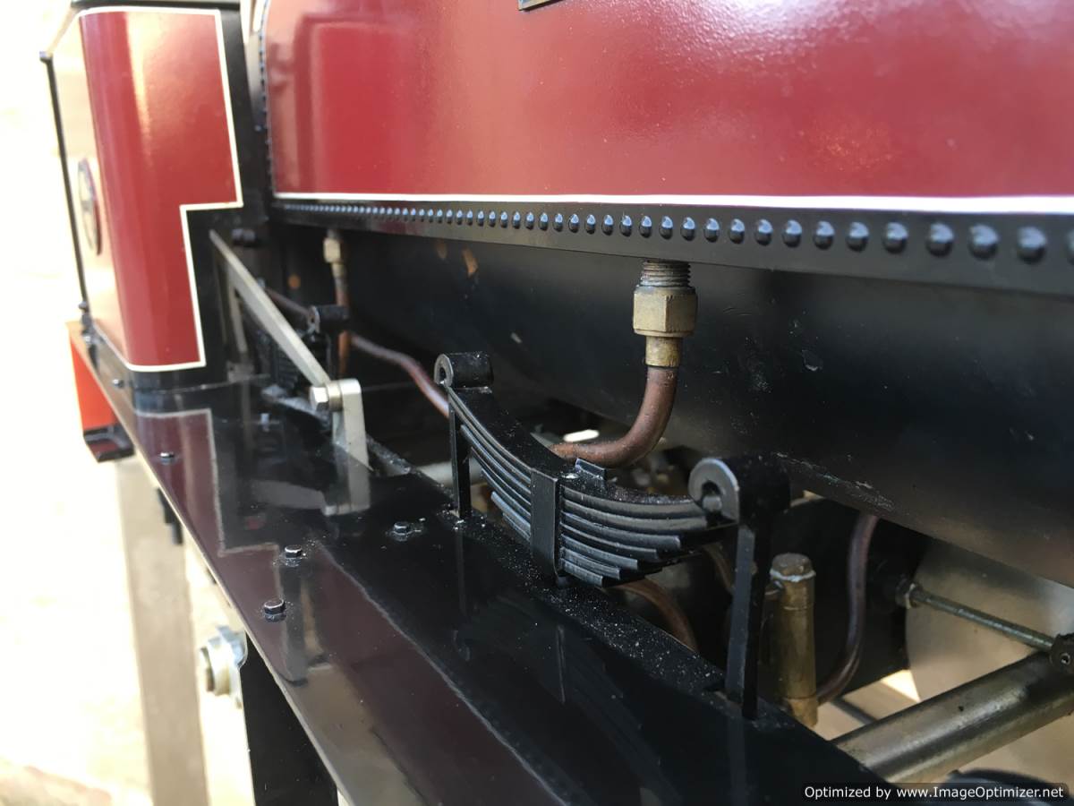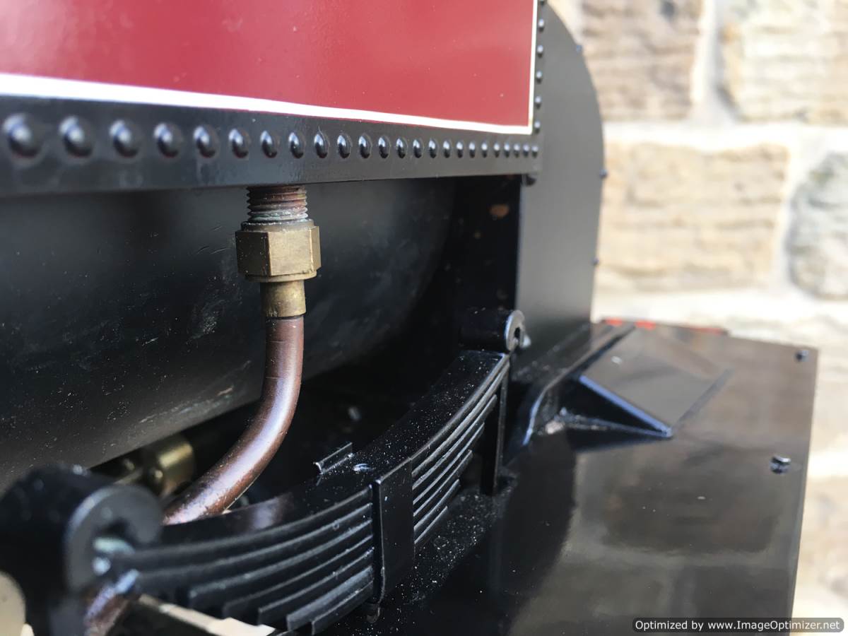 The boiler is of course a professionally made copper silver soldered one, and can be given a fresh 4 year hydraulic test and annual steam test before she leaves us so that she's ready for you to play. Whilst the loco is quite simply constructed, and concessions have clearly been made for ease of commercial production,.... (the rods are all laser cuts rather than machined up,.... the springs are all silhouette cut outs rather than individually leaved fabrications),.... the net result is extremely neat and convincing. Everything is certainly very crisp and well executed.