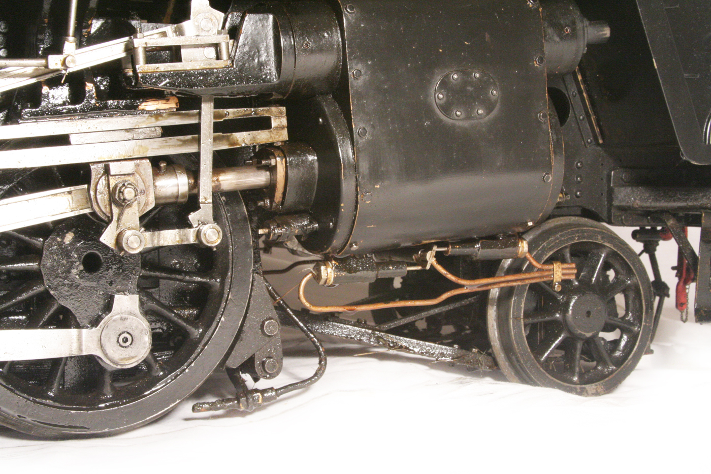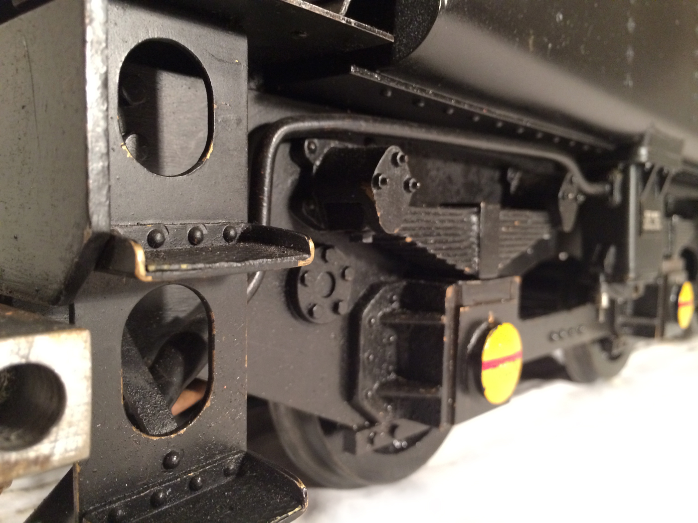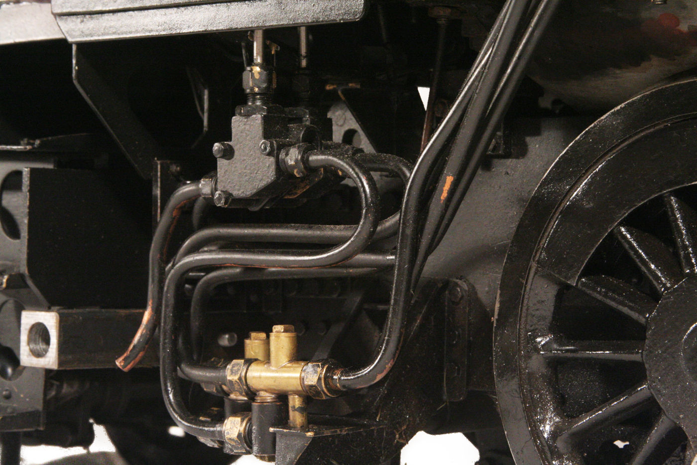 We've done quite a bit of work over the last year or so, including a new regulator, re-worked lubricators, modifications to the reverser, balancing the driving wheels, reducing the pony truck loading, modifications to the valves, various (removable) modifications to ride on the tender for GL5 fun. So now she is fully sorted and ready to play. There are twin, reliable injectors, a tender hand pump, steam operated drain cocks, Dave Noble gauge glasses, the usual Hewson detail additions. She is fitted with steam brakes, their being two cylinders, one front and one rear, and of course there's the handbrake on the tender.