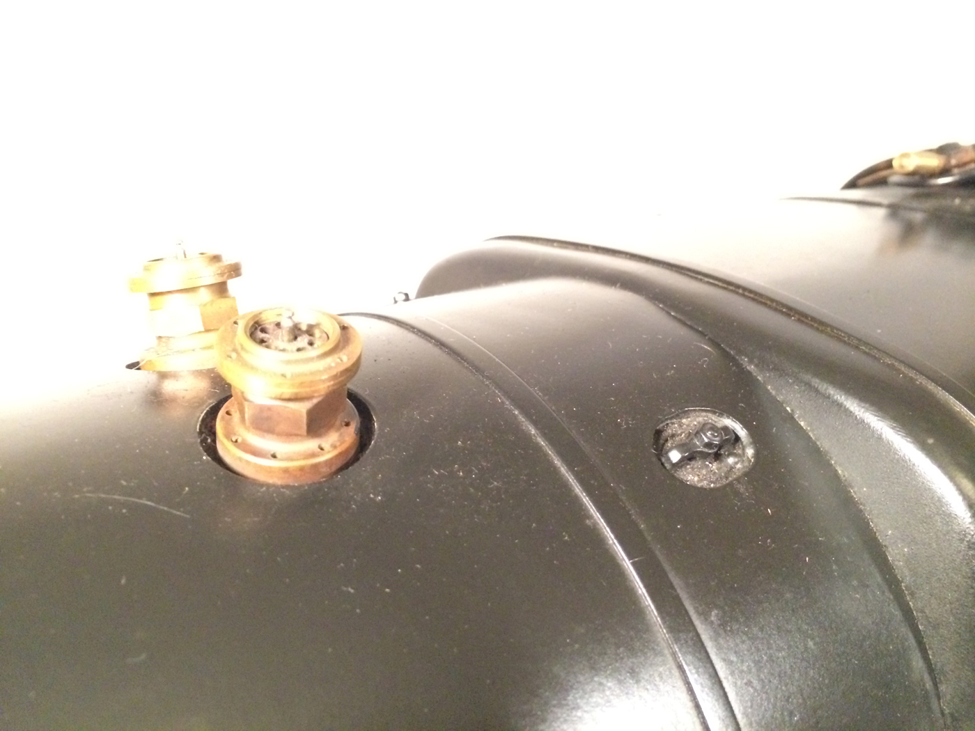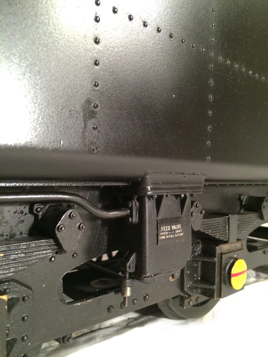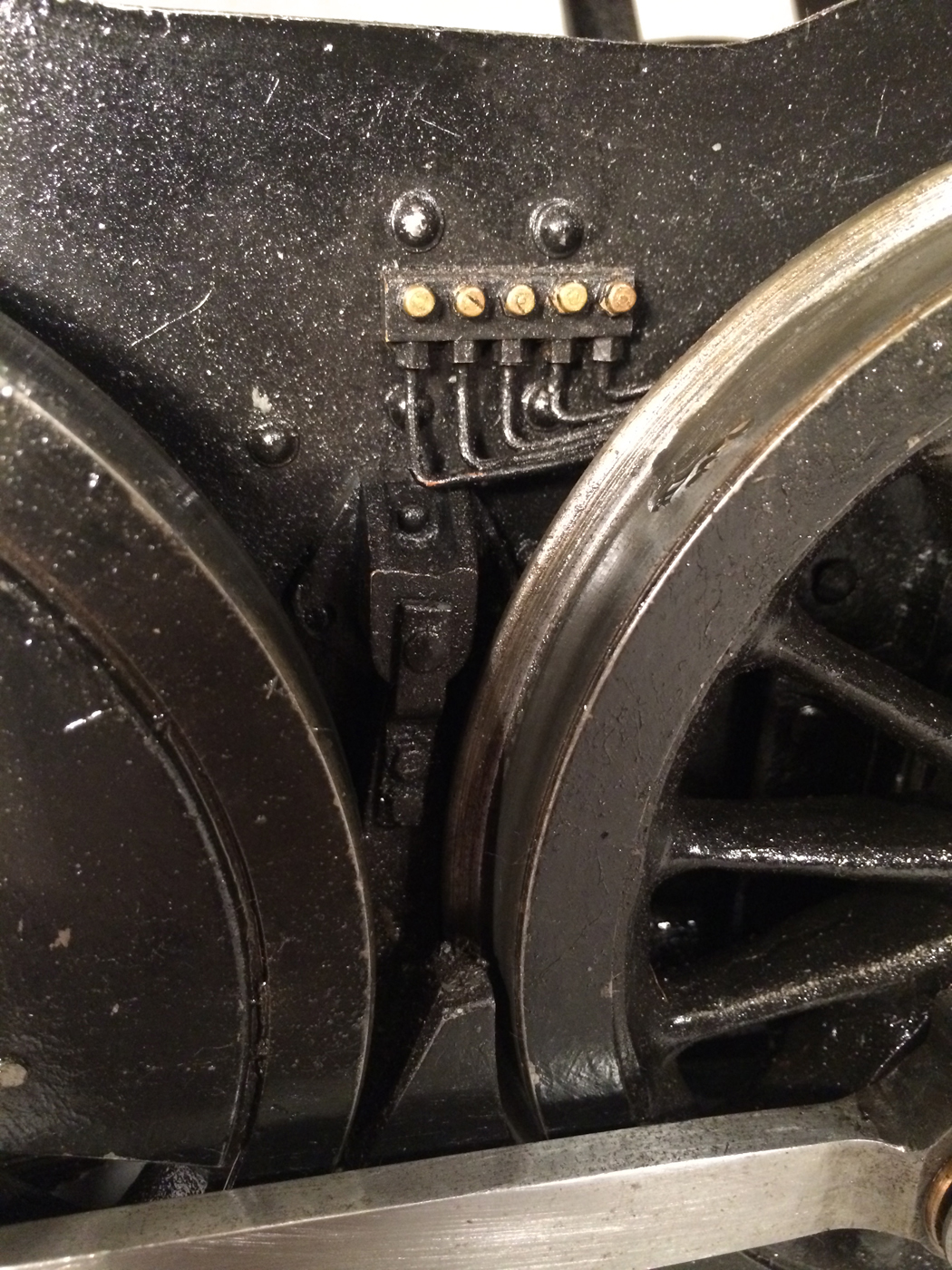 We've done quite a bit of work over the last year or so, including a new regulator, re-worked lubricators, modifications to the reverser, balancing the driving wheels, reducing the pony truck loading, modifications to the valves, various (removable) modifications to ride on the tender for GL5 fun. So now she is fully sorted and ready to play. There are twin, reliable injectors, a tender hand pump, steam operated drain cocks, Dave Noble gauge glasses, the usual Hewson detail additions. She is fitted with steam brakes, their being two cylinders, one front and one rear, and of course there's the handbrake on the tender.