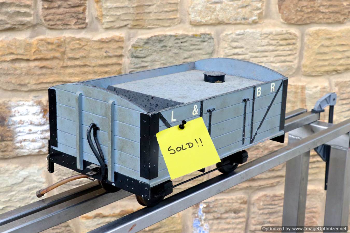 Here we have a rather lovely little 3 1/2" gauge Lynton & Barnstaple driving truck. It's got a water tank with filler cap, and a coal space up front. There is nice brake gear detailing on the chassis and even the vac brake pipes are very attractively done. The L&B lettering could easily be removed if you've some other prototype, but it's definitely a wagon with a lot of character and ideal to sit as a tender for your 3 1/2" narrow gauge tank engine.