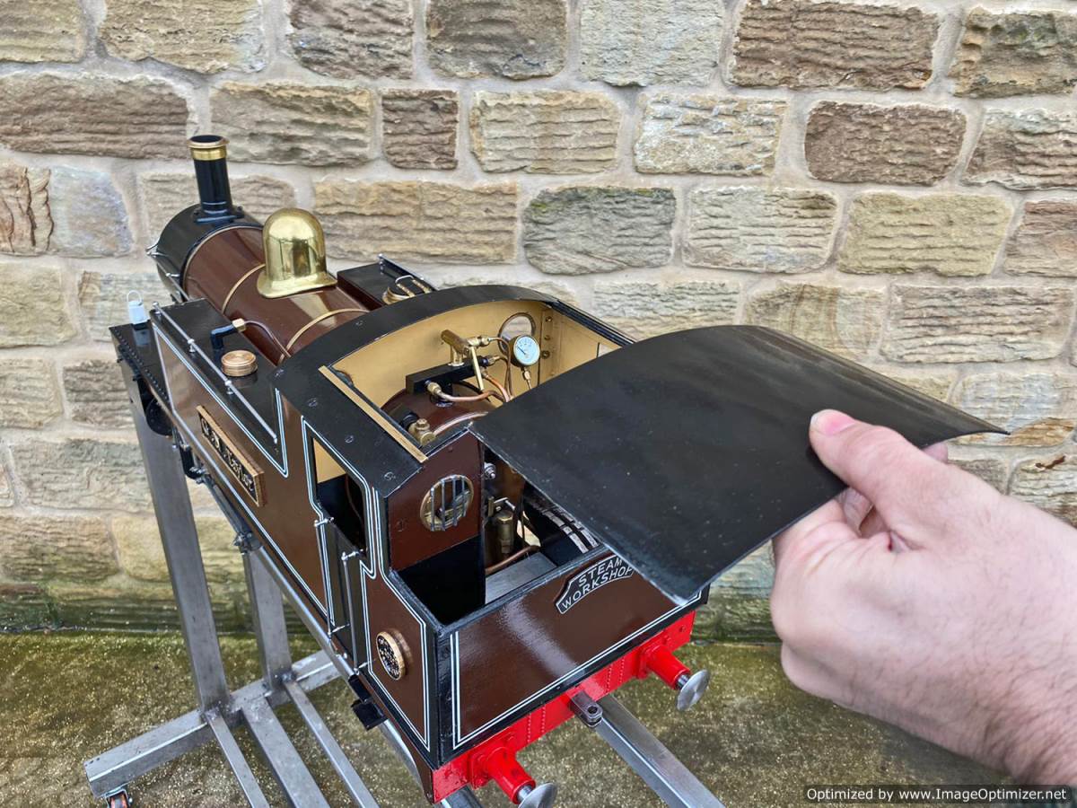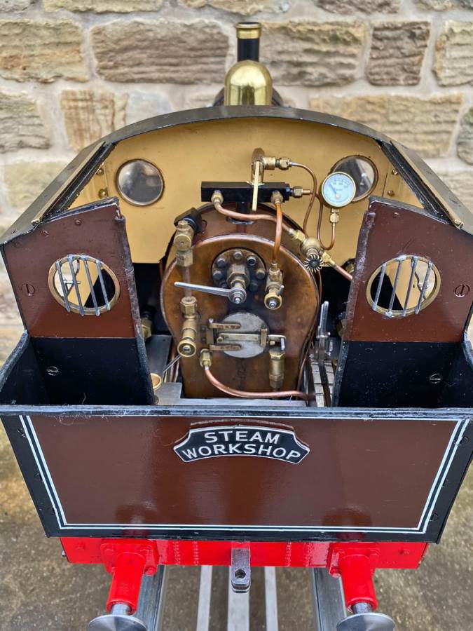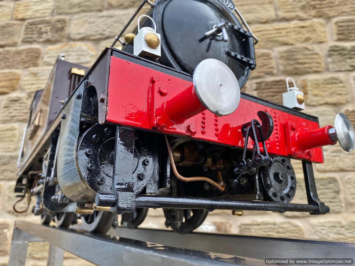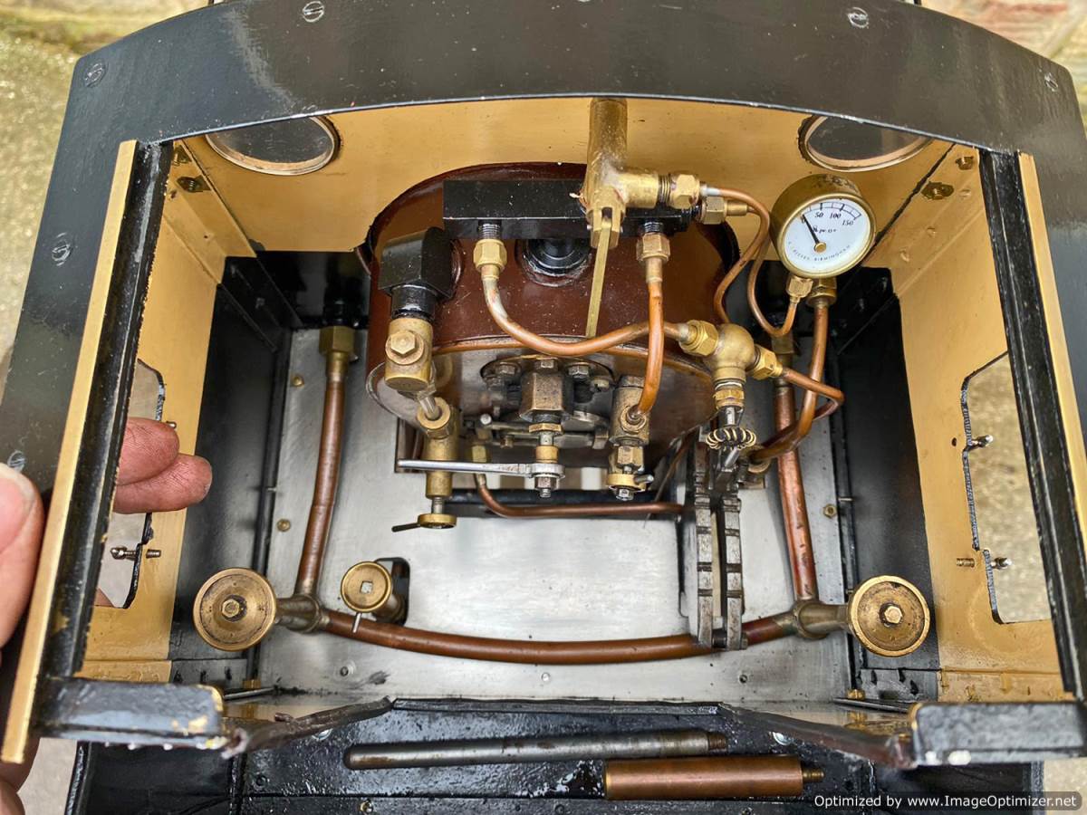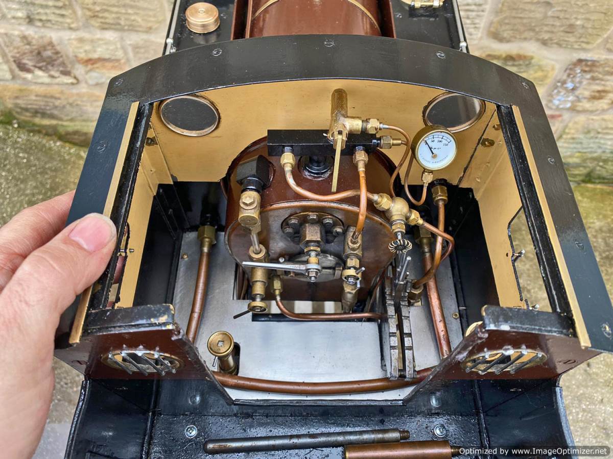 This loco has just benefited from an overhaul by her previous owner.  The bottom end doesn't have any significant slop present and we've given the copper, silver soldered boiler a twice working pressure hydraulic test to make sure all is well there too.  There's an injector, plus an axle pump with footplate mounted bypass and of course the hand pump hidden in the tank.  There's also a nice little cork float gauge in the left hand tank that pops up to show you the water level.  Lubrication is mechanical and in the usual place on the running board.