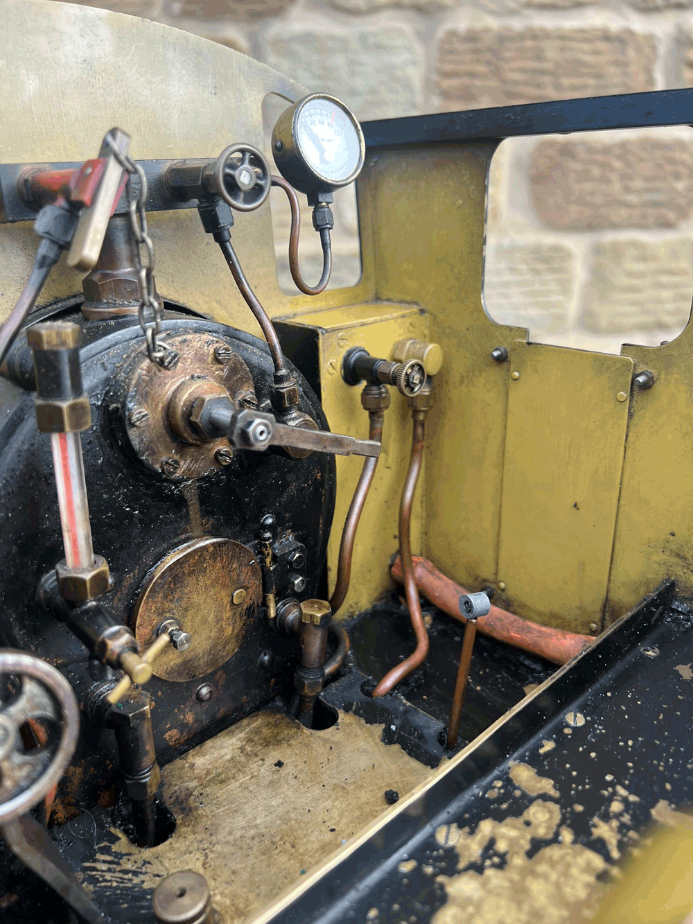 This one is currently fitted with 2 forms of water supply, an axle pump with footplate mounted bypass valve and of course the hand pump in the tank. There is room on the manifold to fit an injector should you want one, and we can do this for you if you prefer. The boiler is silver soldered copper and comes with fresh boiler tests both hydraulic to twice working pressure and steam so all's well and ready to run. Lubrication is mechanical with the reservoir easily accessible on the running board.