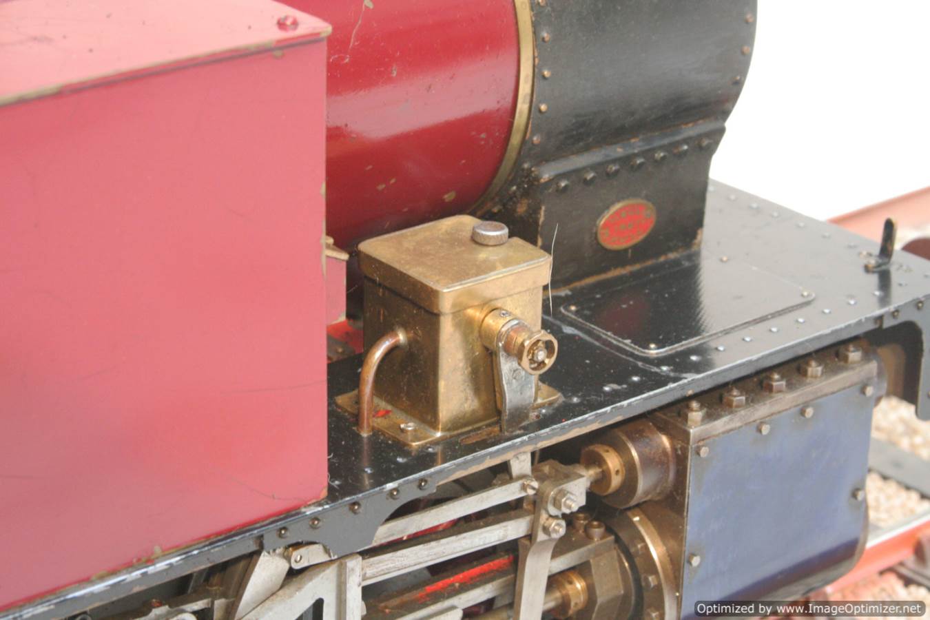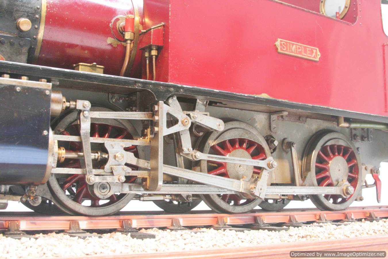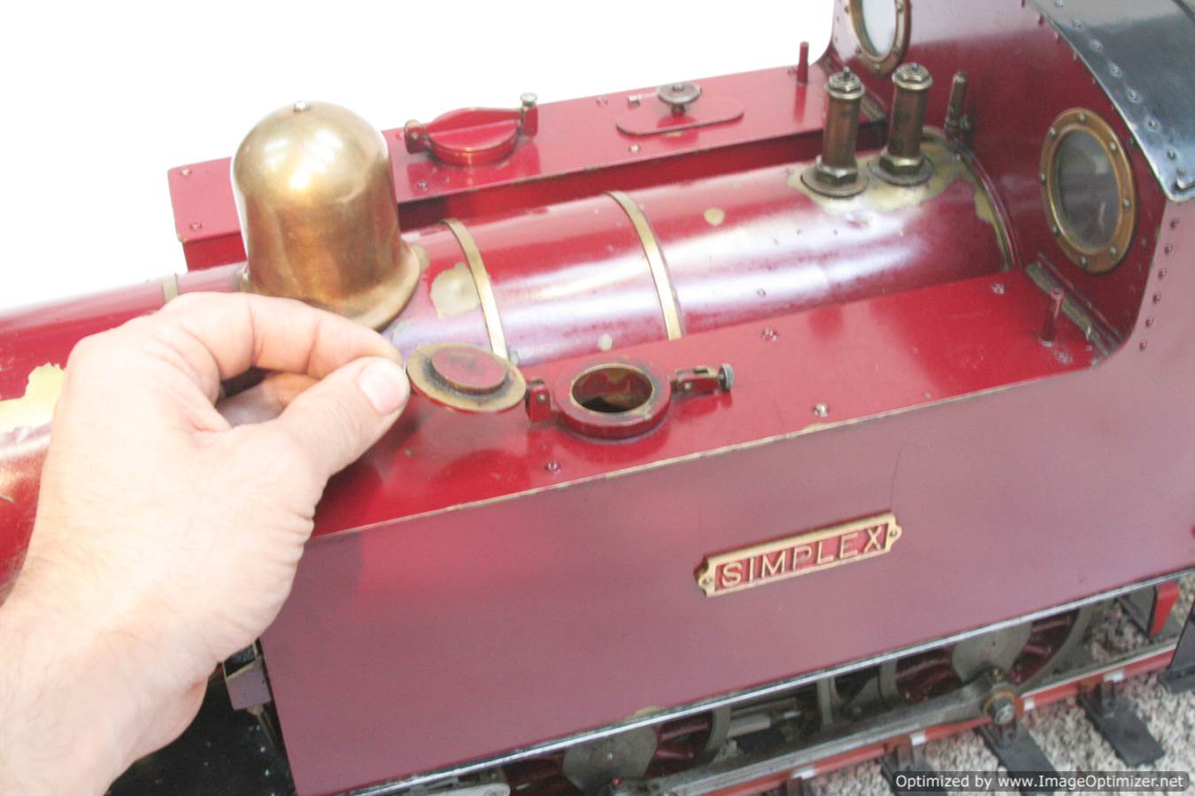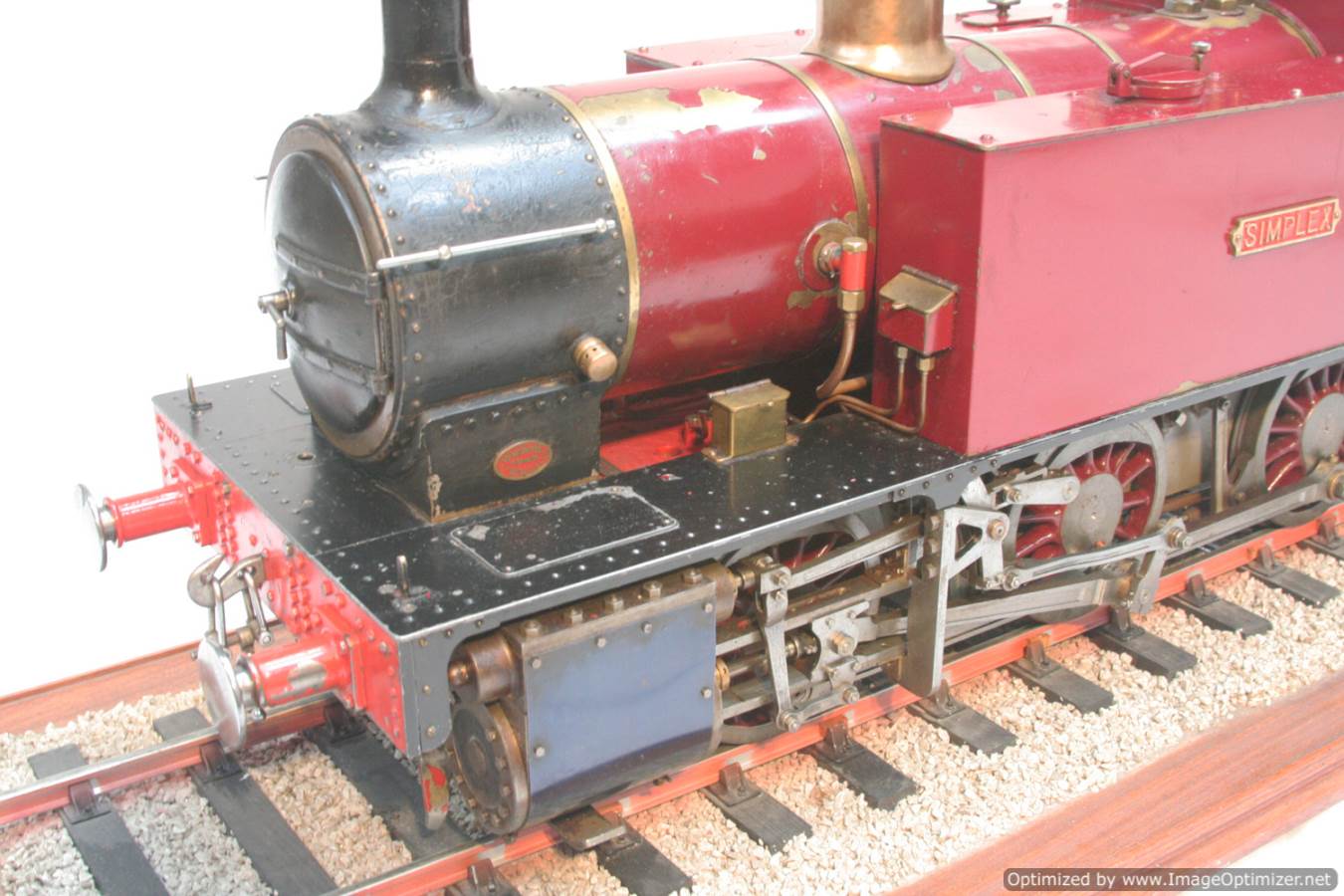 Here we have a well made, and in cosmetically 'run' condition Simplex to Martin Evans' design. Built interestingly by the same builder as the 7 1/4" gauge BR standard class 4 tank that we have just completed the full ground up re-build on, and so fundamentally this is a solidly built model. All the usual bits and bobs are there as it should be, there is an injector, an axle pump with footplate mounted bypass valve and a hand pump in the tank. Lubrication is the usual mechanical job under the front running board. The boiler is of course silver soldered copper, and nicely made, and of course as with all our models she can go fully checked out and tested, with a full fresh 4 year hydraulic certificate and a fresh annual steam certificate. You have to obviously look a little past the tatty paint on this one, but when you do, you'll seer that the machining work is pretty good, and the attention to detail make this a pretty well thought through Simplex.