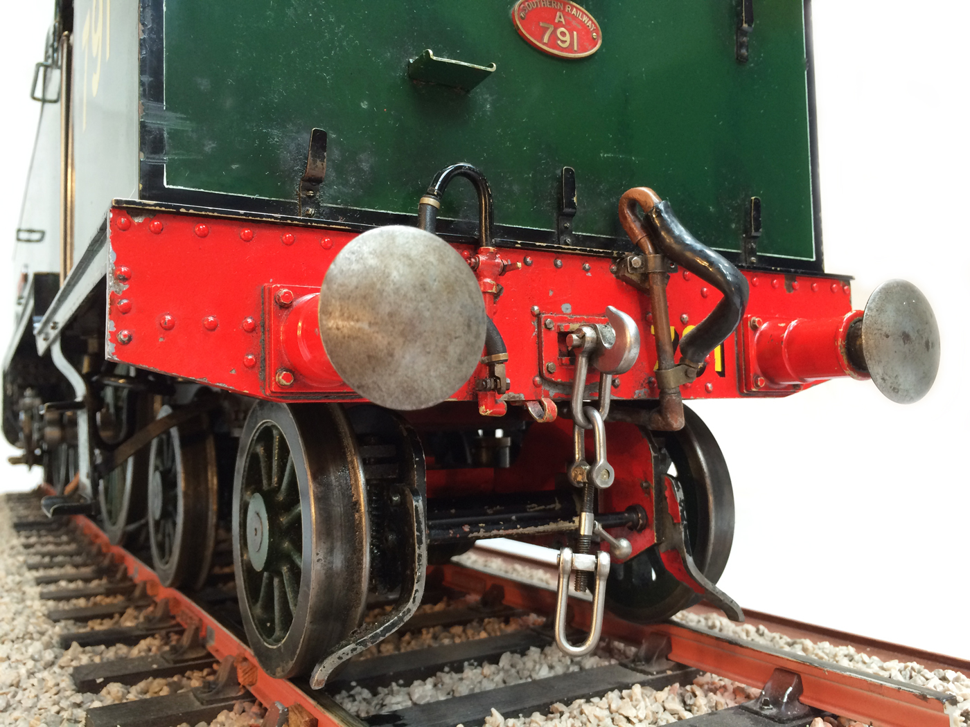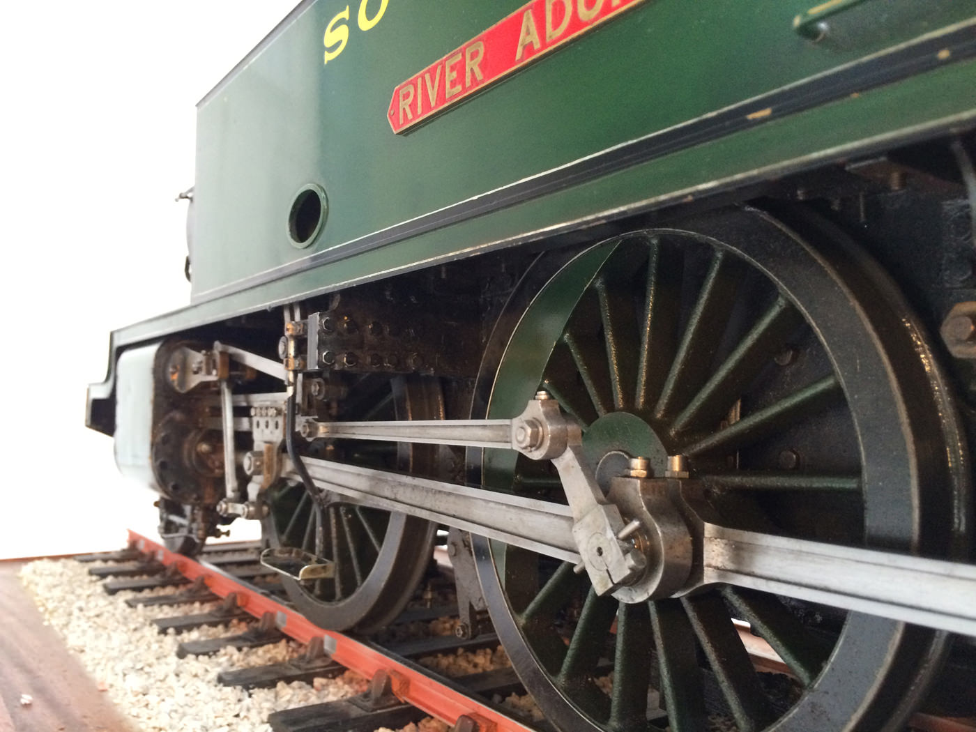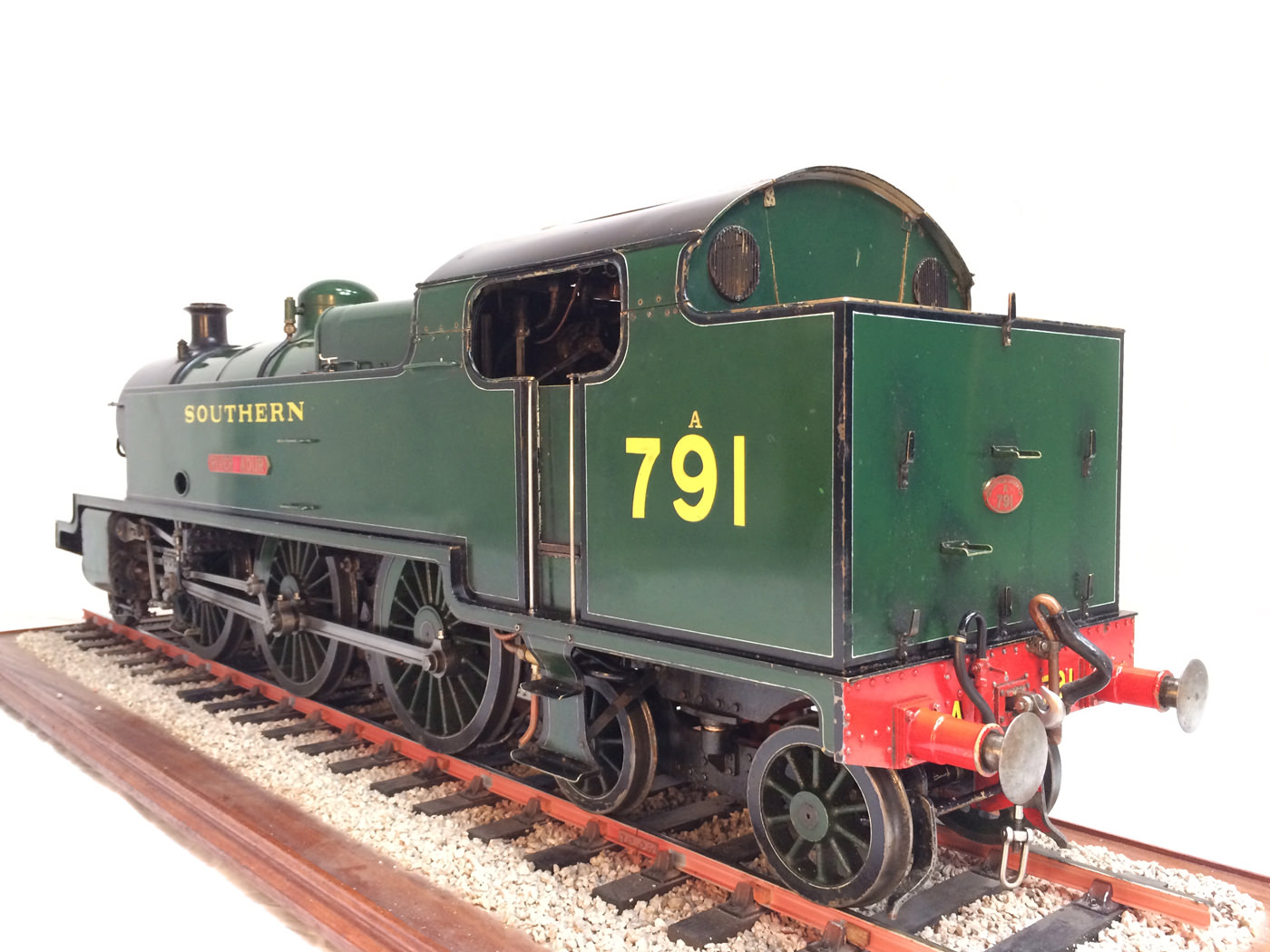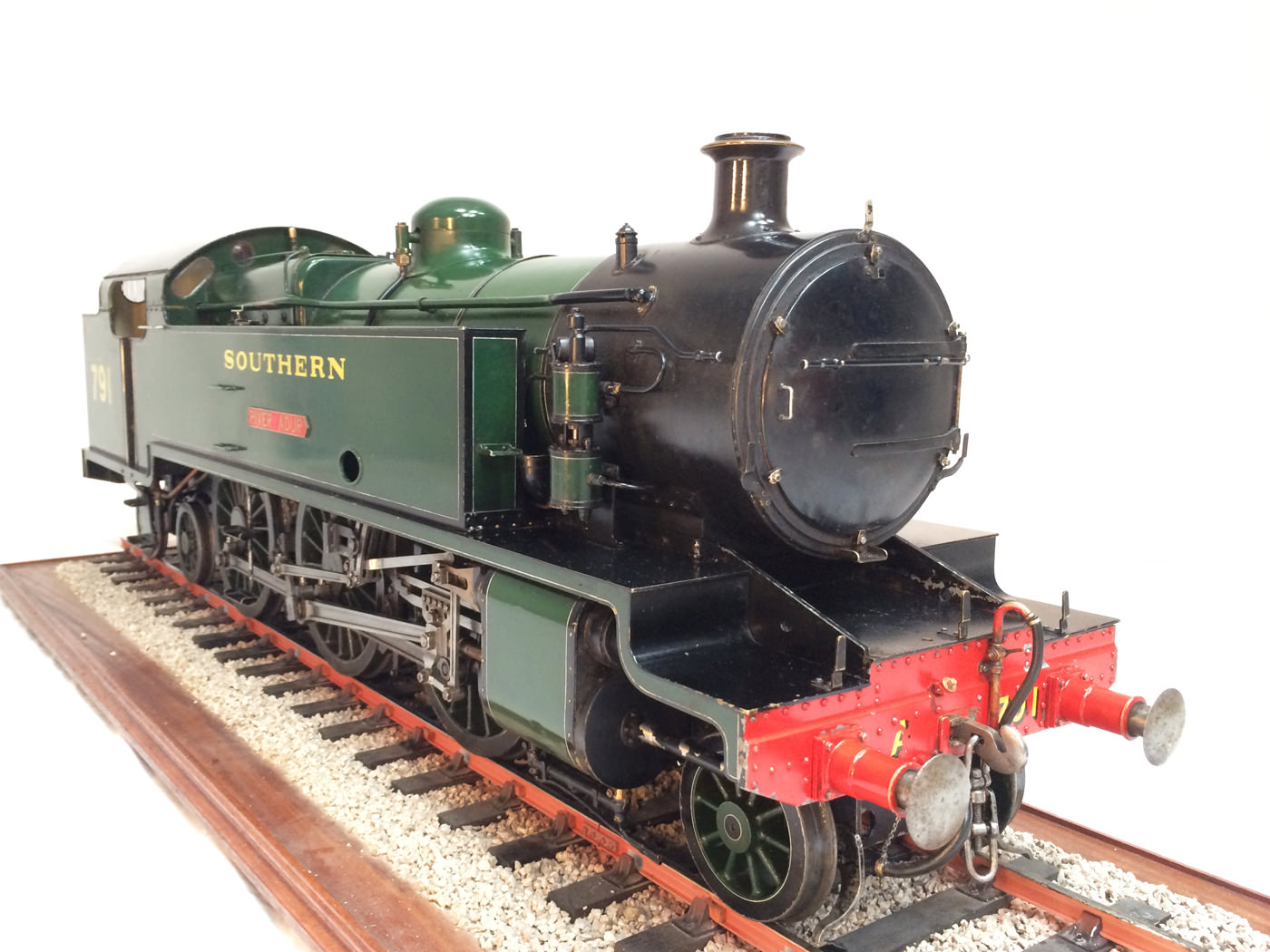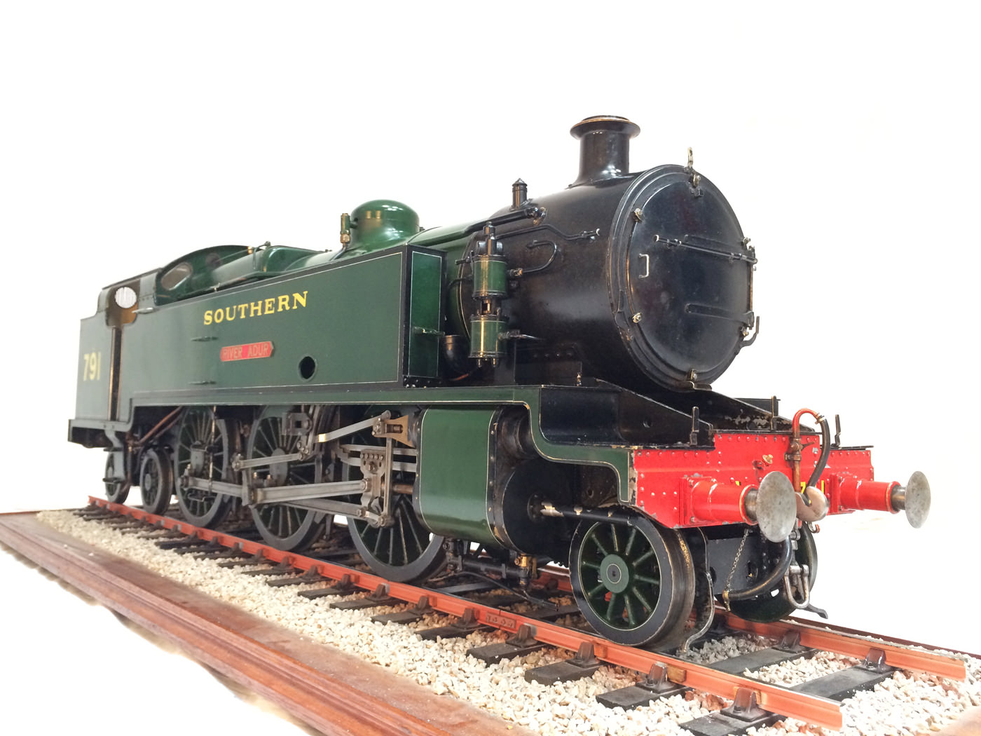 Here we have a rather lovely 5" Gauge Southern Railway K Class (River Class) 2-6-4 tank. This is a particularly well made locomotive, having been awarded the Silver medal at the 1987 ME Exhibition and the Bill Deane Memorial cup at the 1988 ME Exhibition. Although she hasn't been sitting in a display cabinet over the years, rather she has been a regular performer for the builder at his local club track, and shows the usual cosmetic wear and tear consistent with a running model. That said, she is still very tidy, and the quality of both the model engineering and the paint finish is clearly evident.