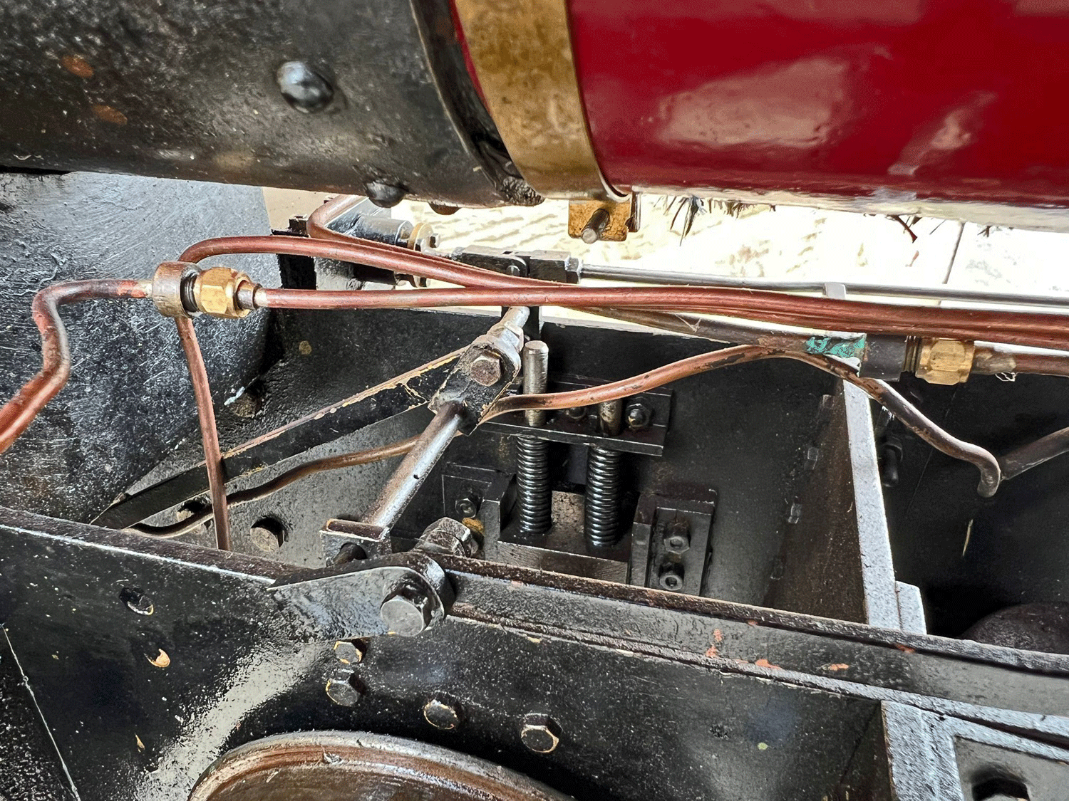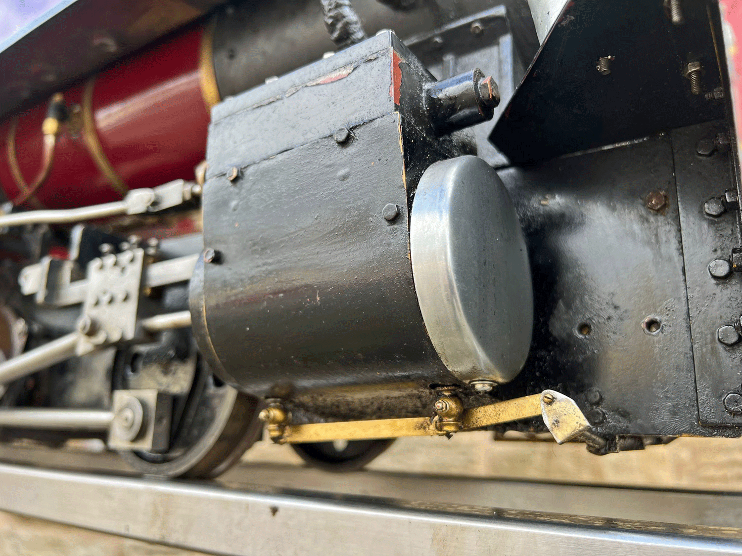 Fitted with a pair of injectors for water, fed from the tender so it stays nice and cold. There is a little more space in the saddle tank, but it's at least half full of lead, so you shouldn't have any grip issues. Lubrication is displacement with a large reservoir under the front running board and twin, regulateable sight feeds on the footplate. If you want a Sweet Pea, but want one with more grip, better steaming qualities and improved valve gear, then this is the loco for you!