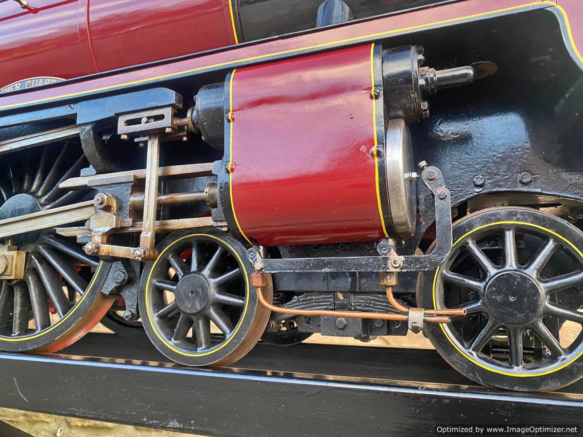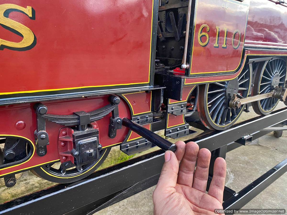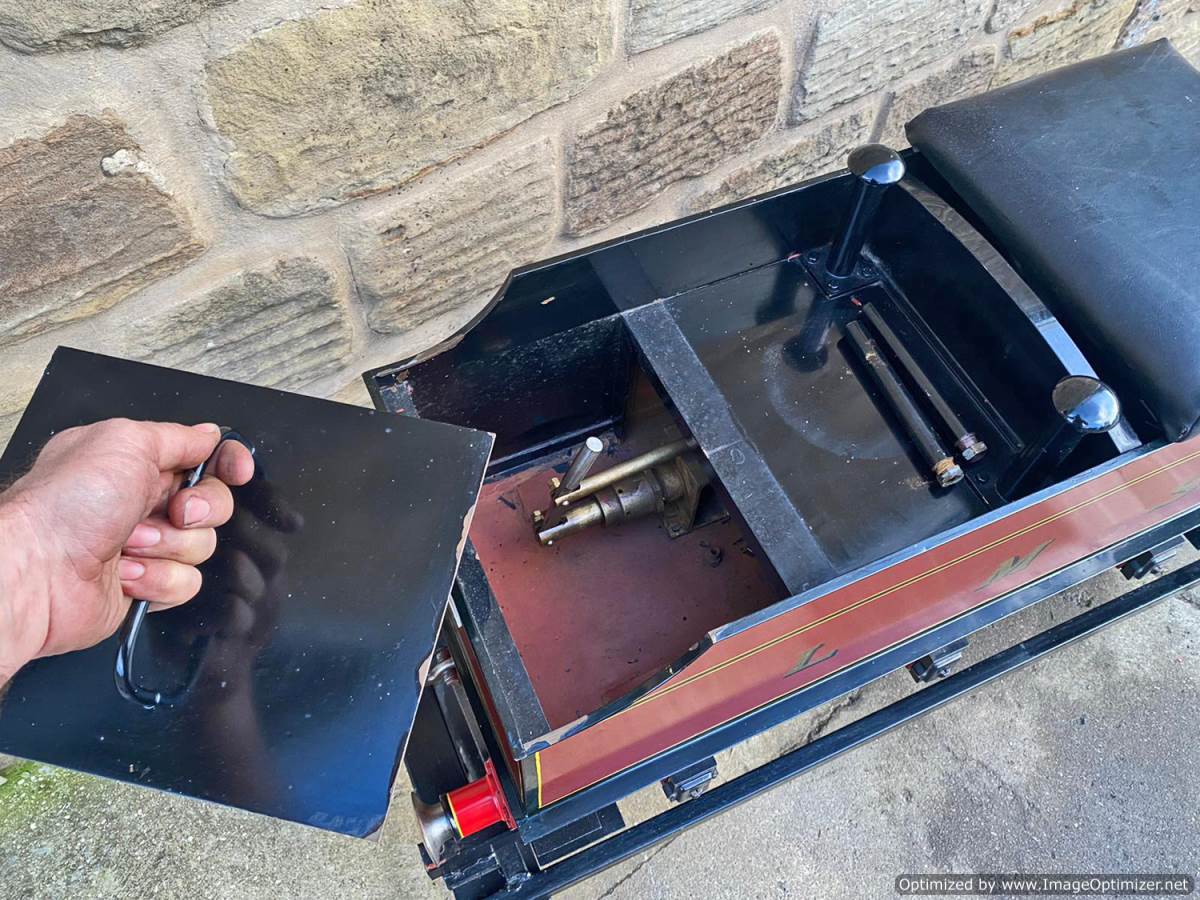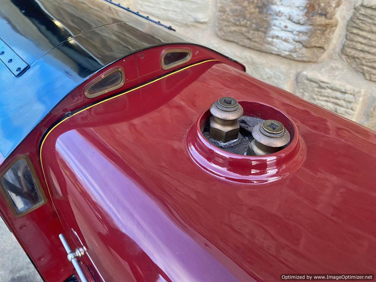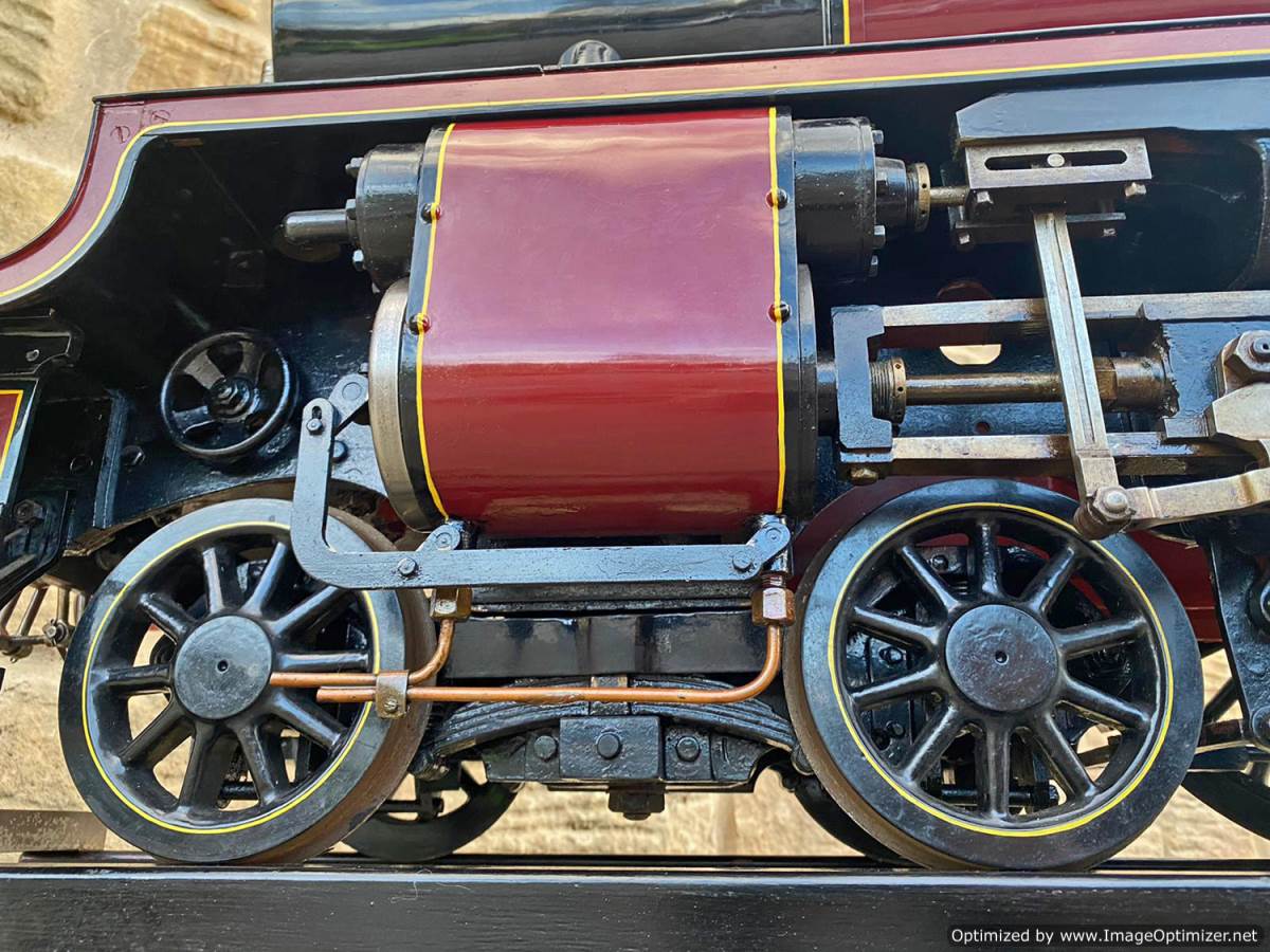 The boiler is copper and silver soldered, and can of course come with a fresh 4 year hydraulic test and annual steam test. Fitted with two injectors, a particularly sturdy looking axle pump and footplate mounted bypass valve and a hand pump in the tender. Lubrication is mechanical and hidden under the front running boards, driven from a chunky eccentric. Paint finish is superb and generally mechanically speaking the model looks like it's hardly run.