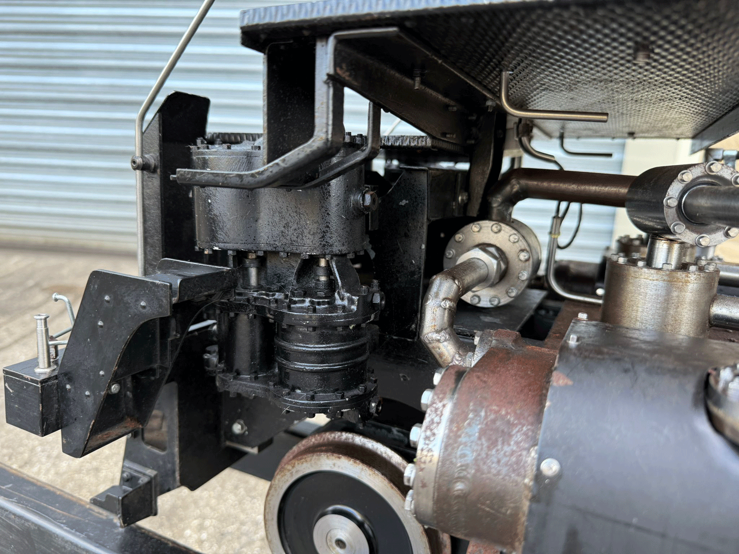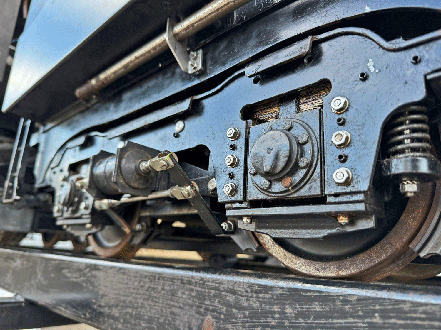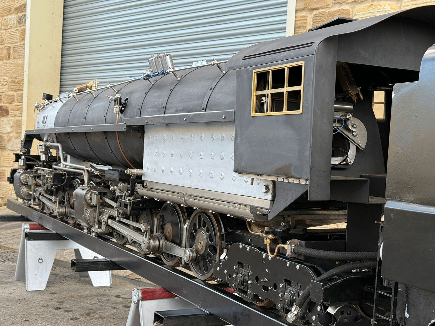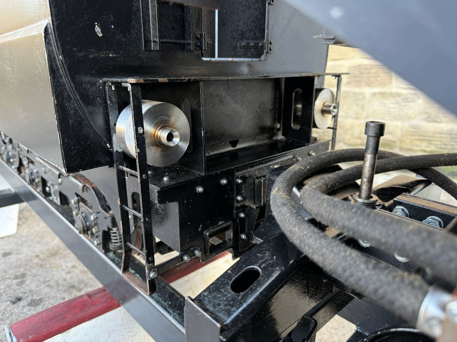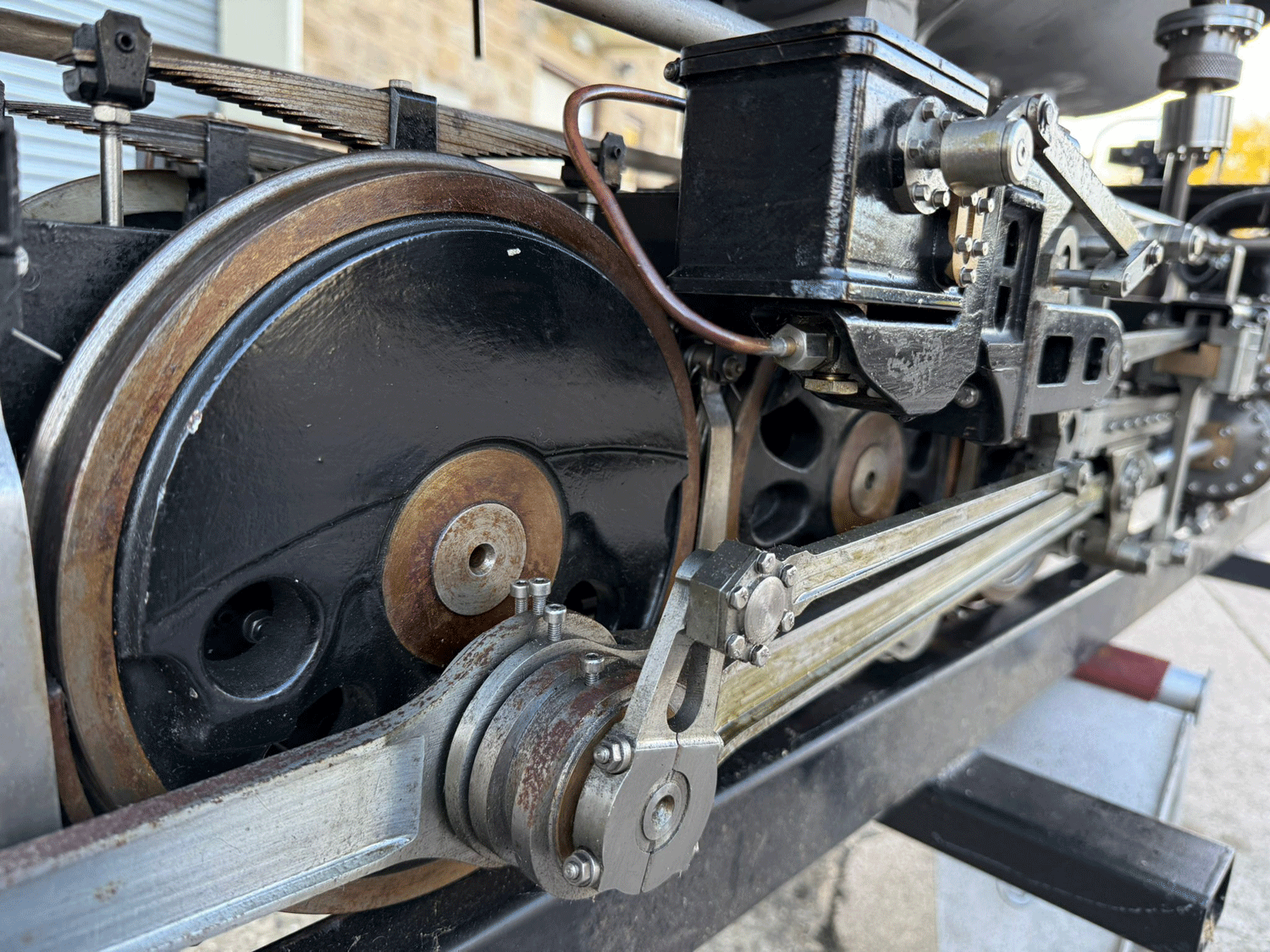 The correctly shaped boiler is steel with expanded in steel tubes, and is professionally (and nicely) made with all the important certification and paperwork. The bottom end is all there, and has run on air, and has also been tested around the track to make sure everything rolls, bends and follows the track as it should!