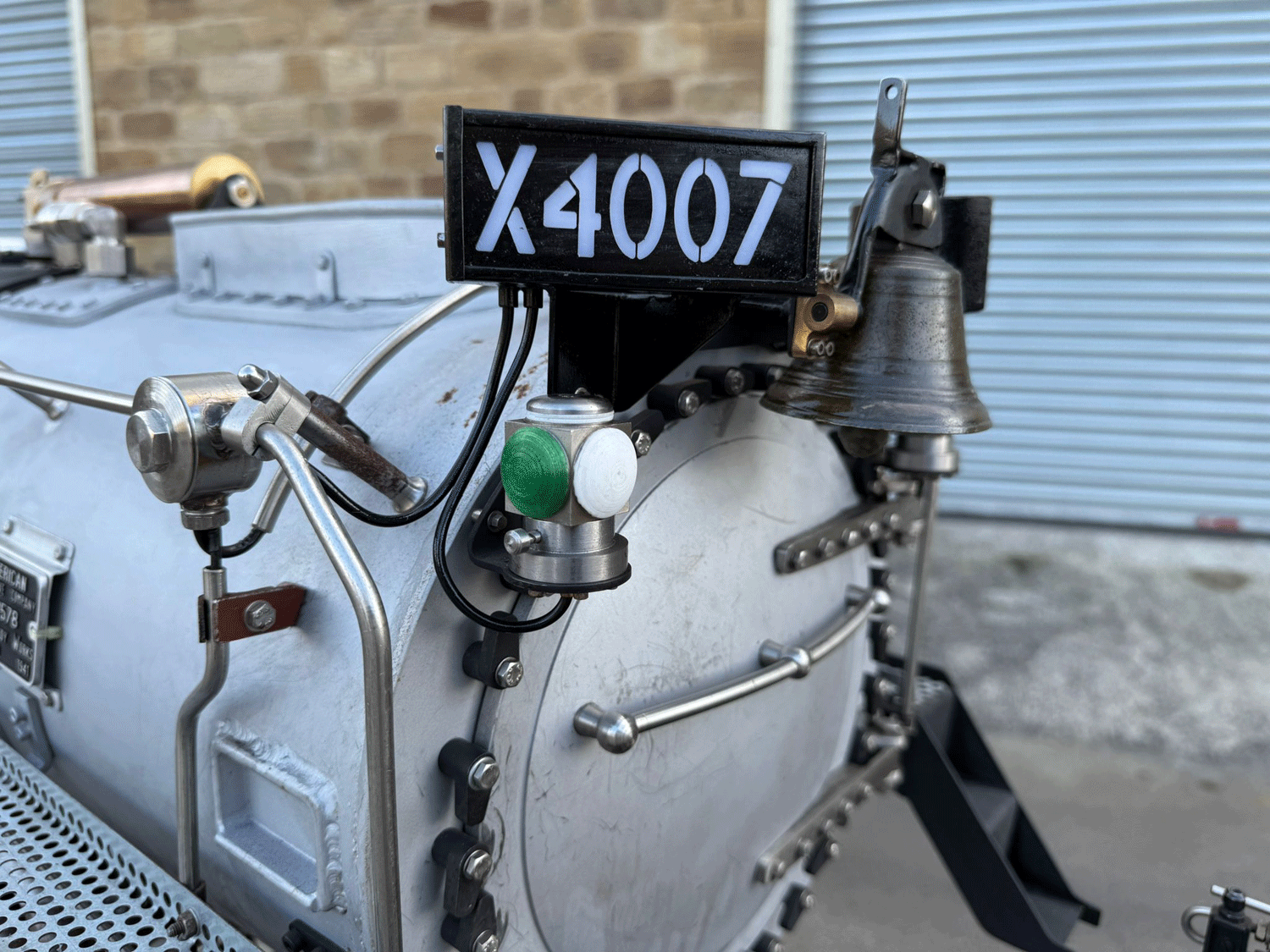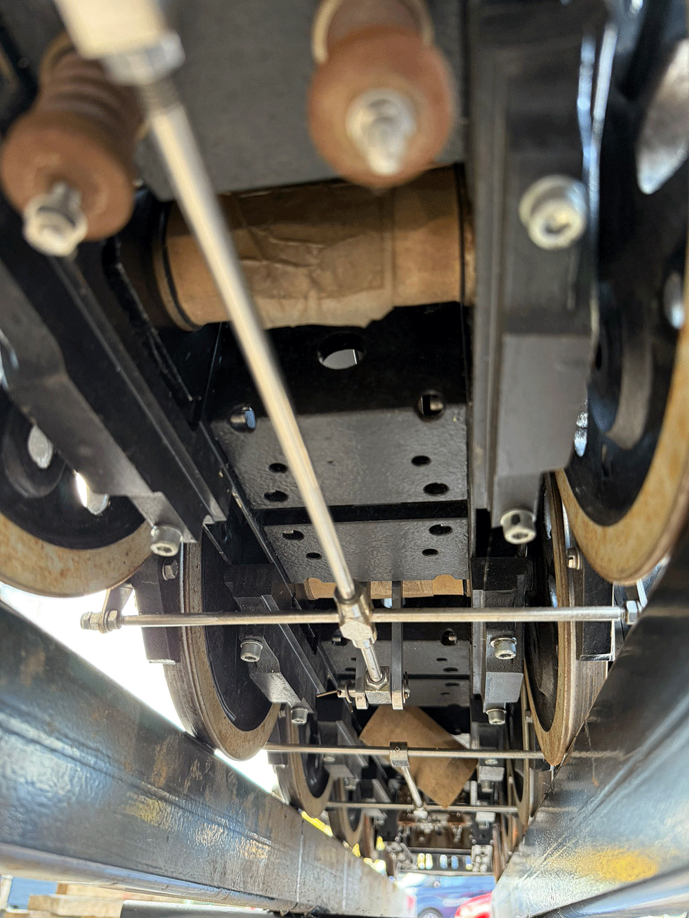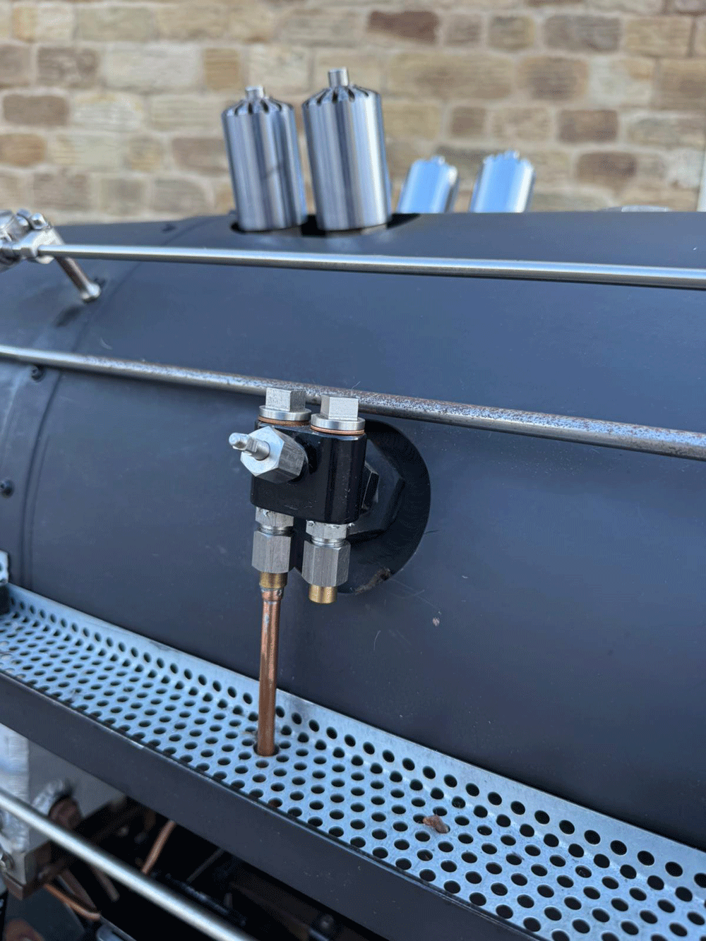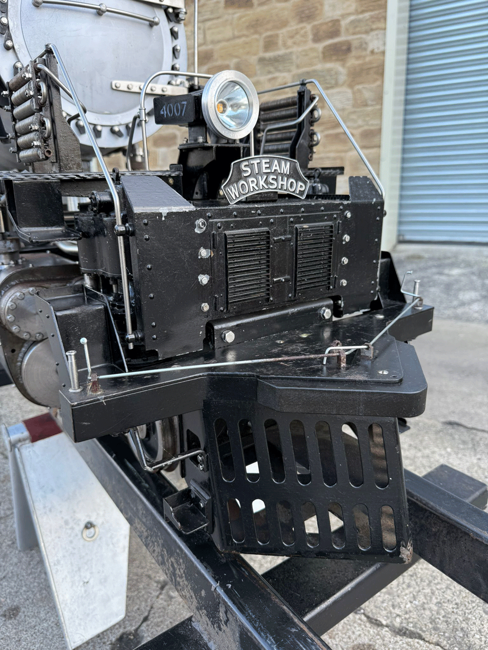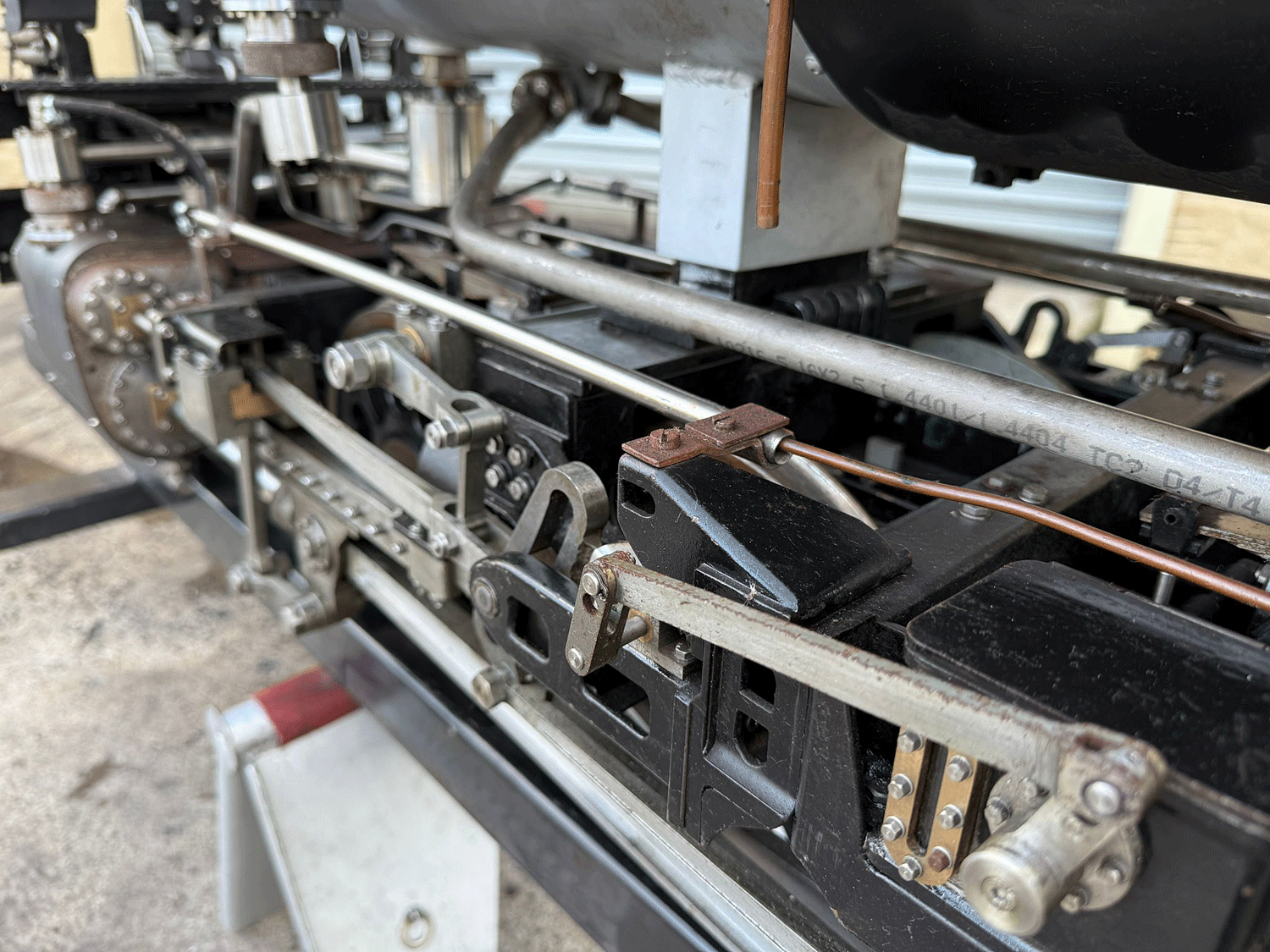 The correctly shaped boiler is steel with expanded in steel tubes, and is professionally (and nicely) made with all the important certification and paperwork. The bottom end is all there, and has run on air, and has also been tested around the track to make sure everything rolls, bends and follows the track as it should!