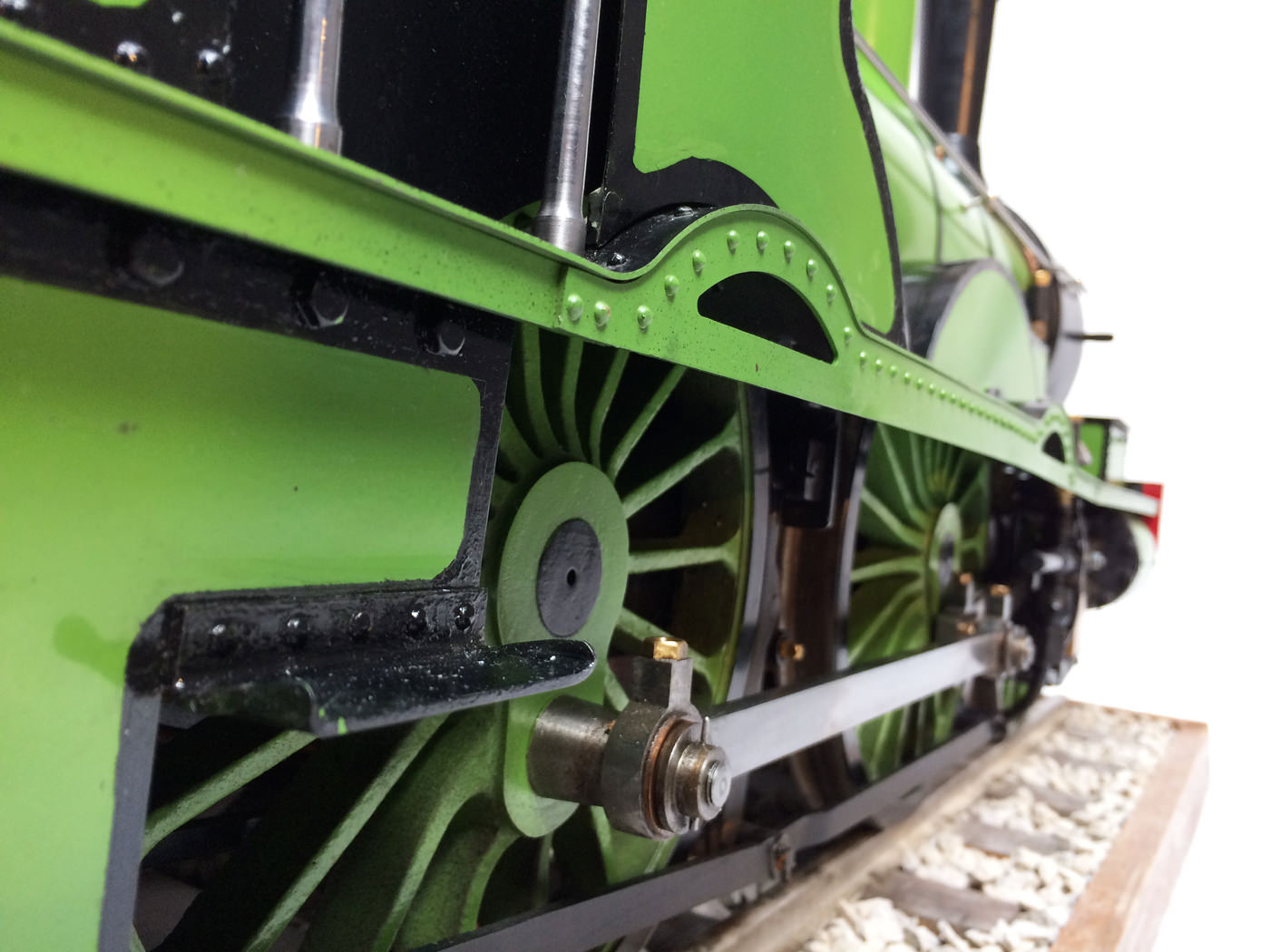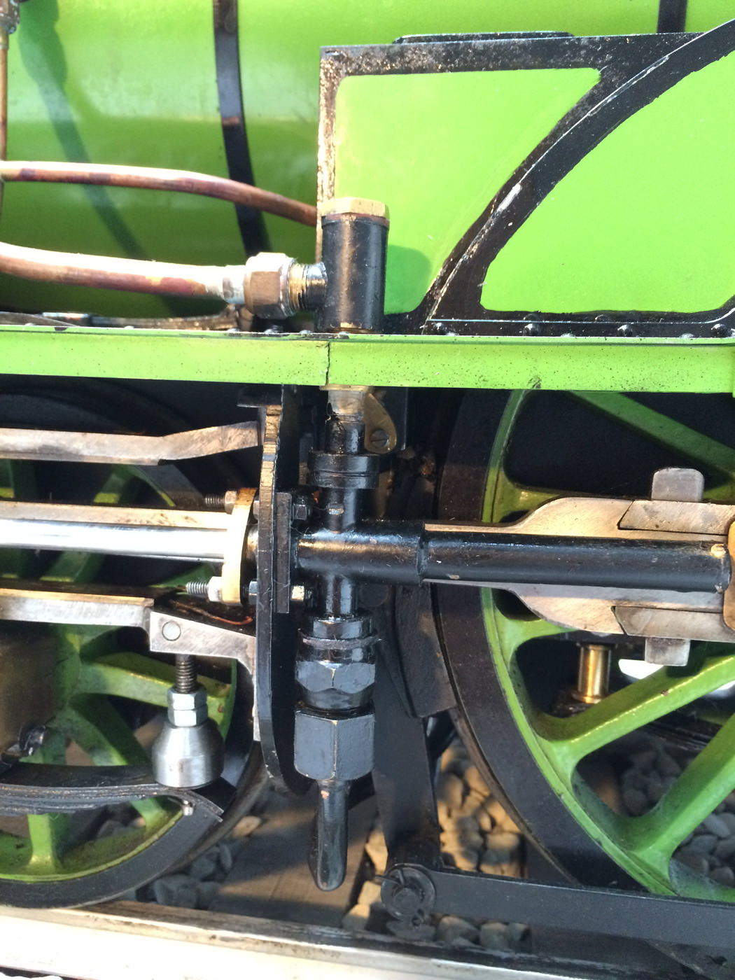The usual bits and bobs are there, there is an injector, twin crosshead feedwater pumps with footplate mounted bypass valves.  Lubrication is mechanical and hidden in the usual place under the front footplate.  Although in good overall condition, the black edging to the paintwork is a little 'feathery' in places.  Nothing that couldn't be improved with relatively little input though and she certainly looks the part!