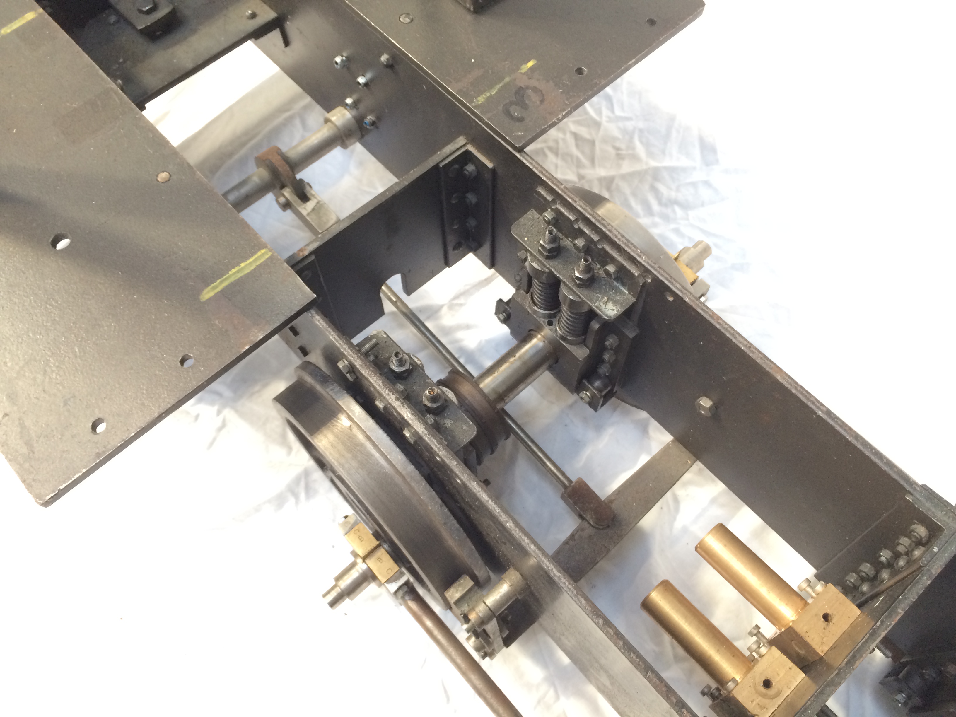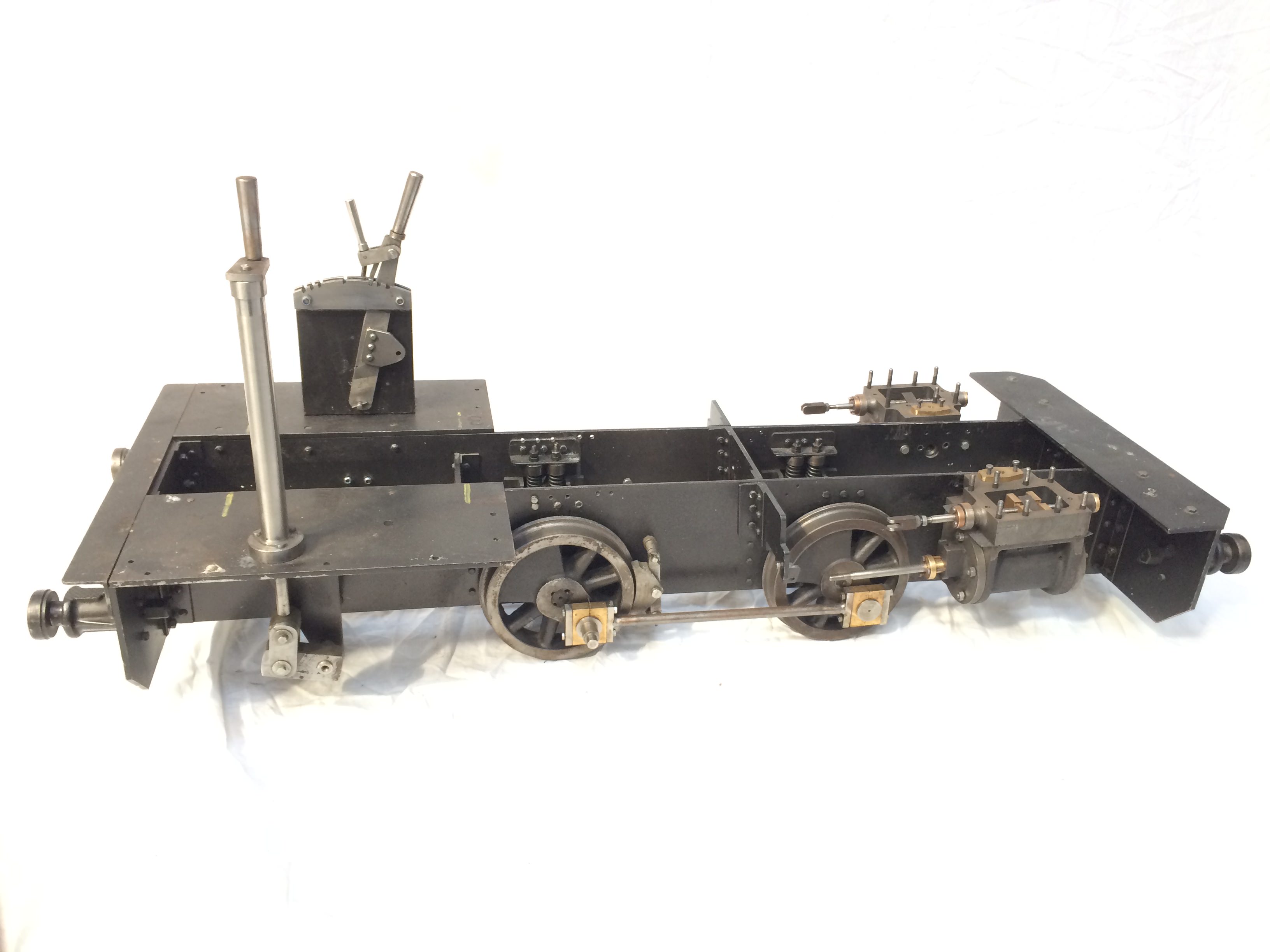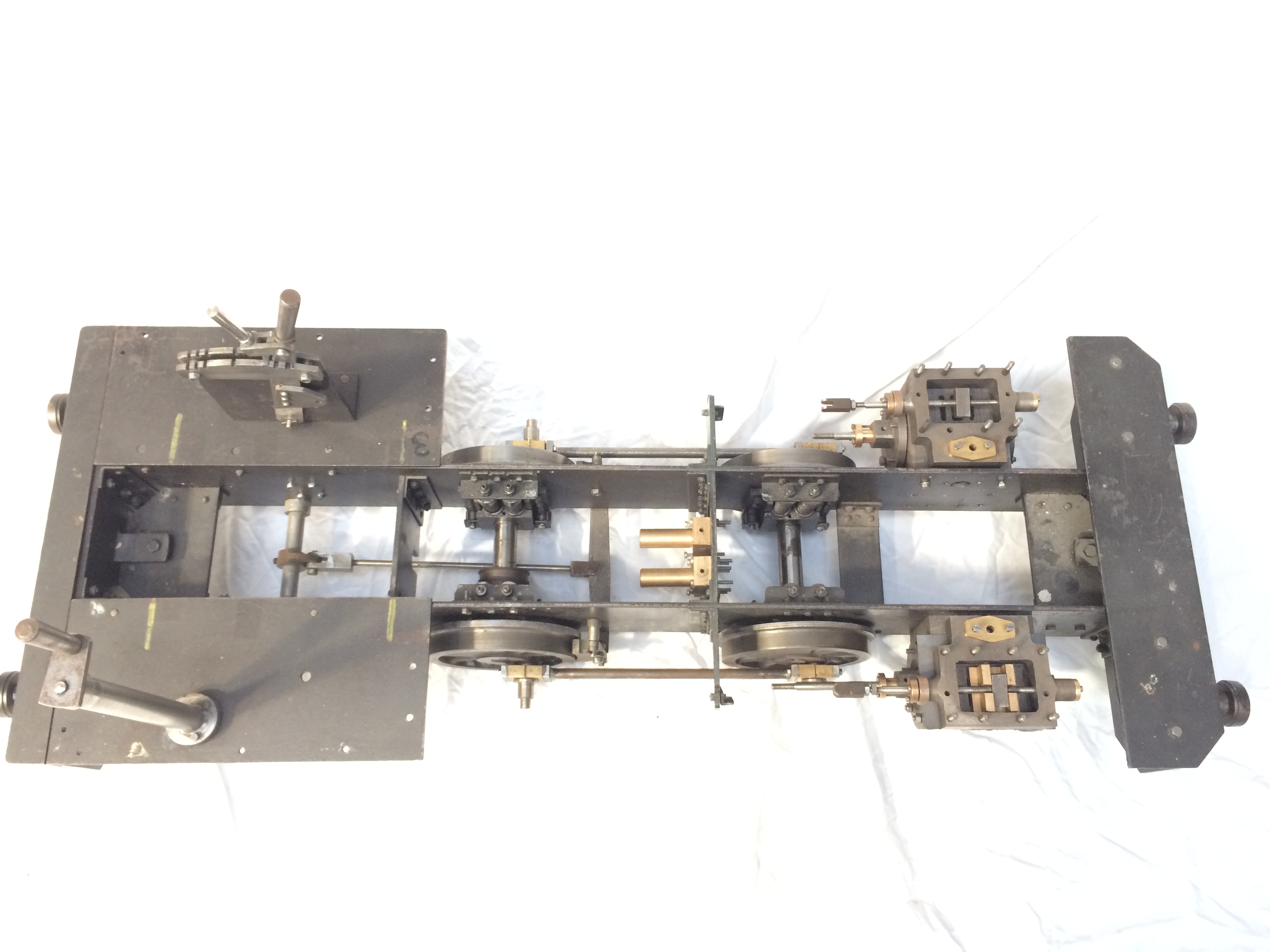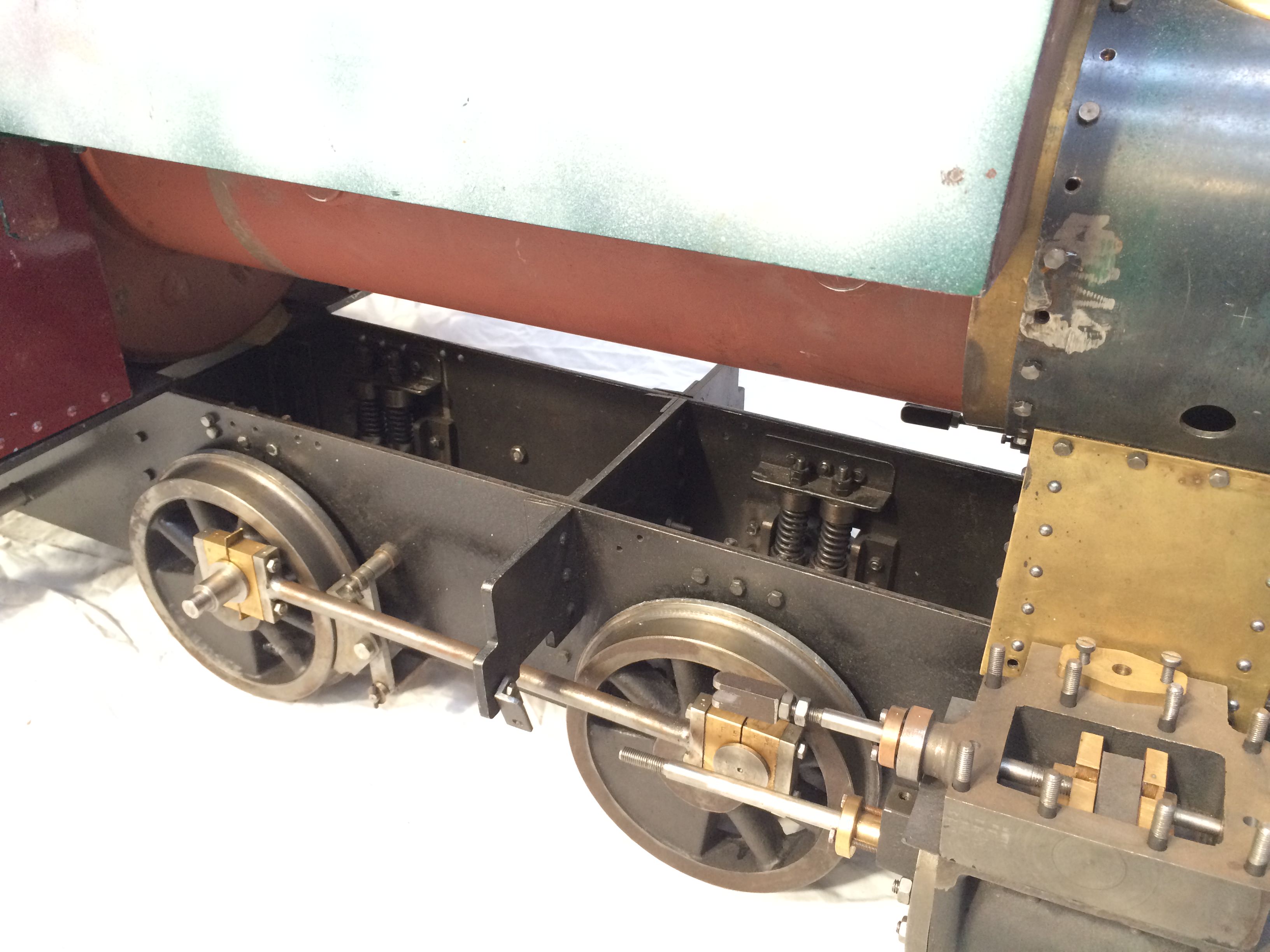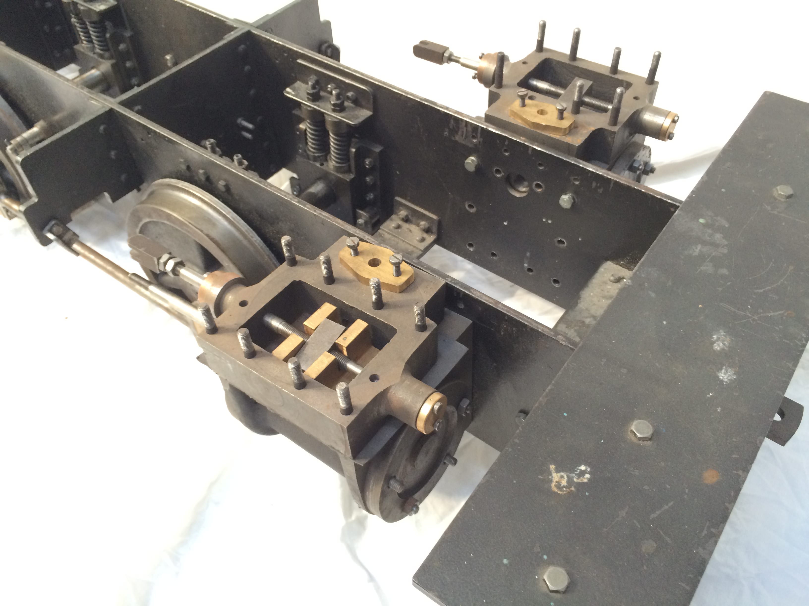 All the main bits are there, the boiler is a professional job from Harry Holt with all the associated paperwork.  The bottom end is unassembled, but again all the major components are there to make her into an air running chassis without too much drama.  The chassis is rolling, and as you will be able to see from the photos, the majority of the valve gear is done and it seams ready to fit.  The cylinders are machined and fitted to the frames with the pistons having been fitted too.  The valves are there, and the guides, glands and end caps are also in place.  Cosmetically the smokebox is ostensibly finished, as is the cab and saddle tank.  Really, this is well on the way, certainly all the hard work is behind you, and it could be a running loco with very little input.