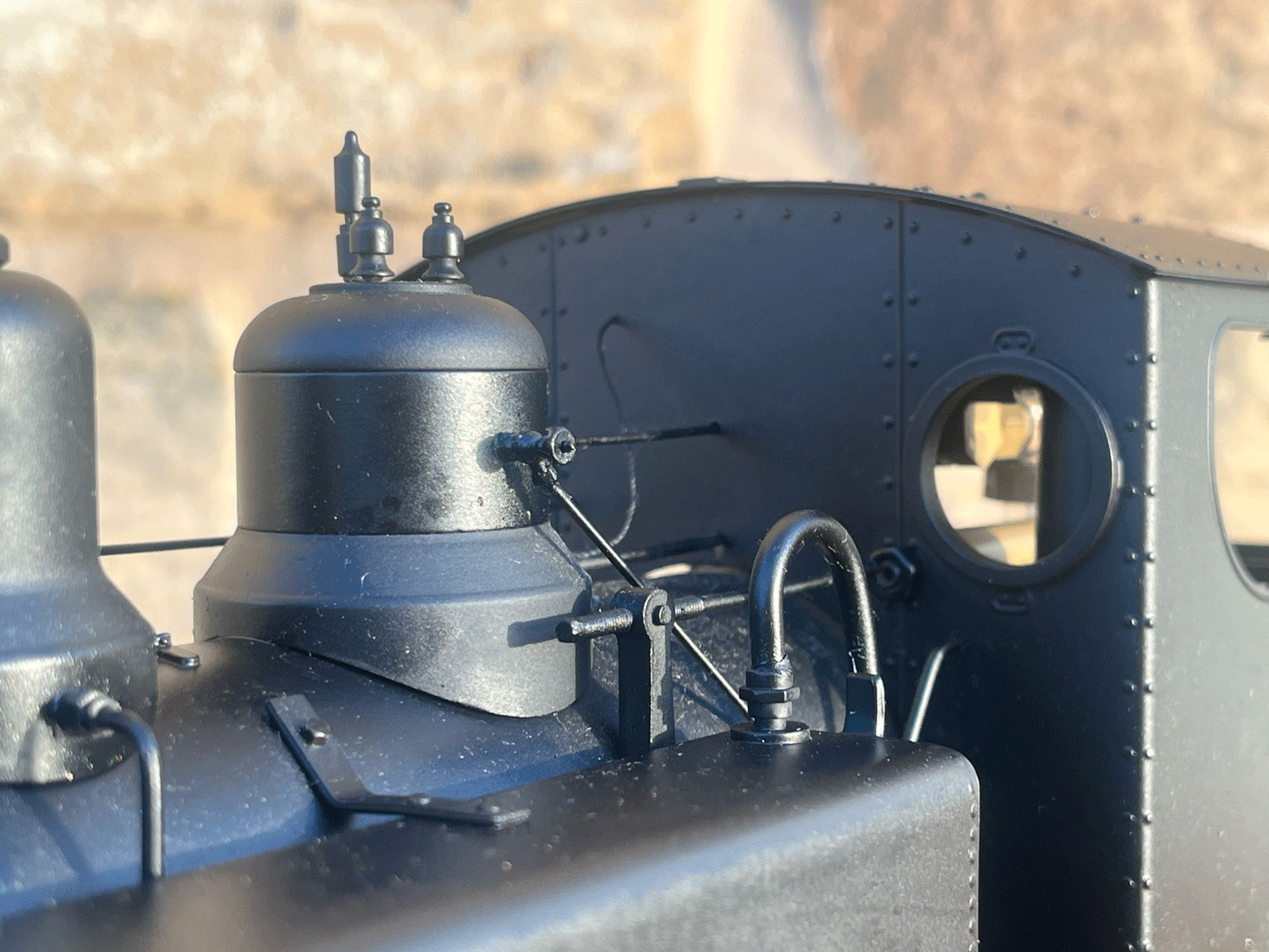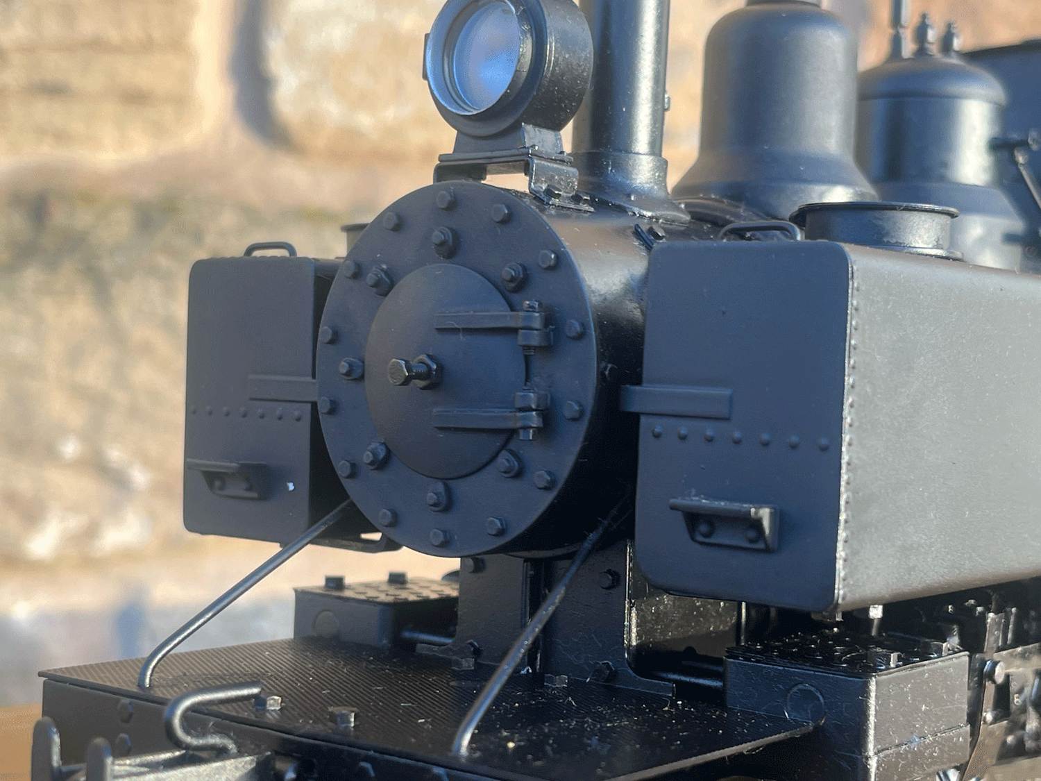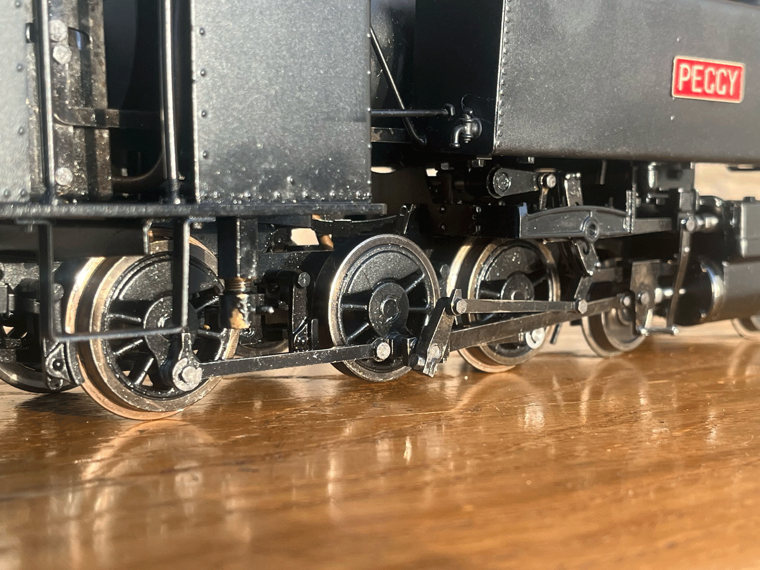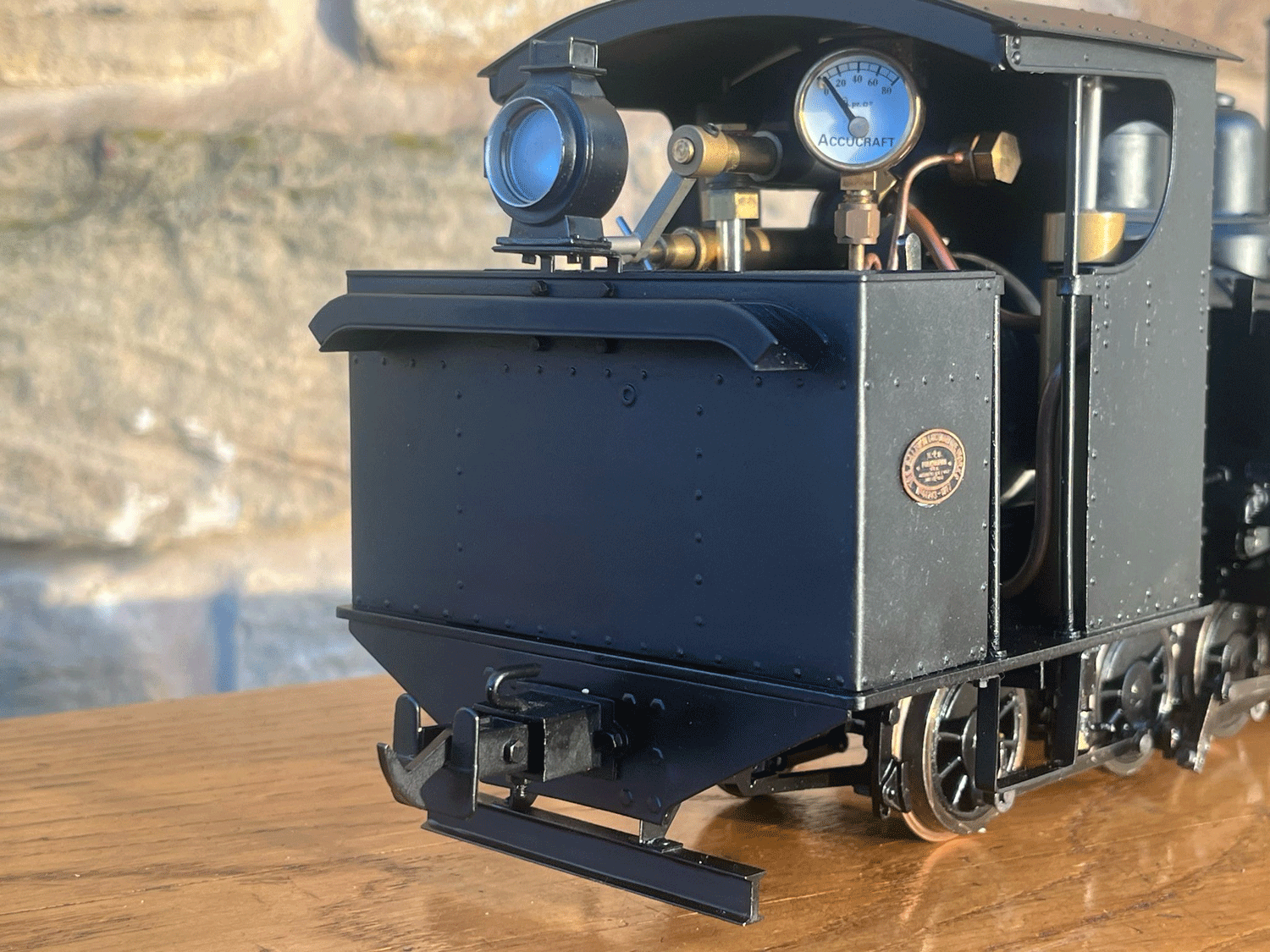 Here we have a 45mm Baldwin 10-12-D 4-6-0. The model is internally gas fired and is constructed from etched brass and stainless steel. The model was only ever available in manual control version. The boiler is fitted with a water gauge glass. The locomotive comes fitted with Accucraft standard square headed chopper couplings. The wheels are insulated as standard. The cab roof lifts up and tilts sideways to give easy access to the cab interior.