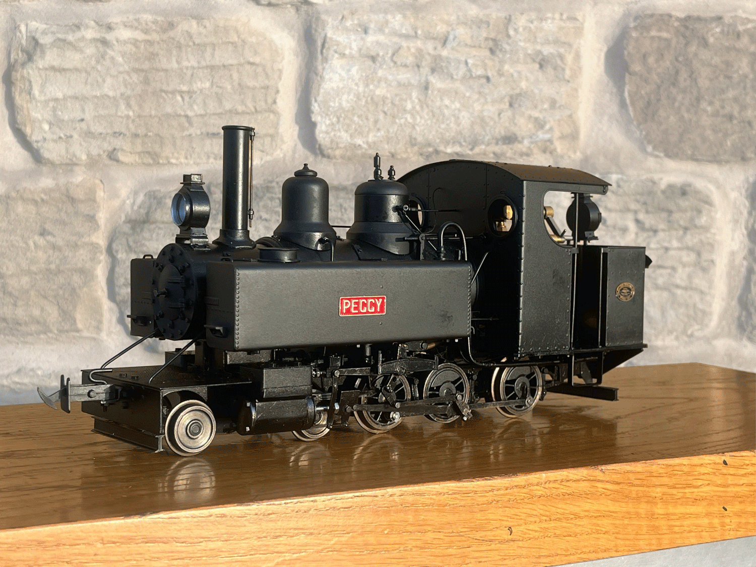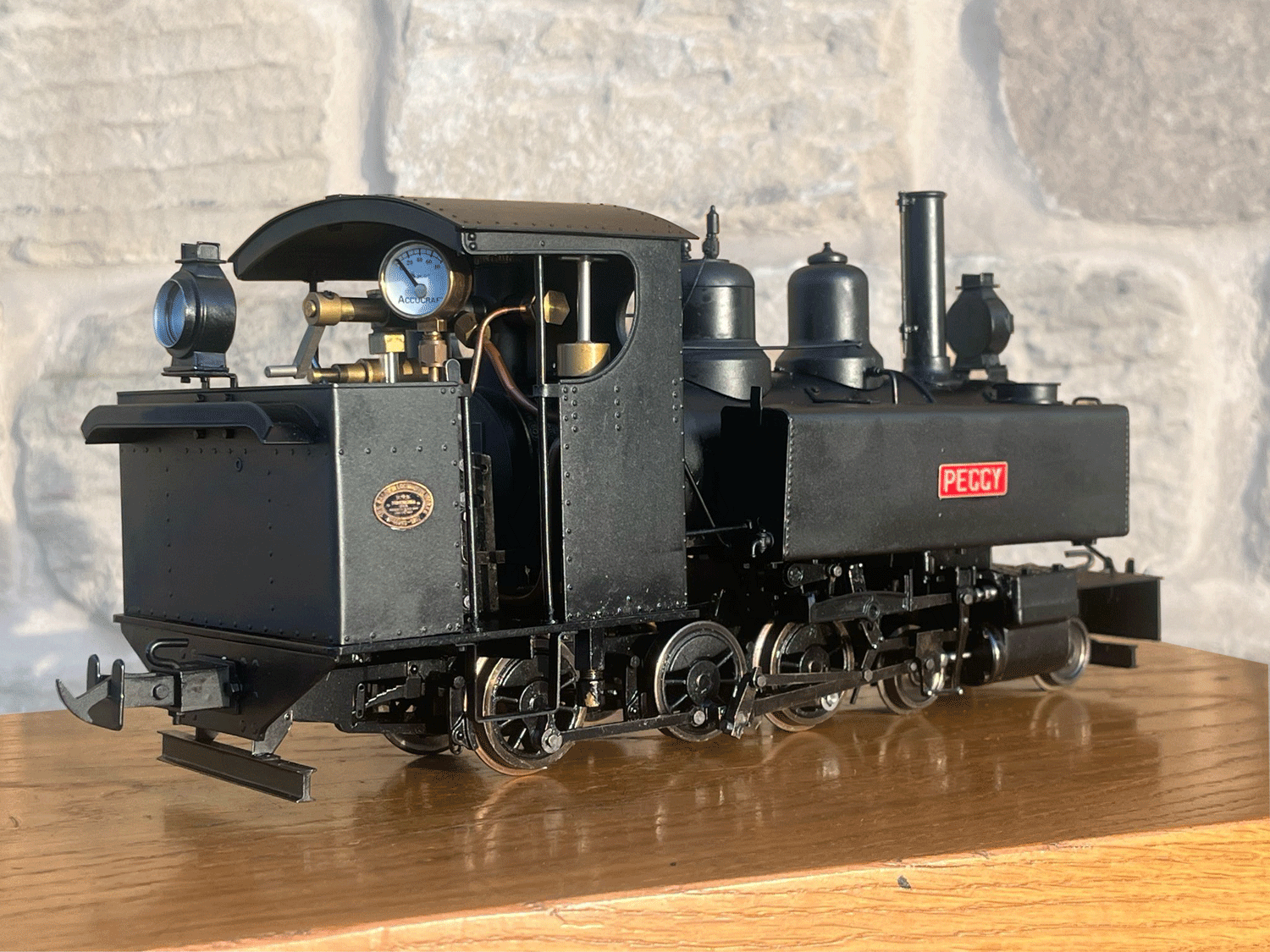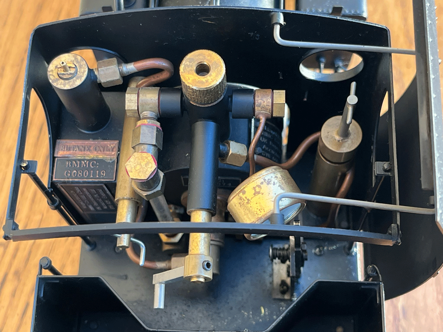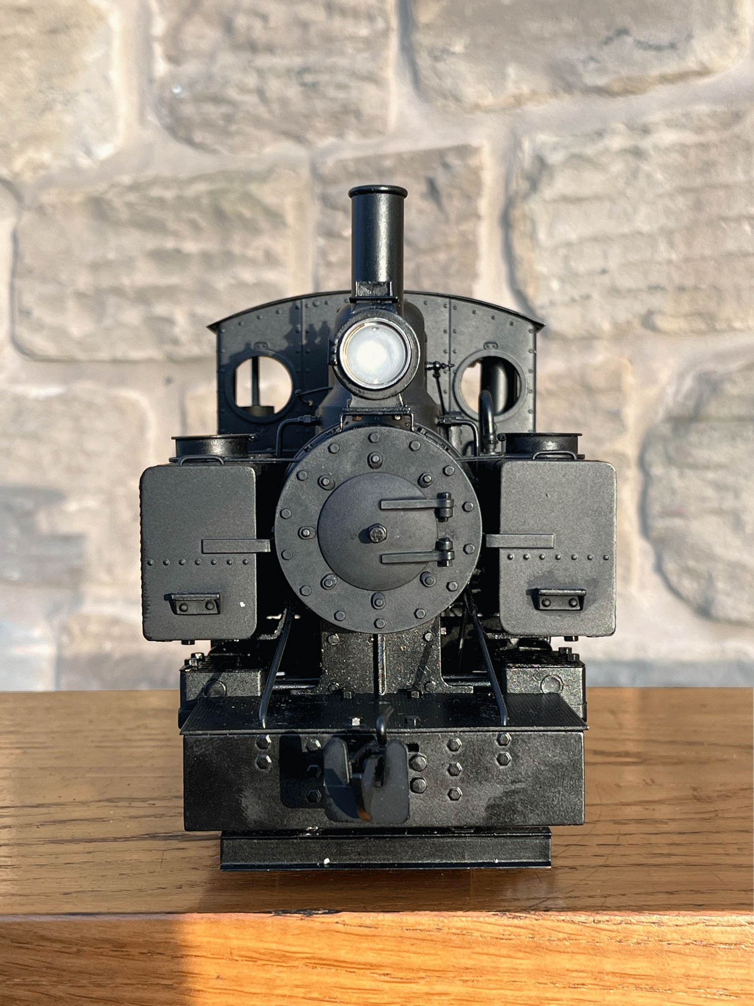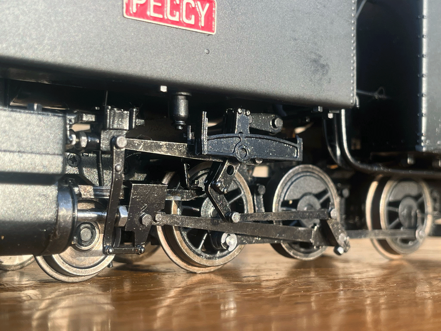 Here we have a 45mm Baldwin 10-12-D 4-6-0. The model is internally gas fired and is constructed from etched brass and stainless steel. The model was only ever available in manual control version. The boiler is fitted with a water gauge glass. The locomotive comes fitted with Accucraft standard square headed chopper couplings. The wheels are insulated as standard. The cab roof lifts up and tilts sideways to give easy access to the cab interior.