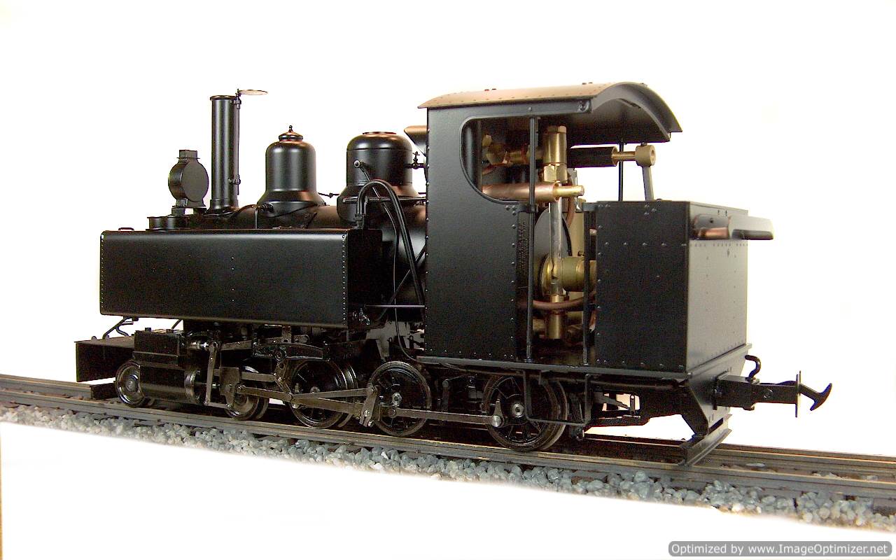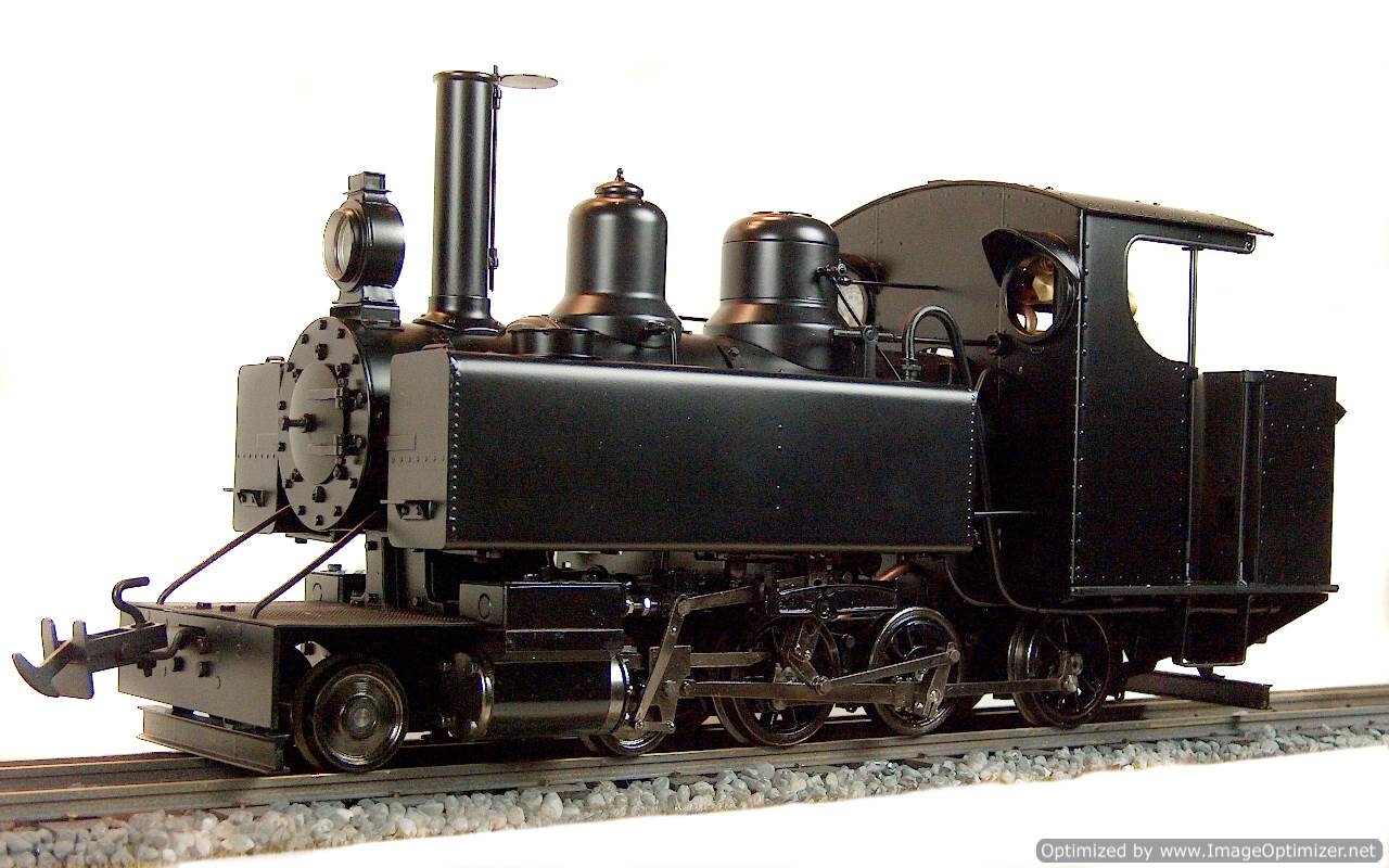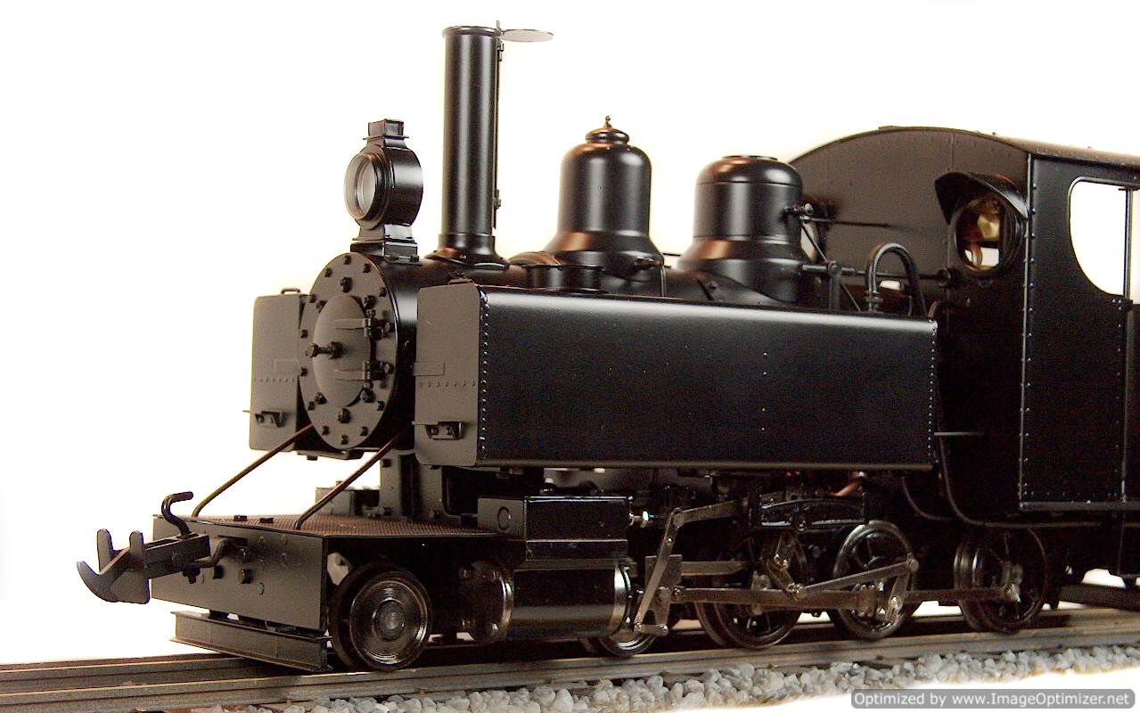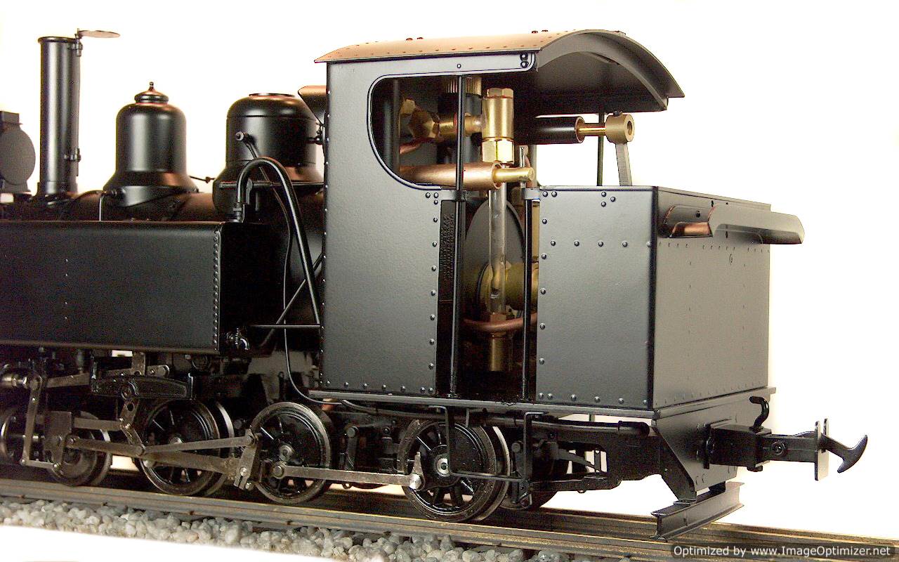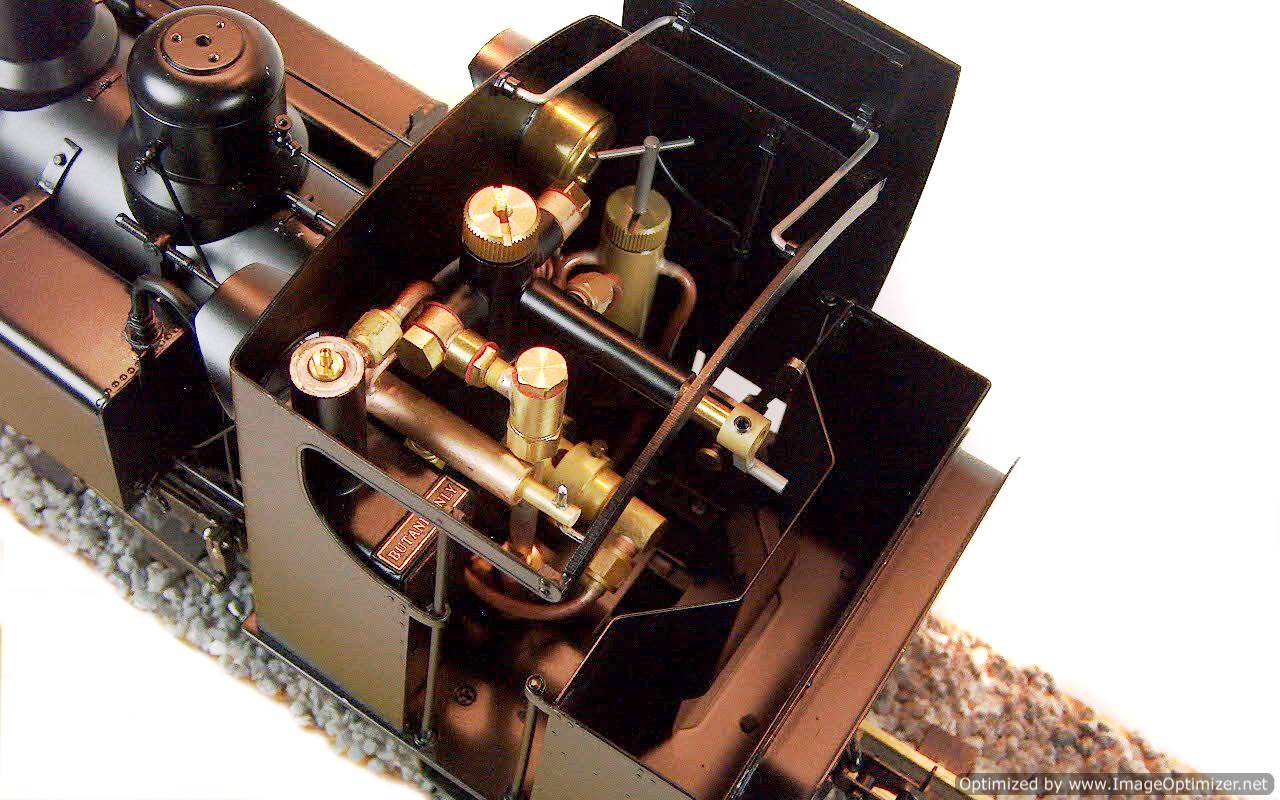 The model is internally gas fired and is constructed from etched brass and stainless steel. The model is only available in manual control version. The standard colour is satin black. Versions for 32mm and 45mm gauges are available. As the gas capacity is larger than the water capacity, a boiler top up system will be supplied. The boiler is fitted with a water gauge glass. The locomotive comes fitted with Accucraft's standard square headed chopper couplings. The wheels are insulated as standard. The cab roof lifts up and tilts sideways to give easy access to the cab interior.