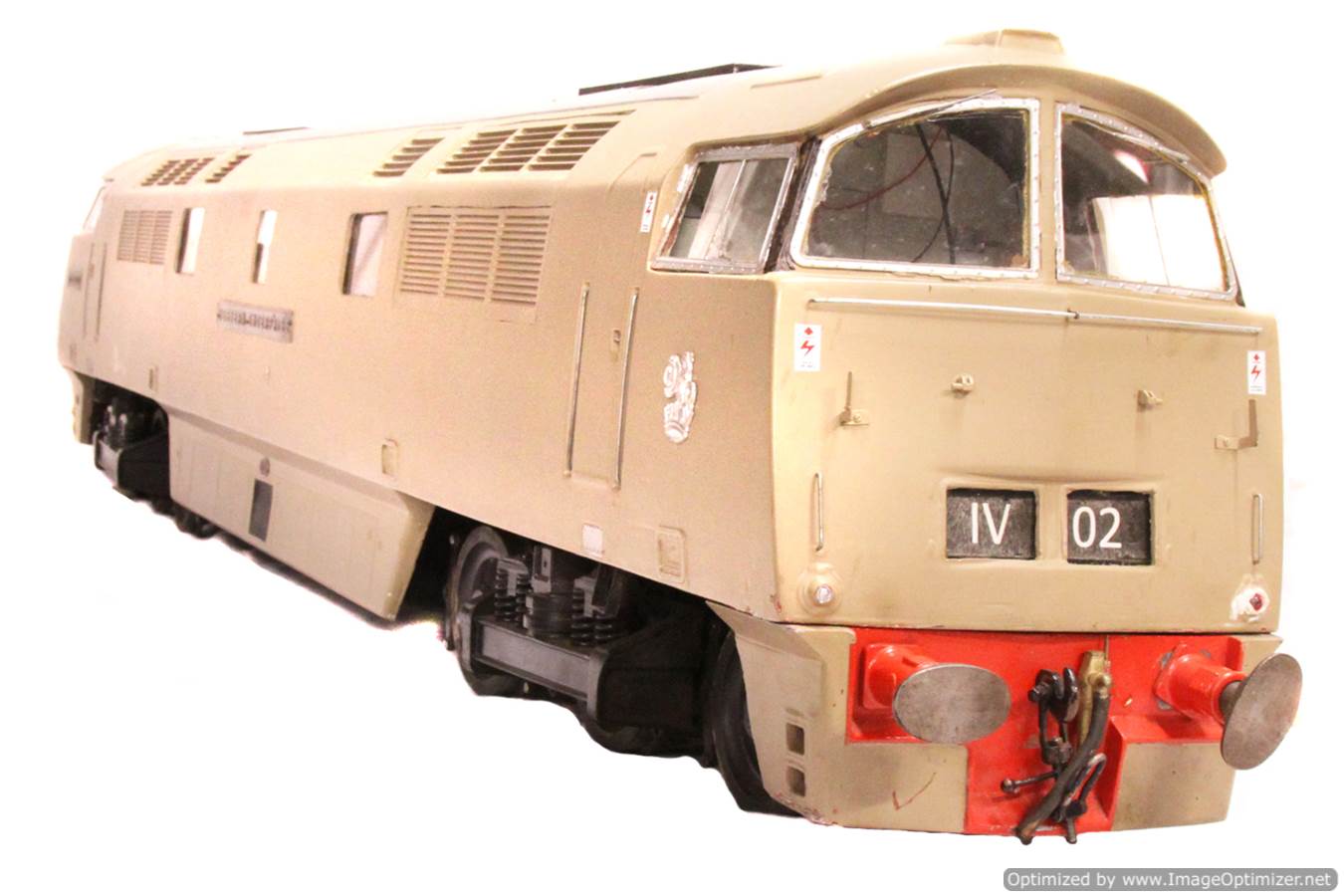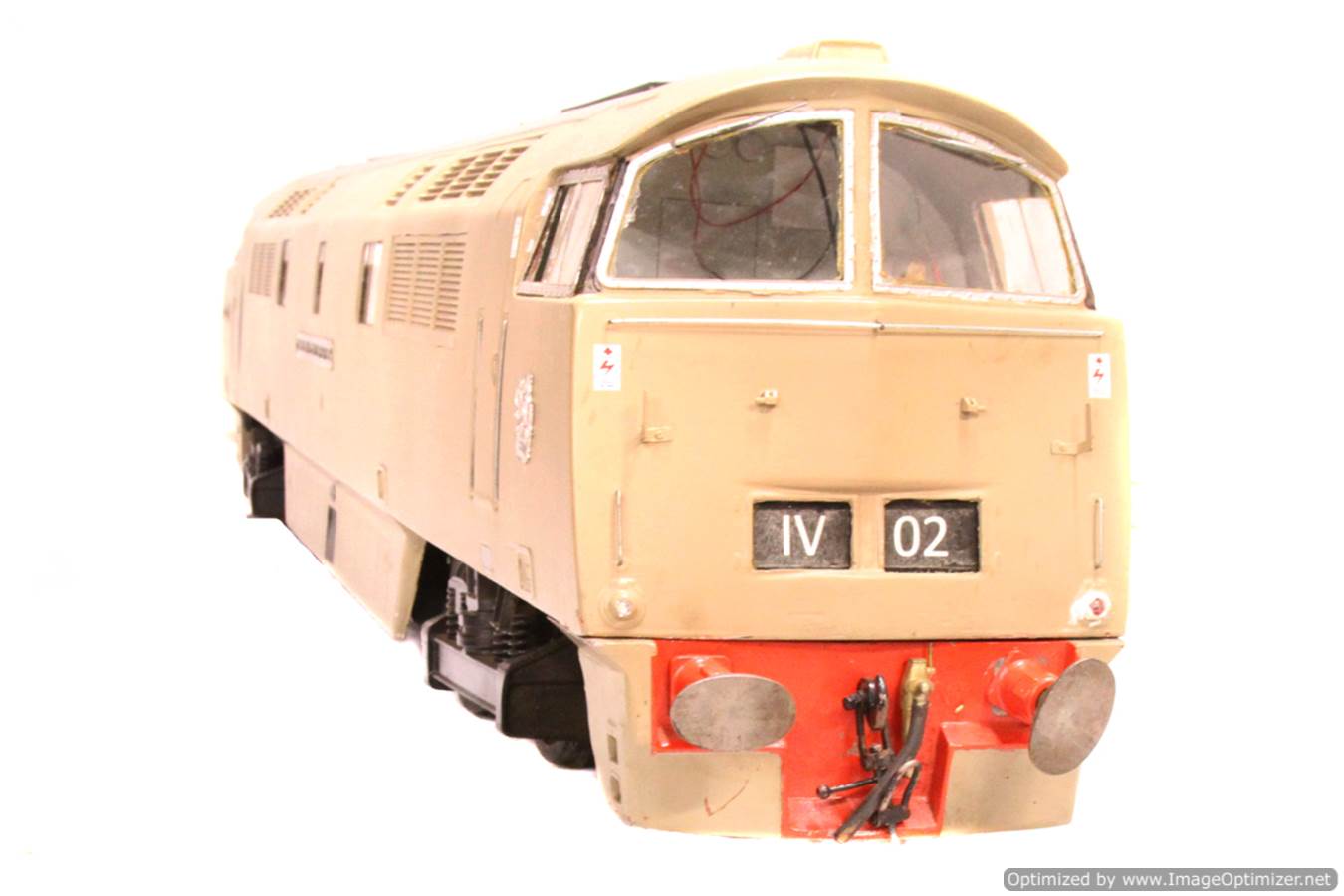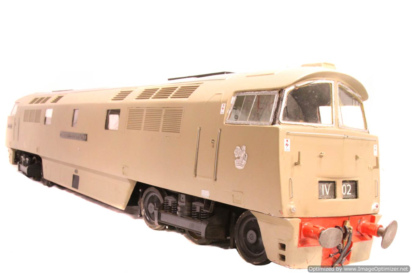 Here we have a nicely presented Class 52 Western Hydraulic diesel by Phoenix. Cable controlled and fitted with a sound system, there is already a little bit of extra detailing fitted and she's finished in the handsome (if short lived) sand livery.