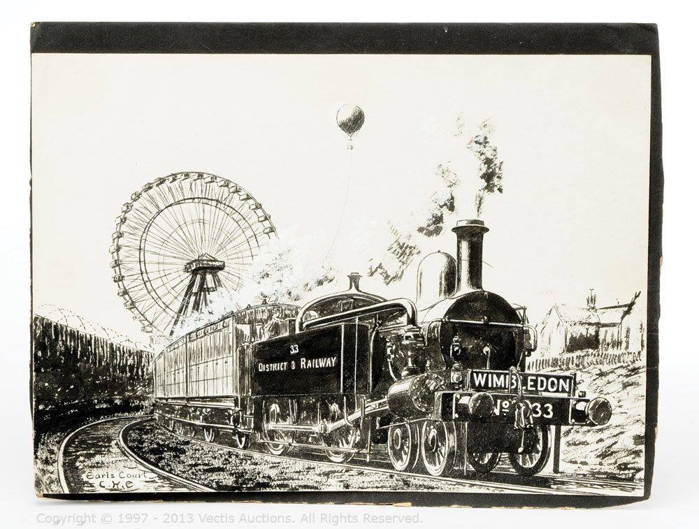 Original artwork 'Earls Court' depicting a Wimbledon bound district railway 4-4-0 number 33 tank locomotive pulling a passenger train, with a Ferris wheel and tethered balloon from the amusement park behind.  Paper mounted on card with hand written legend verso 'Steam on the London Underground District Line train leaving Earls Court about 1900.  I'm not sure of the date; about the time the exhibition balloon blew on to the great wheel and bust' which appears to be written by Hamilton Ellis himself.  It is unframed, and it's Excellent.