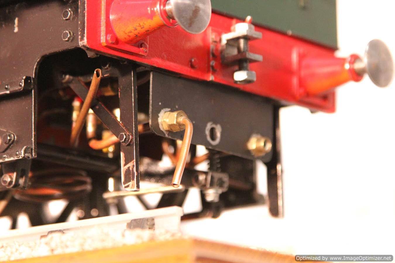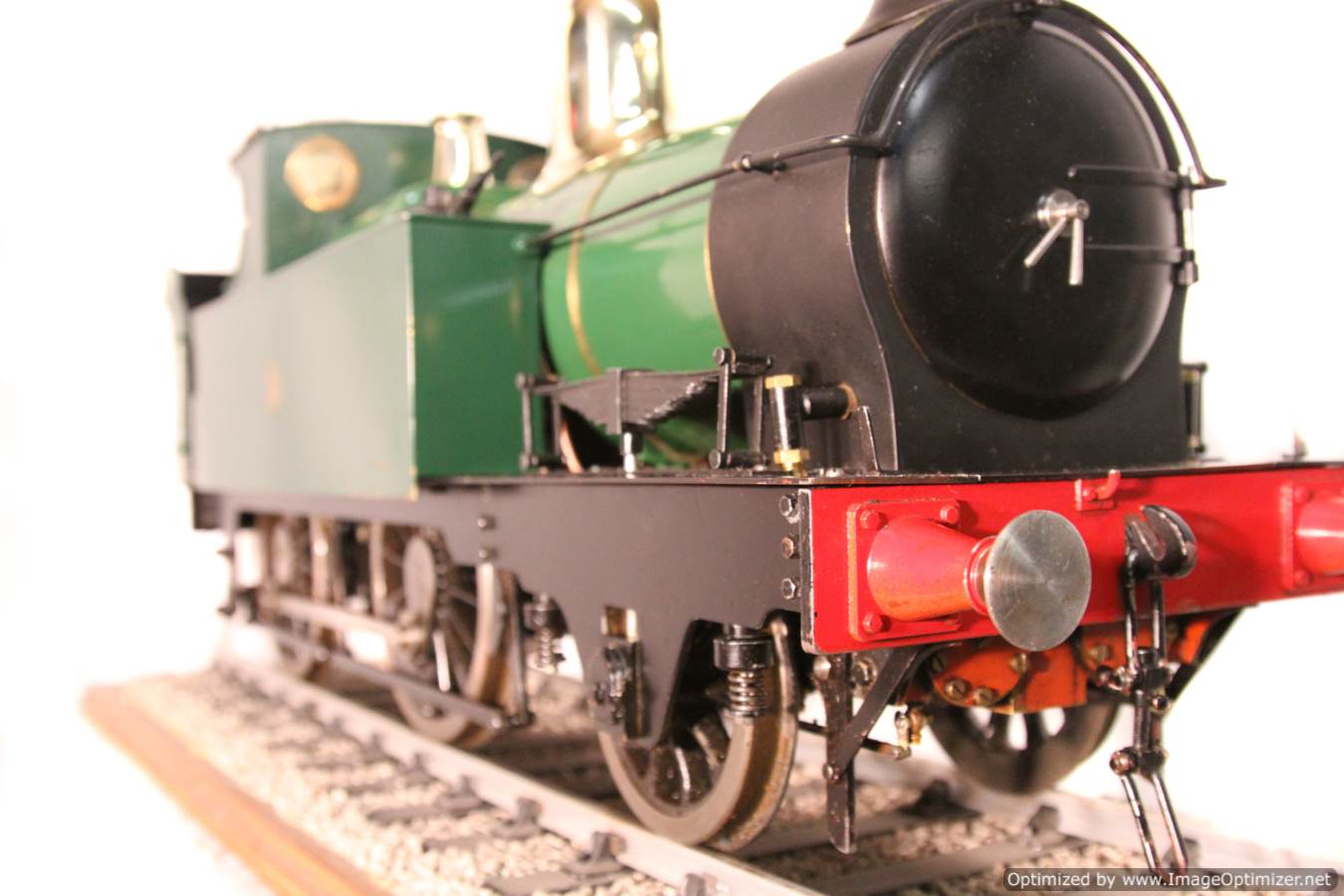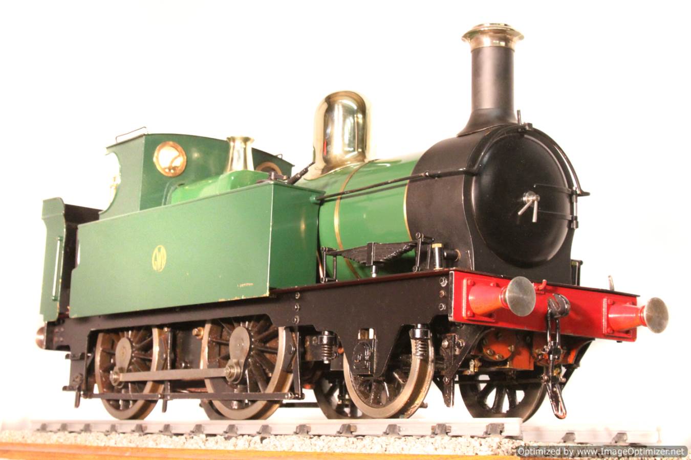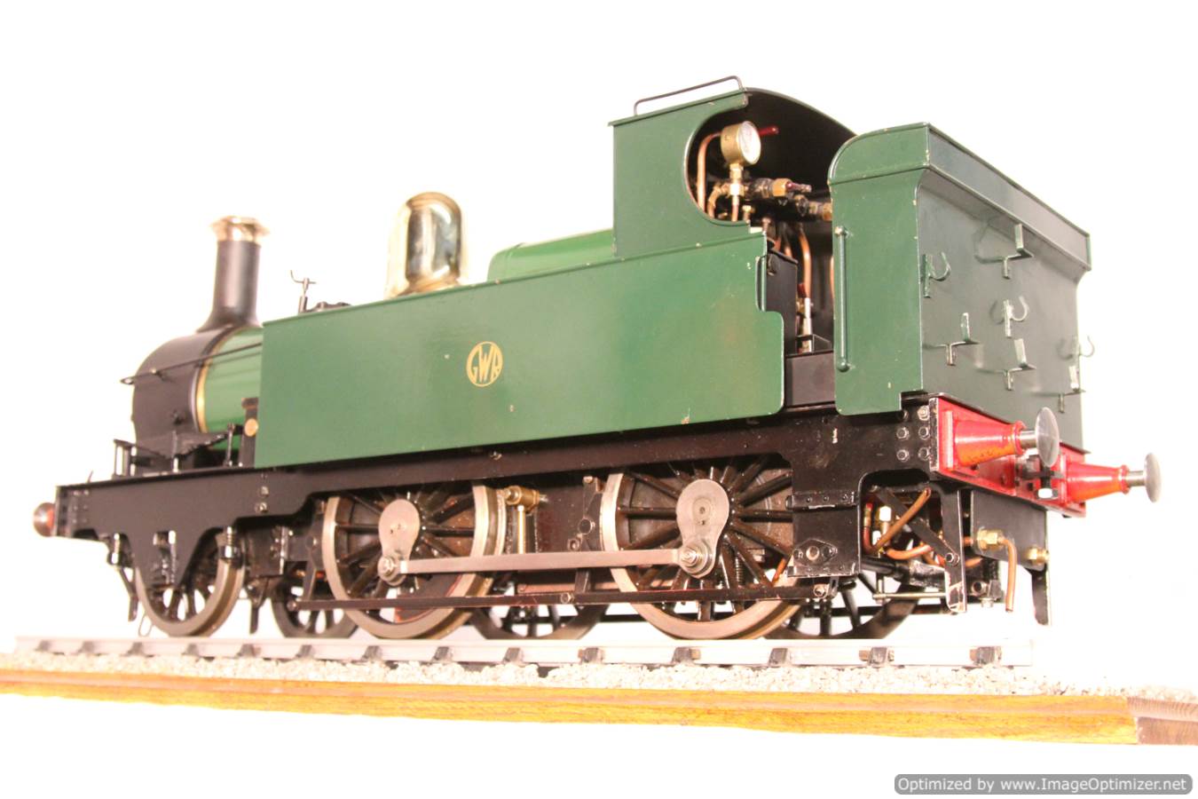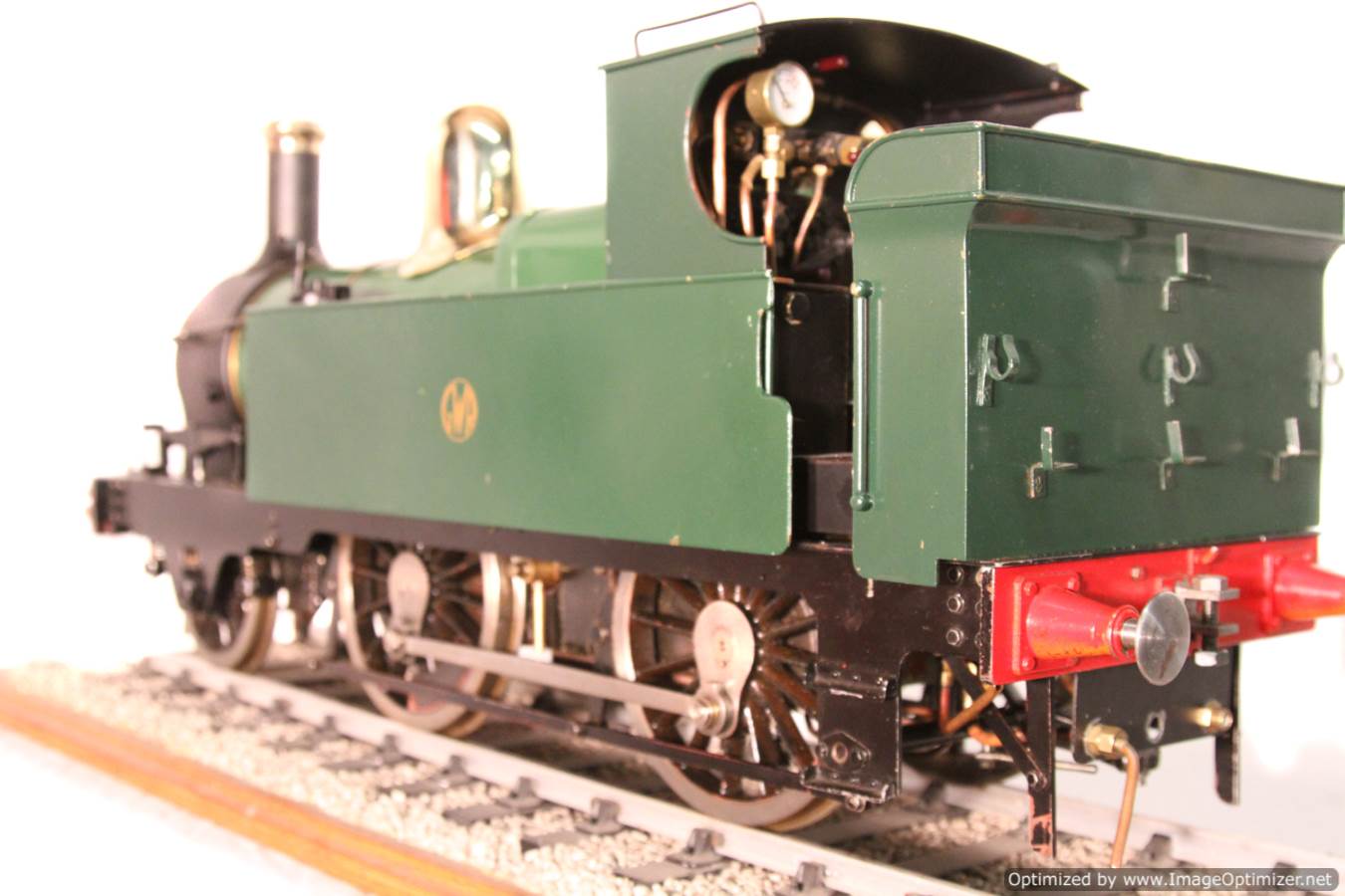 Here we have a nice example of the 5" gauge GWR 'metro' 2-4-0 tank. This is a crisp and competently made and machined model, that performs as well as it looks like it should. Made with a view toward running rather than excessive detail, everything has that satisfying combination of tightness but free movement. She is fitted with two injectors set up to be fed from a riding truck to keep the water cold, (the tanks are currently dry,..... and awaiting extra weight to be added if you should feel the need!). Lubrication is displacement, and again is well designed. There is a large reservoir below the footplate, with a good size condensing coil to turn the supply steam back into water. There is a long lever arm on the drain valve so that it is easy to operate, and an easy to see sight feed on the footplate.