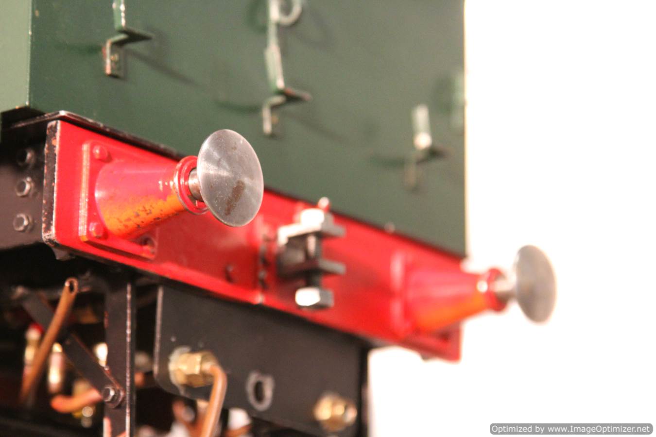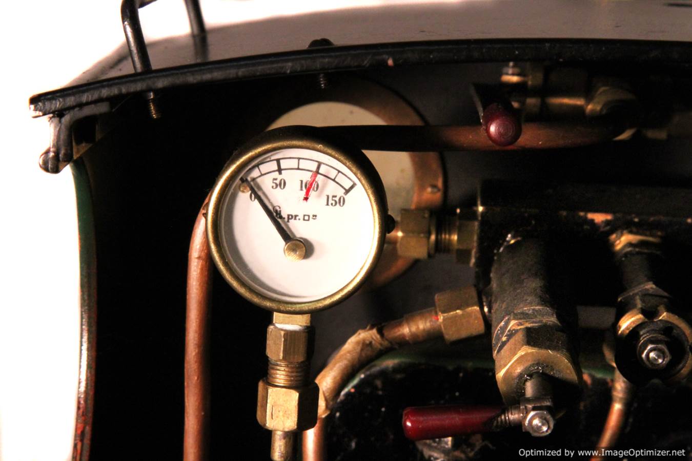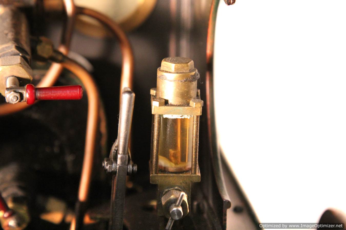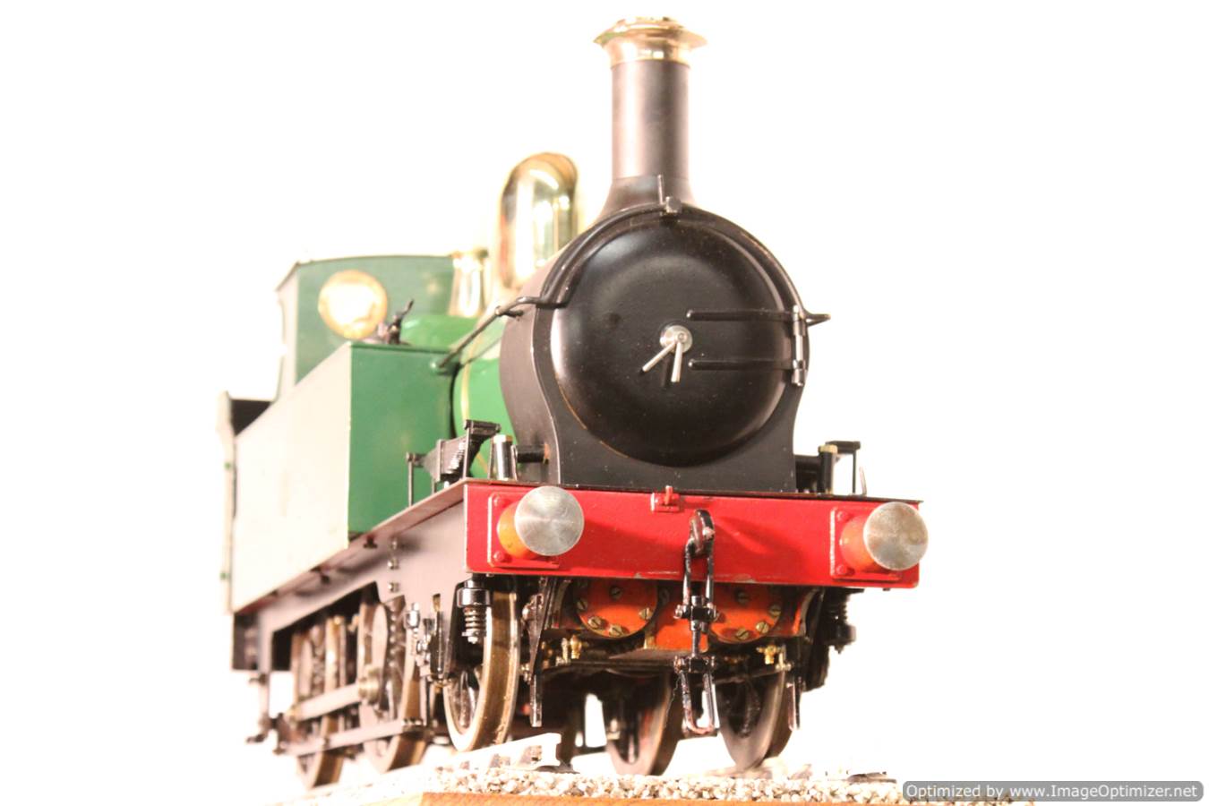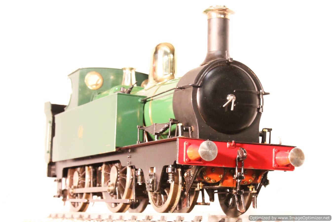 Here we have a nice example of the 5" gauge GWR 'metro' 2-4-0 tank. This is a crisp and competently made and machined model, that performs as well as it looks like it should. Made with a view toward running rather than excessive detail, everything has that satisfying combination of tightness but free movement. She is fitted with two injectors set up to be fed from a riding truck to keep the water cold, (the tanks are currently dry,..... and awaiting extra weight to be added if you should feel the need!). Lubrication is displacement, and again is well designed. There is a large reservoir below the footplate, with a good size condensing coil to turn the supply steam back into water. There is a long lever arm on the drain valve so that it is easy to operate, and an easy to see sight feed on the footplate.