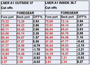 When the full forward lifting arm angle of 37o is applied to the outside gear the nominal starting cut off of 75% (as specified) is obtained. The LNER auxiliary reach rod then applies 39.27o to the inner lifting arm, which in concert with the different inner gear elements exacerbates the problem of equalising inner to outer gears. The relative % differences assessed by comparing cut off curves is good, but the relative setting of inner to outer working ranges results in extra work from the inside cylinder – the Gresley ghost.