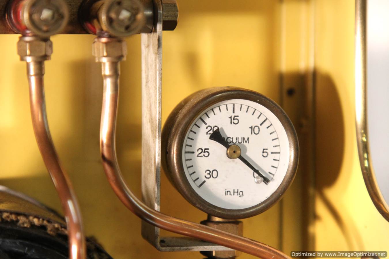 She is fitted with an injector and a mechanical axle driven pump, with of course a footplate mounted bypass valve. There is a big mechanical lubricator on the running boards and there is even a vacuum brake ejector fitted for running train brakes!