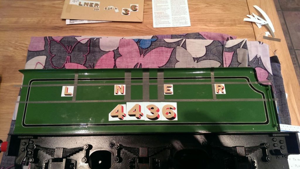 The lining can begin properly at this stage. The tender is first marked out by hand with a couple of thin guide paint lines between which the main black line can be filled in with a fine lining brush.