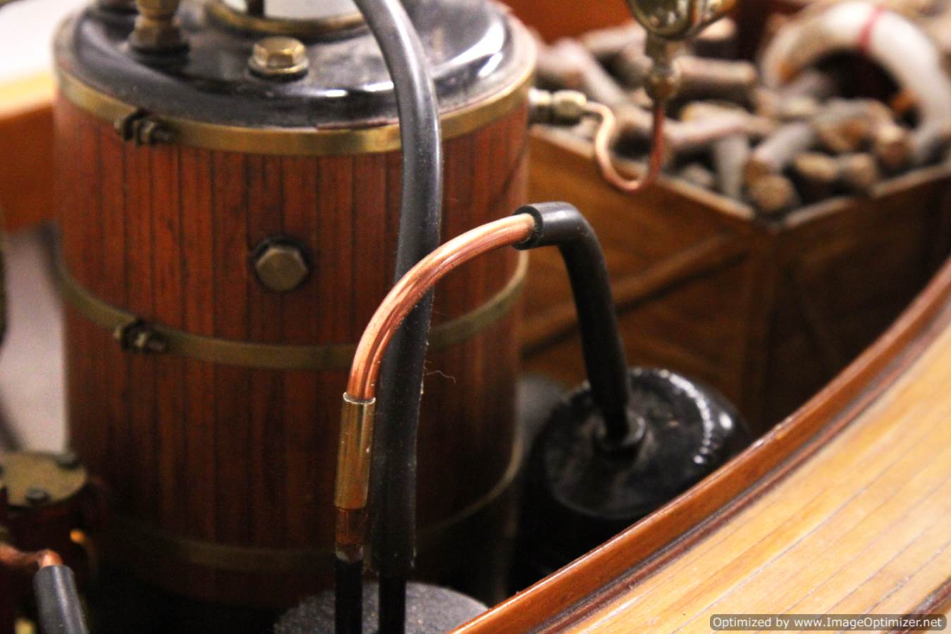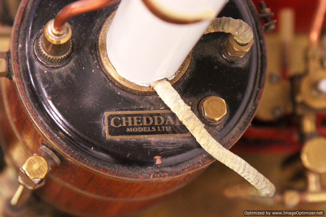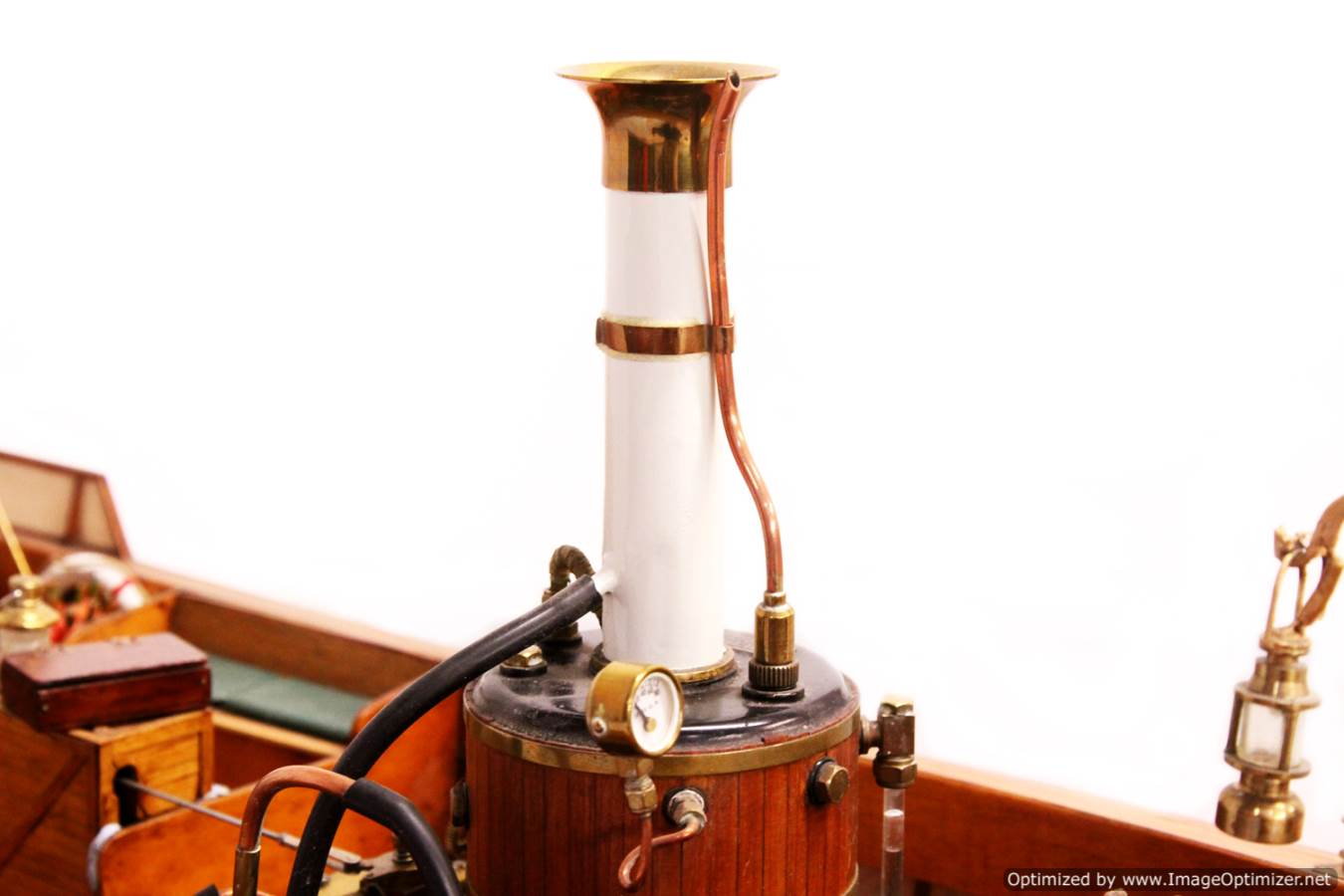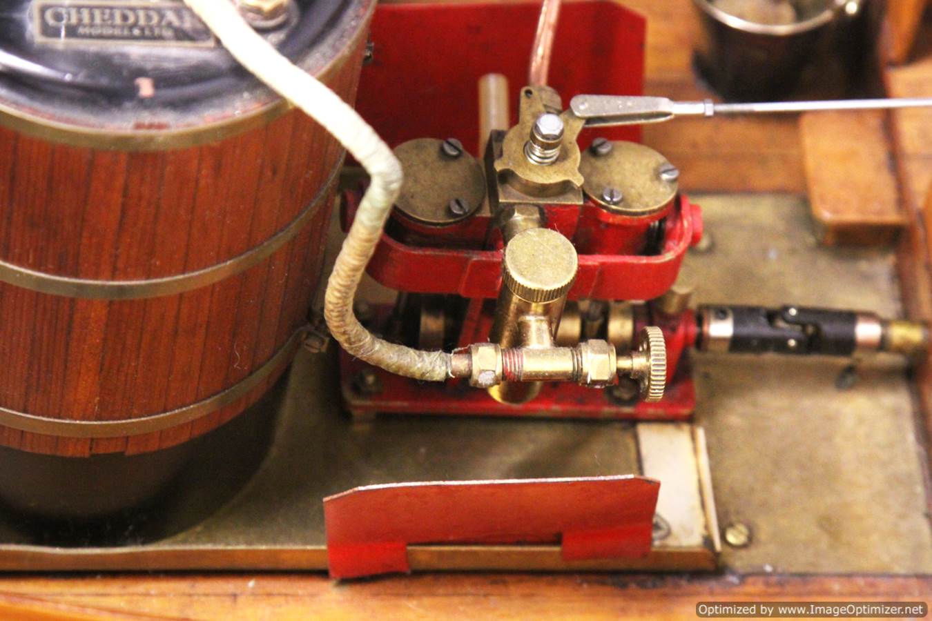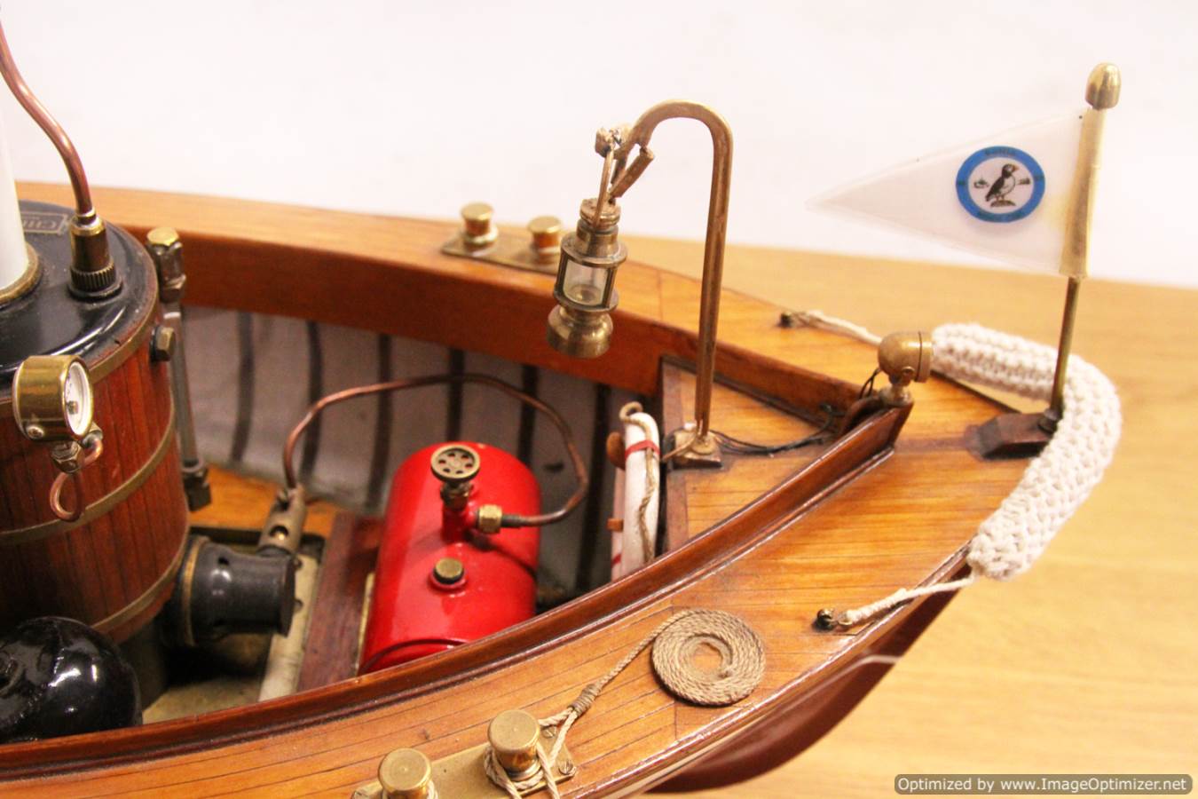 Measuring 35" in length and 13" across the beam, this model is made from a fibreglass hull with a hardwood and balsa wood stained deck, the hull being finished in white and red and lined with black. There is a propane burner situated in the bow of the boat, that feeds the vertical boiler by Cheddar Models. The engine is a Twin cylinder driving a single prop with 4 blade brass propeller. The RC operates servos to control both the regulator and the rudder. This is a nicely detailed model, supplied with a transportable stand, and a boxed Futaba 4YF Control Unit, with previous Boiler Test Certificate Dated 2005 when the model was last played with.