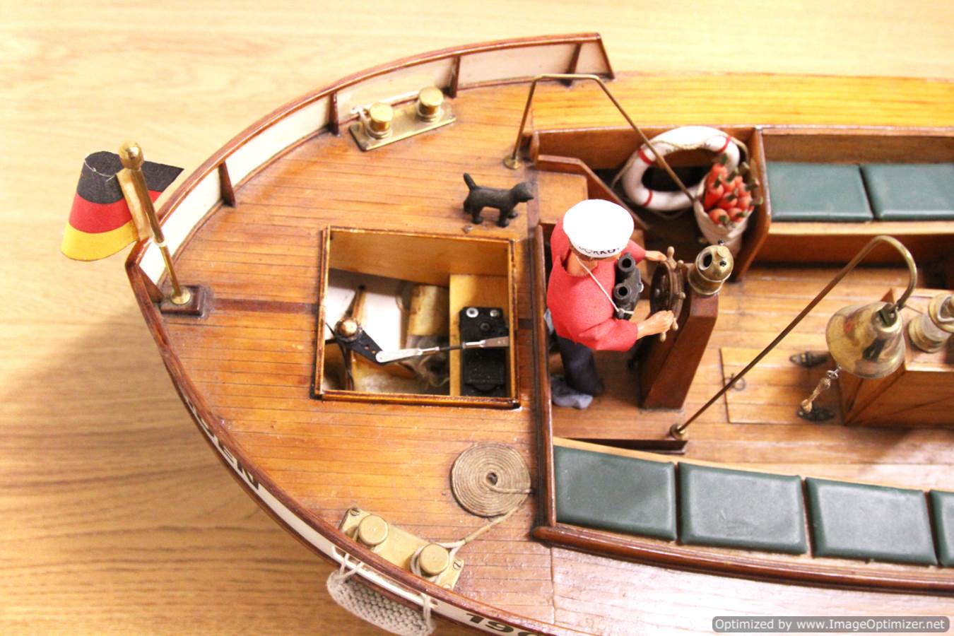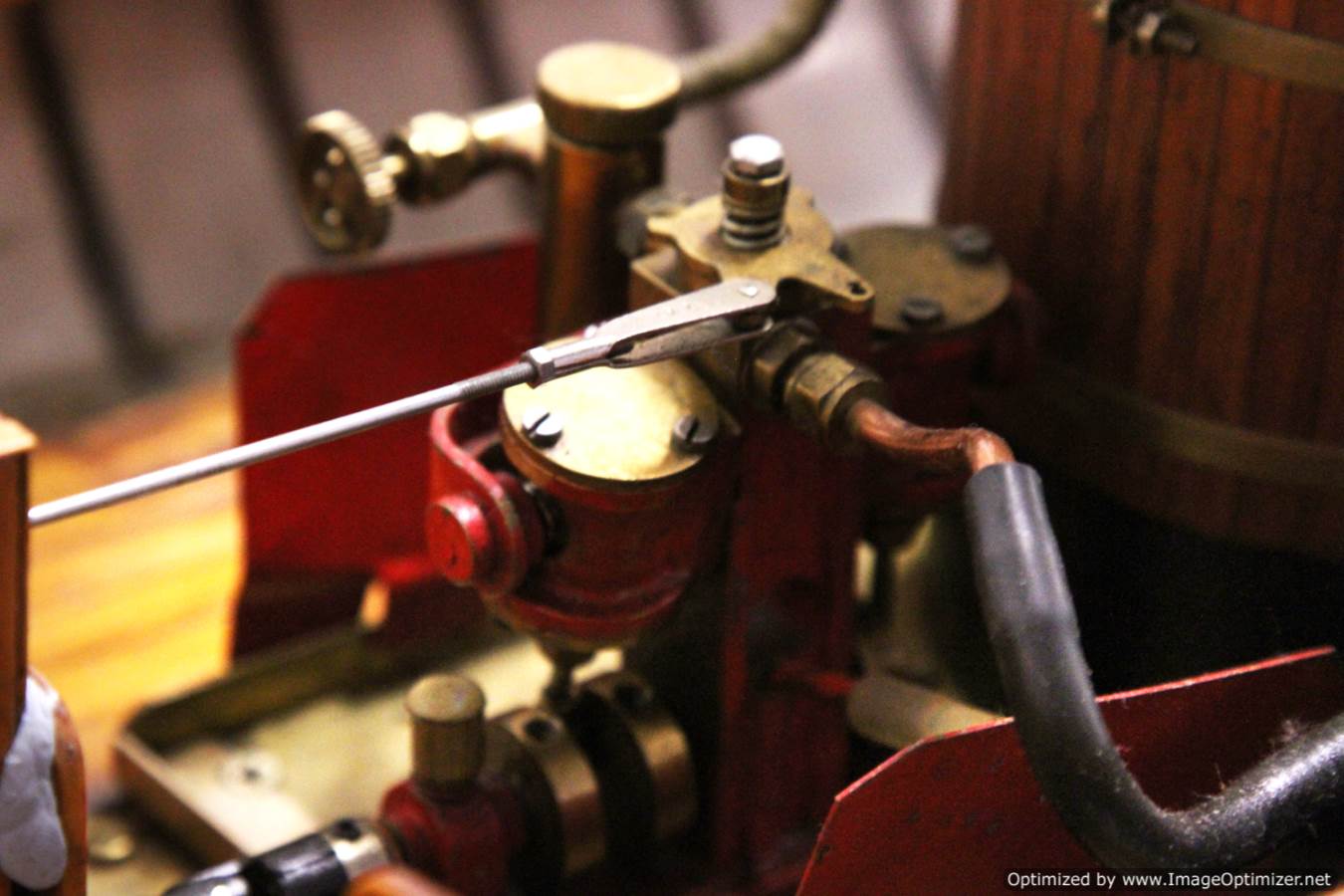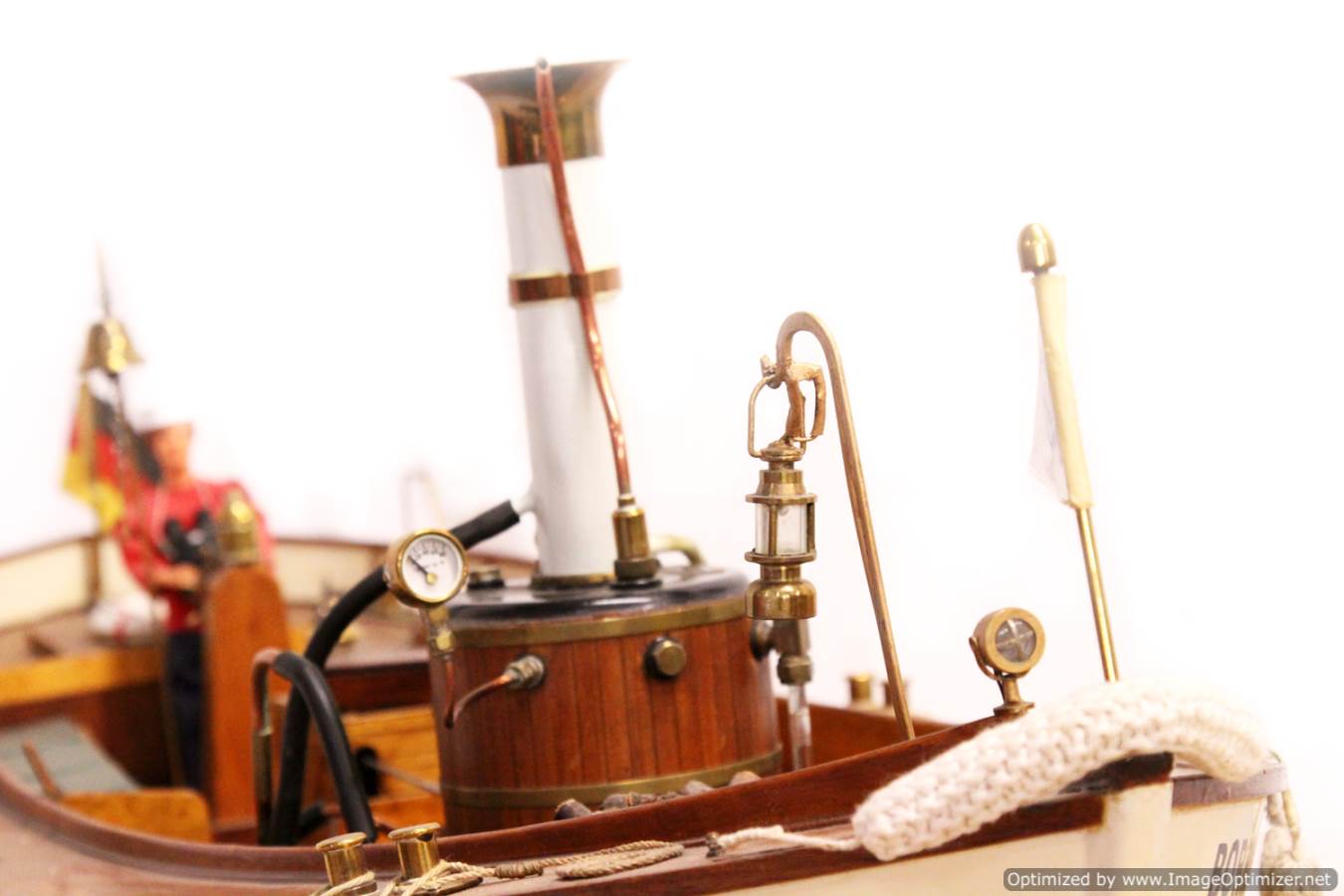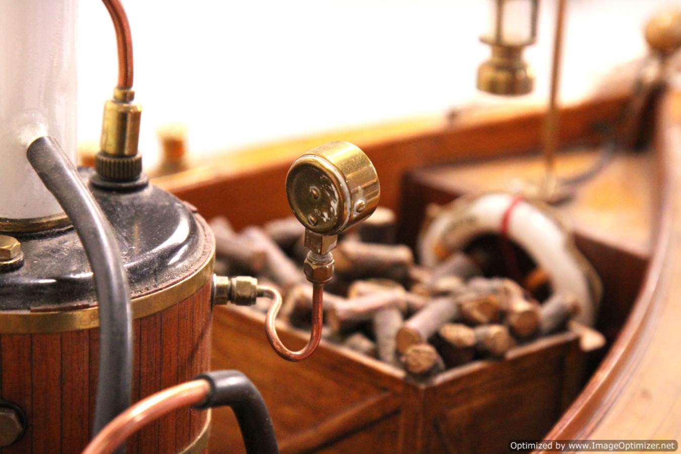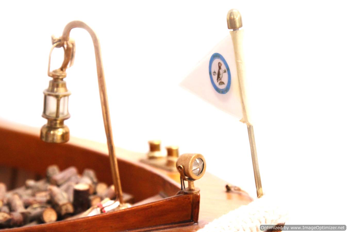 Measuring 35" in length and 13" across the beam, this model is made from a fibreglass hull with a hardwood and balsa wood stained deck, the hull being finished in white and red and lined with black. There is a propane burner situated in the bow of the boat, that feeds the vertical boiler by Cheddar Models. The engine is a Twin cylinder driving a single prop with 4 blade brass propeller. The RC operates servos to control both the regulator and the rudder. This is a nicely detailed model, supplied with a transportable stand, and a boxed Futaba 4YF Control Unit, with previous Boiler Test Certificate Dated 2005 when the model was last played with.