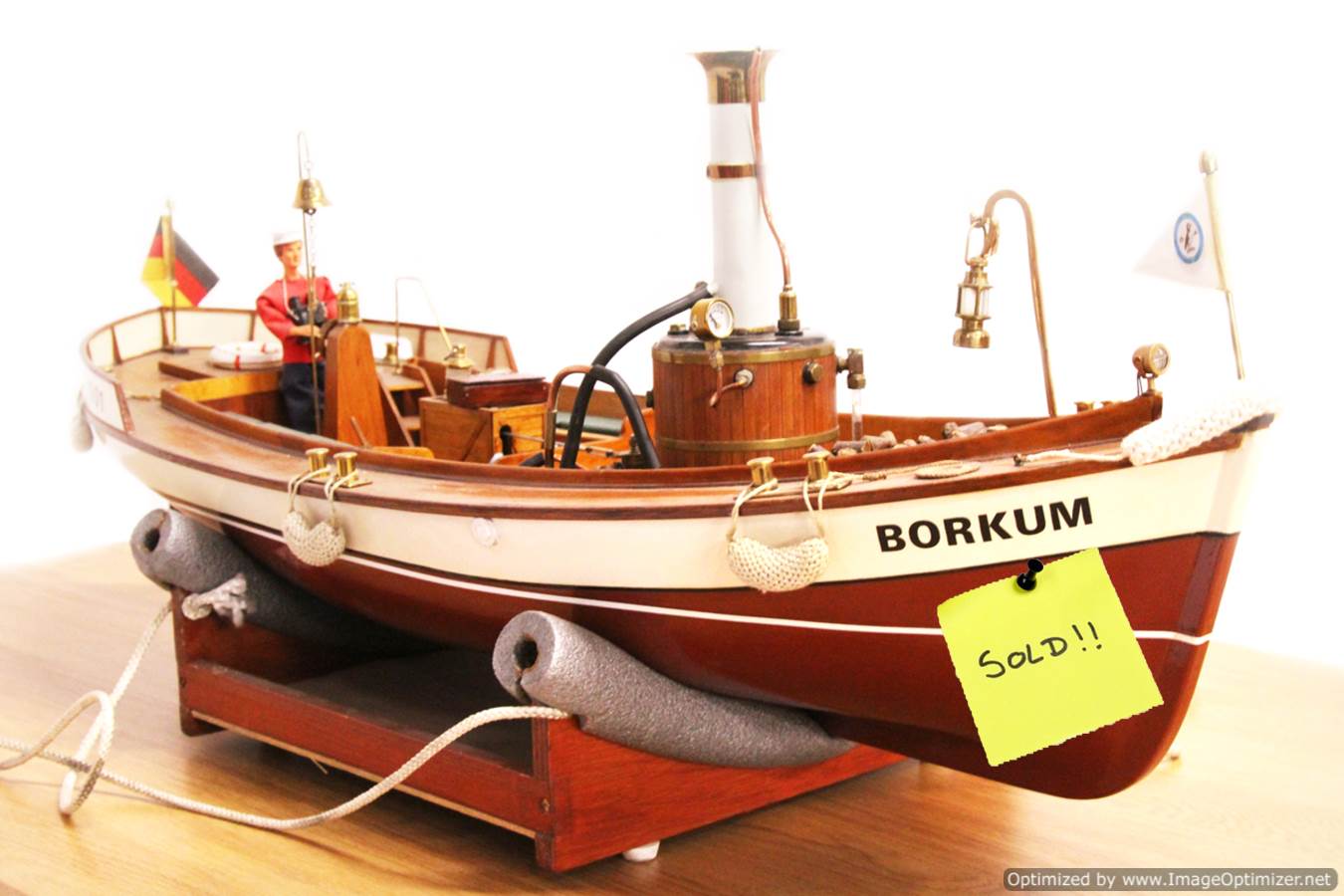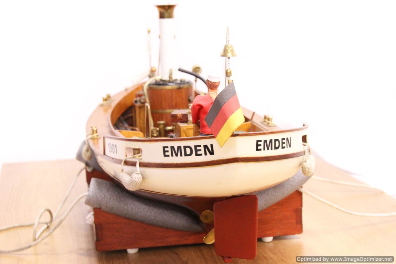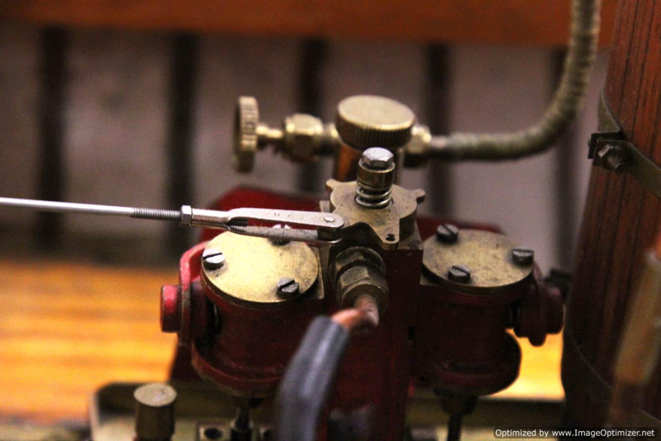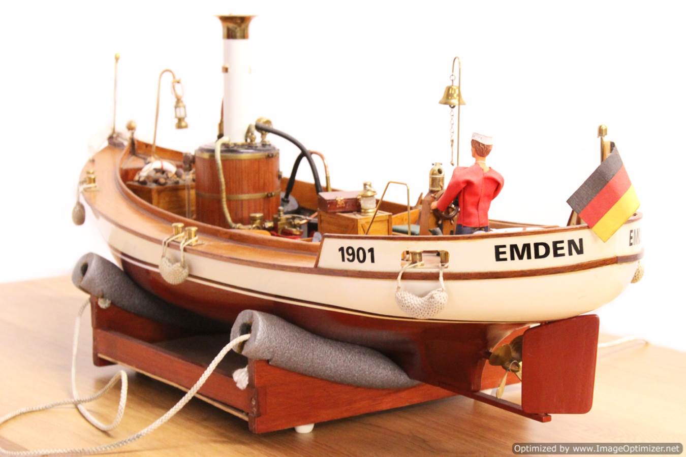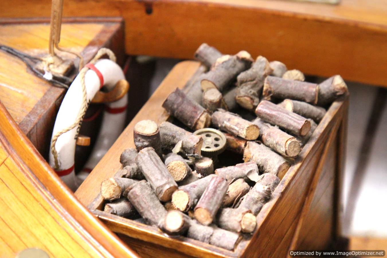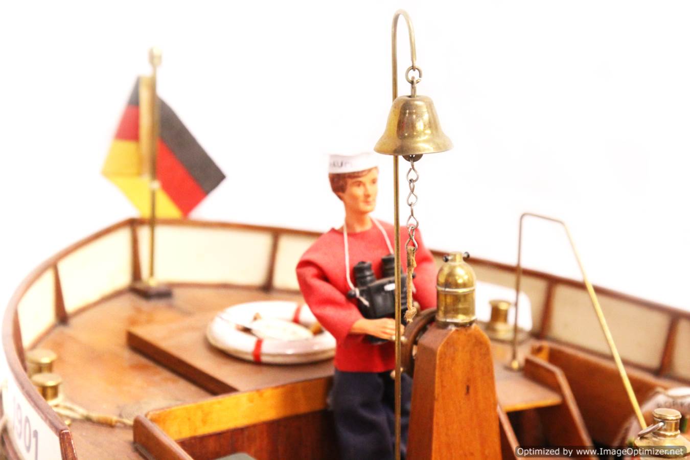 Measuring 35" in length and 13" across the beam, this model is made from a fibreglass hull with a hardwood and balsa wood stained deck, the hull being finished in white and red and lined with black. There is a propane burner situated in the bow of the boat, that feeds the vertical boiler by Cheddar Models. The engine is a Twin cylinder driving a single prop with 4 blade brass propeller. The RC operates servos to control both the regulator and the rudder. This is a nicely detailed model, supplied with a transportable stand, and a boxed Futaba 4YF Control Unit, with previous Boiler Test Certificate Dated 2005 when the model was last played with.