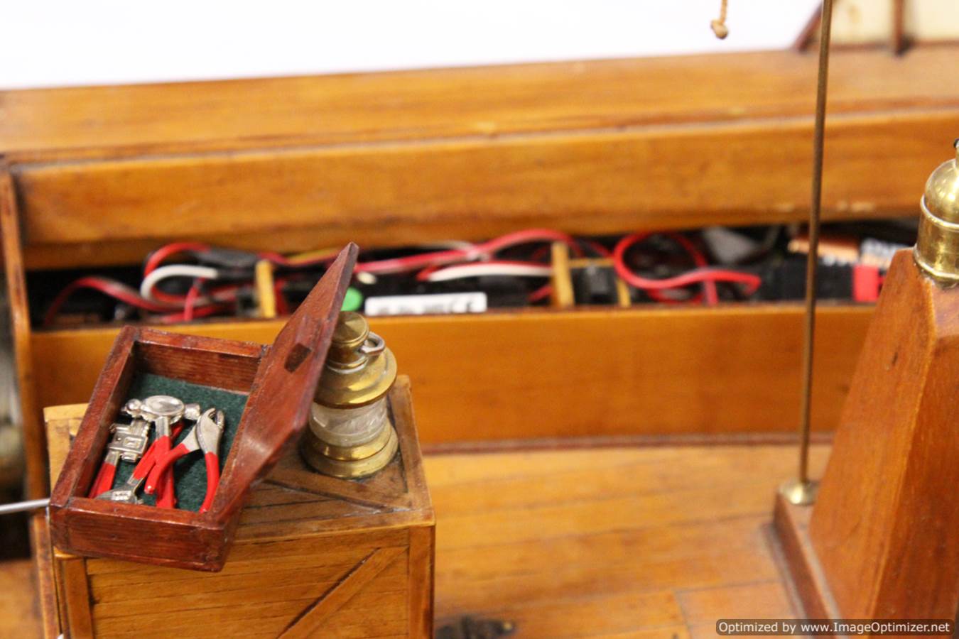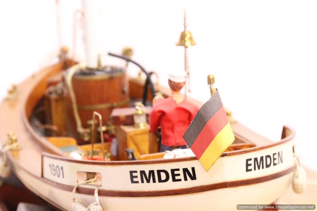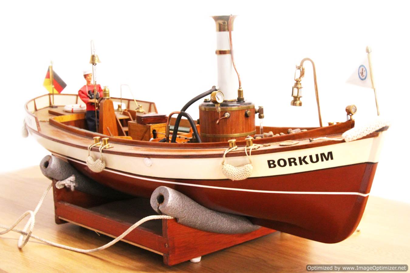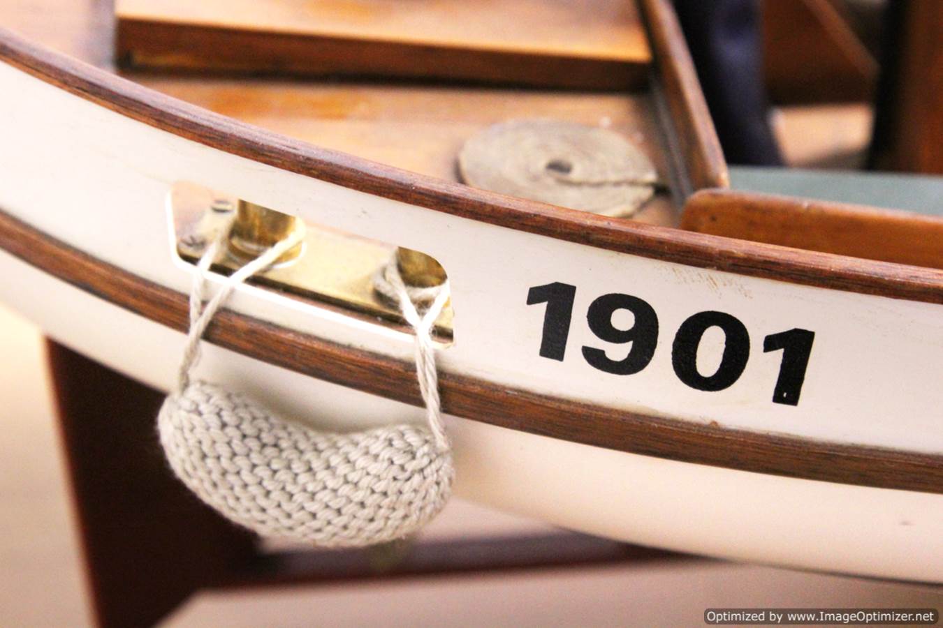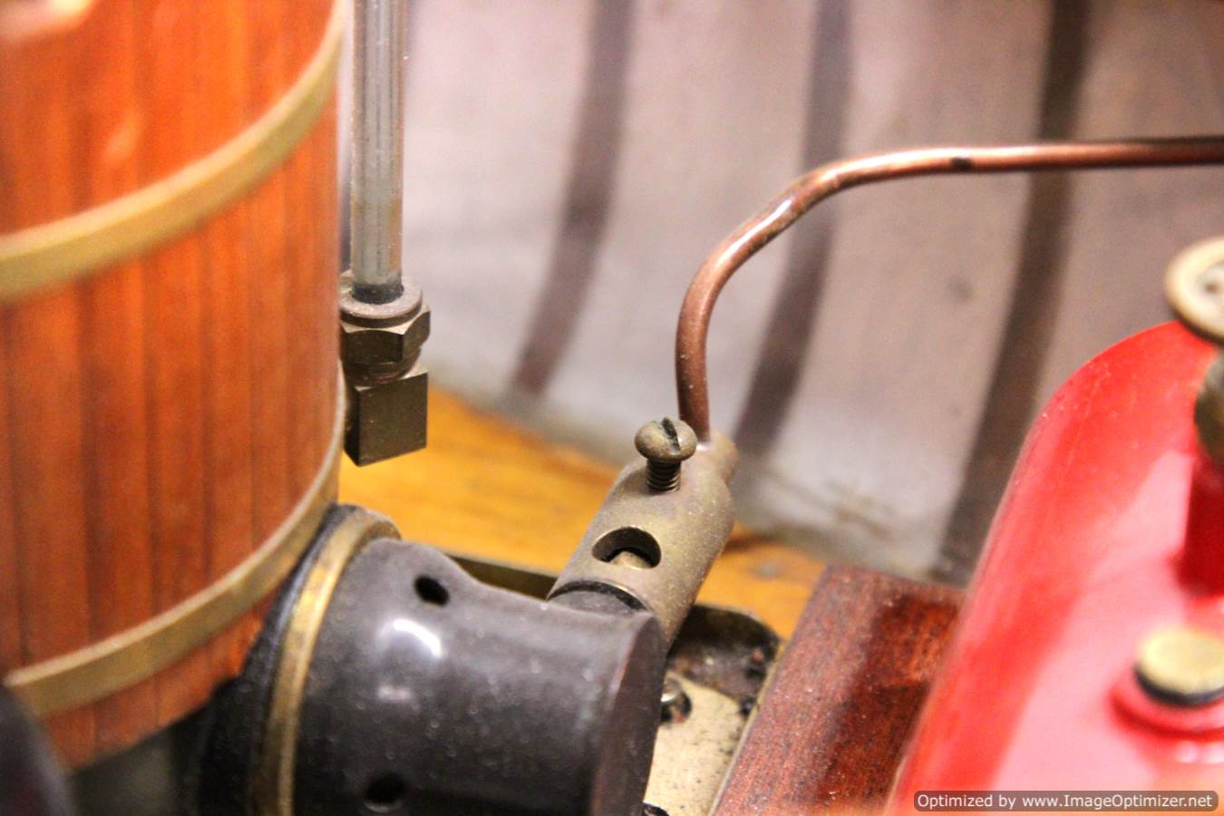 Measuring 35" in length and 13" across the beam, this model is made from a fibreglass hull with a hardwood and balsa wood stained deck, the hull being finished in white and red and lined with black. There is a propane burner situated in the bow of the boat, that feeds the vertical boiler by Cheddar Models. The engine is a Twin cylinder driving a single prop with 4 blade brass propeller. The RC operates servos to control both the regulator and the rudder. This is a nicely detailed model, supplied with a transportable stand, and a boxed Futaba 4YF Control Unit, with previous Boiler Test Certificate Dated 2005 when the model was last played with.