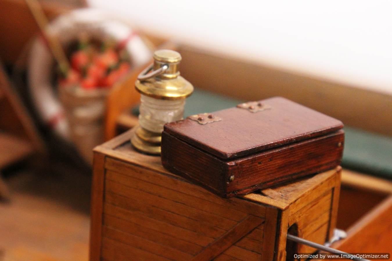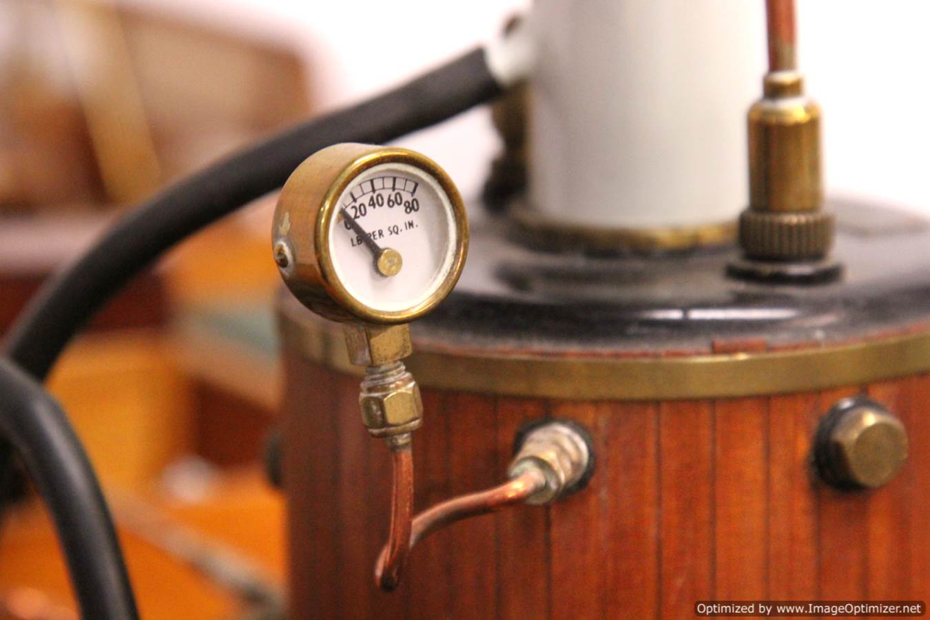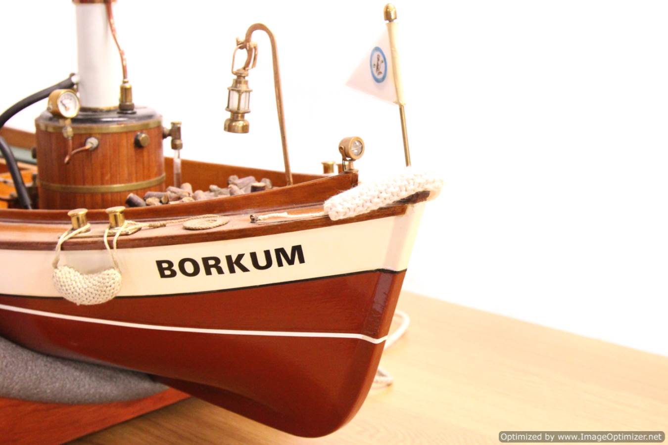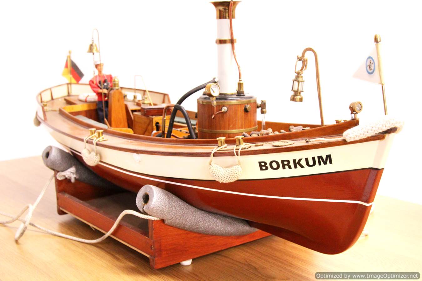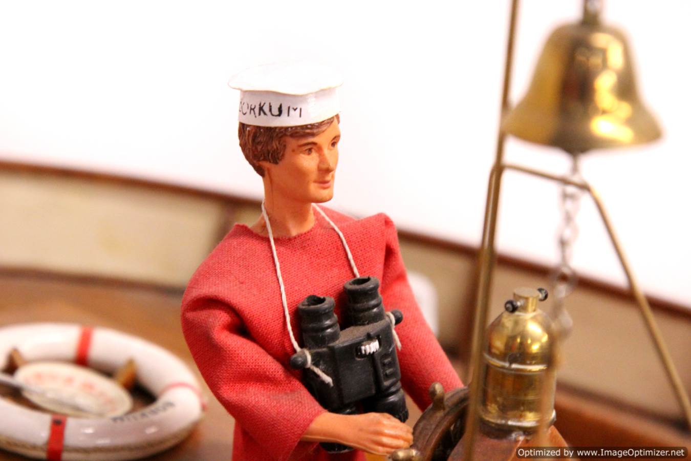 Measuring 35" in length and 13" across the beam, this model is made from a fibreglass hull with a hardwood and balsa wood stained deck, the hull being finished in white and red and lined with black. There is a propane burner situated in the bow of the boat, that feeds the vertical boiler by Cheddar Models. The engine is a Twin cylinder driving a single prop with 4 blade brass propeller. The RC operates servos to control both the regulator and the rudder. This is a nicely detailed model, supplied with a transportable stand, and a boxed Futaba 4YF Control Unit, with previous Boiler Test Certificate Dated 2005 when the model was last played with.